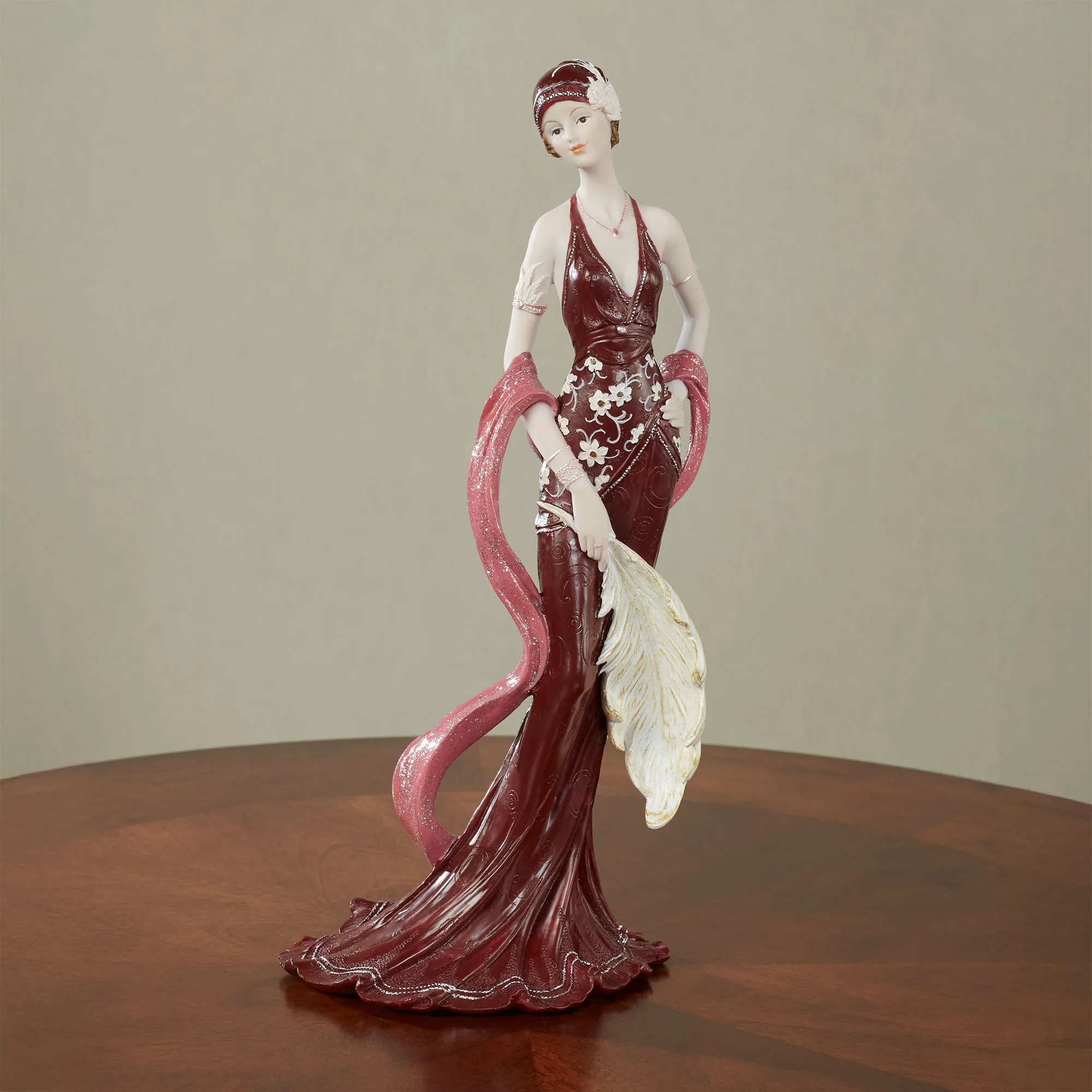 Heads turn to get a better look at the Alluring Beauty standing in a pose that invites attention. This resin lady figurine wears a burgundy gown with floral accents, has a draping glittery sash, and holds a plume in her hand. Measures 6"Wx4"Dx13"H.