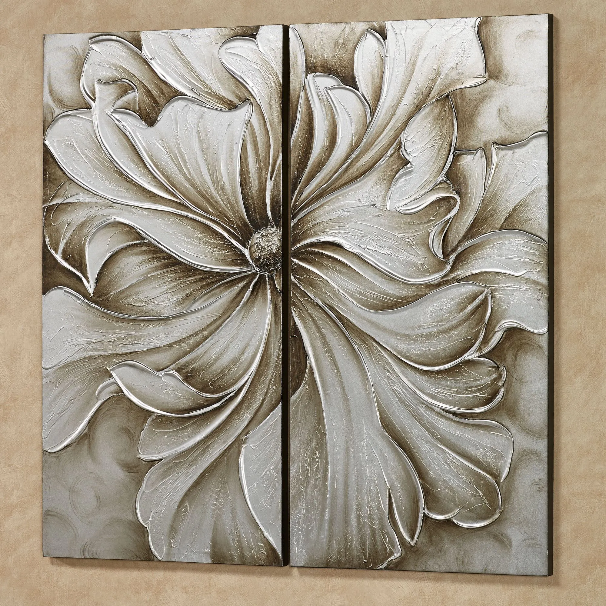 This Alluring Blossom mesmerizes with its magnificent beauty. This handpainted canvas wall art set features a detailed, metallic bloom in platinum and champagne gold. Art is gallery-wrapped over a wood frame. Each floral panel measures 20"Wx1"Dx40"H.