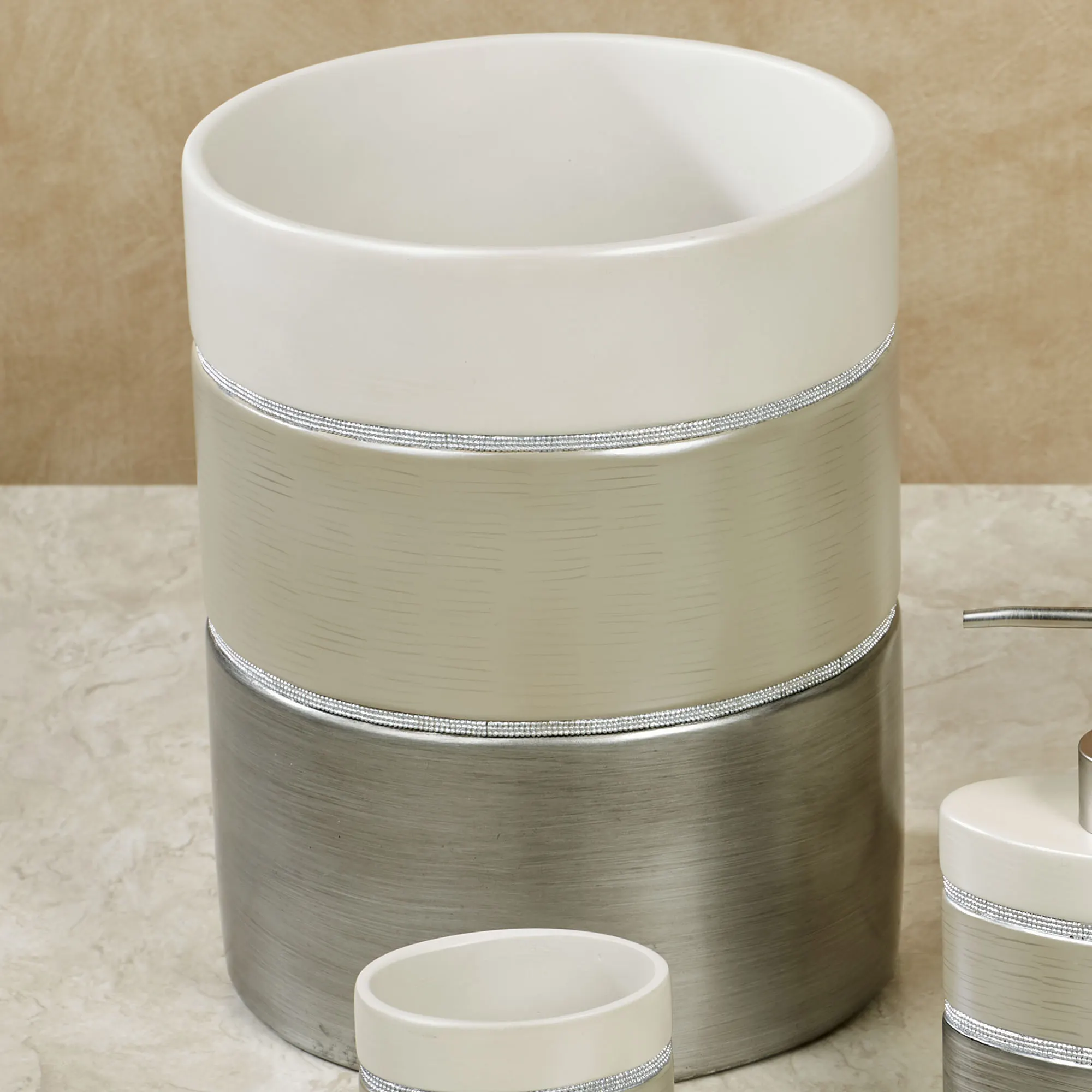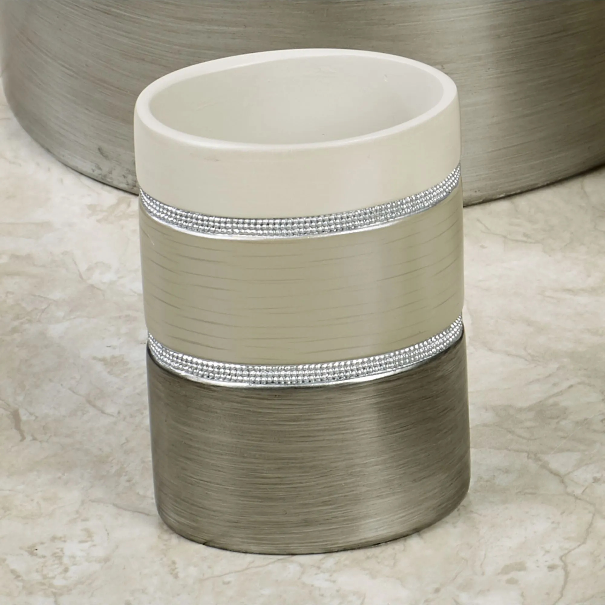 Neutral hues have a stylish appeal within the Alta Bath Accessories. Detailed with silver beaded trim, each pearlescent resin accent features an ecru top, almond middle, and gray bottom. Wastebasket, 8"dia.x10"H, is still available. Tumbler, 3"Wx2.5"Dx4.5"H, is no longer available.