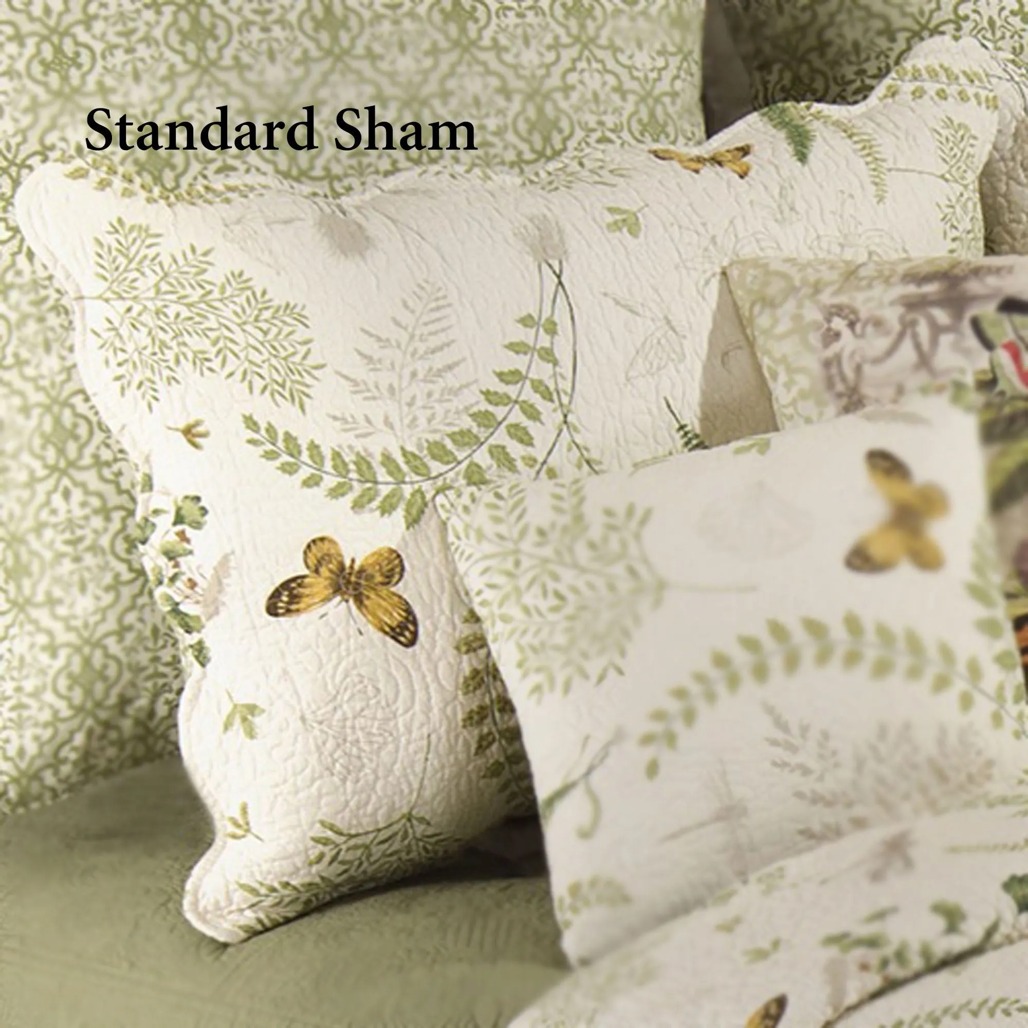 The handcrafted, cotton Althea Butterfly Dragonfly Bedding is inspired by the beauty of spring. Bed Quilt features printed fern fronds, flirty florals, dragonflies, and butterfly accents on a vermicelli-quilted eggshell background. Colors include shades of green, gray, golden yellow, chocolate, and eggshell. Scalloped edges are bound. The vermicelli-quilted back has a moss medallion pattern on eggshell. Quilt fill is cotton. Quilt is machine washable. Imported.