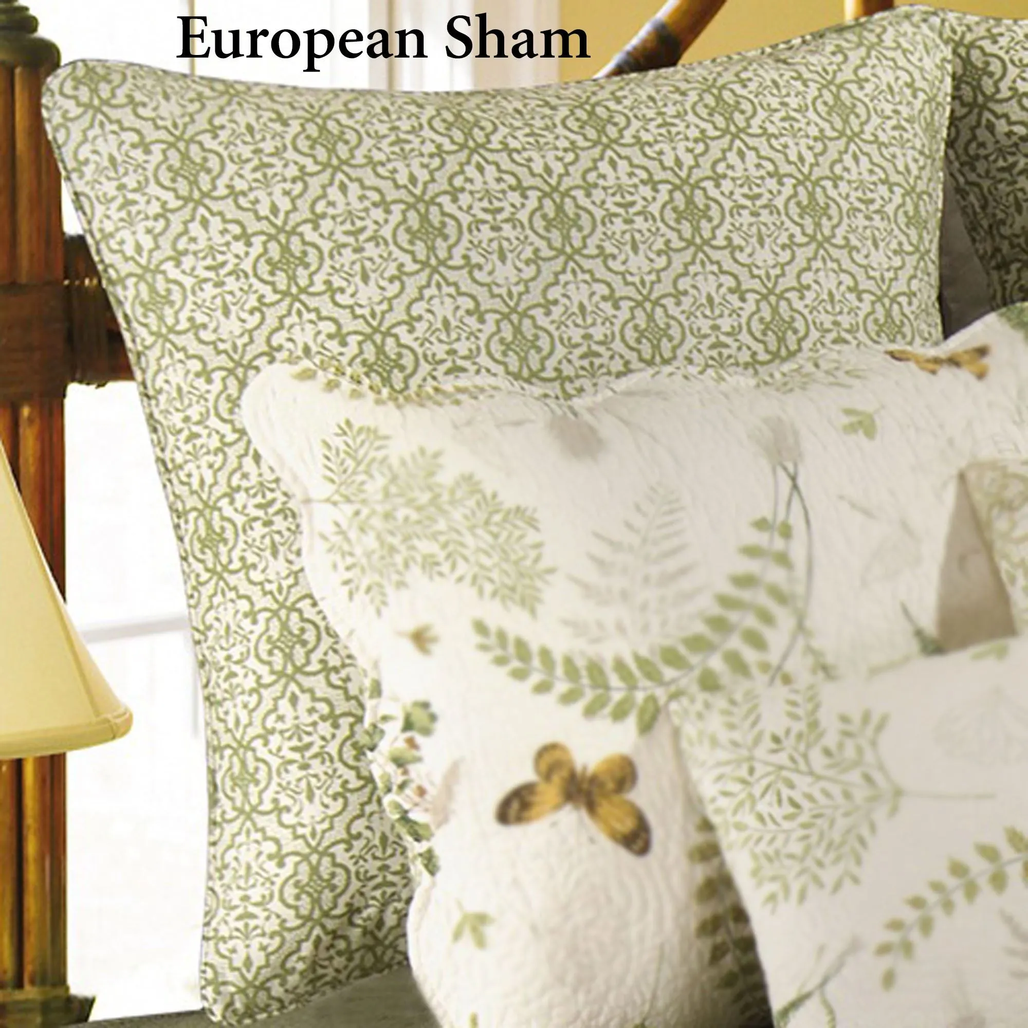 Piped European Sham has a printed, moss green scroll medallion pattern on eggshell; zipper closure.