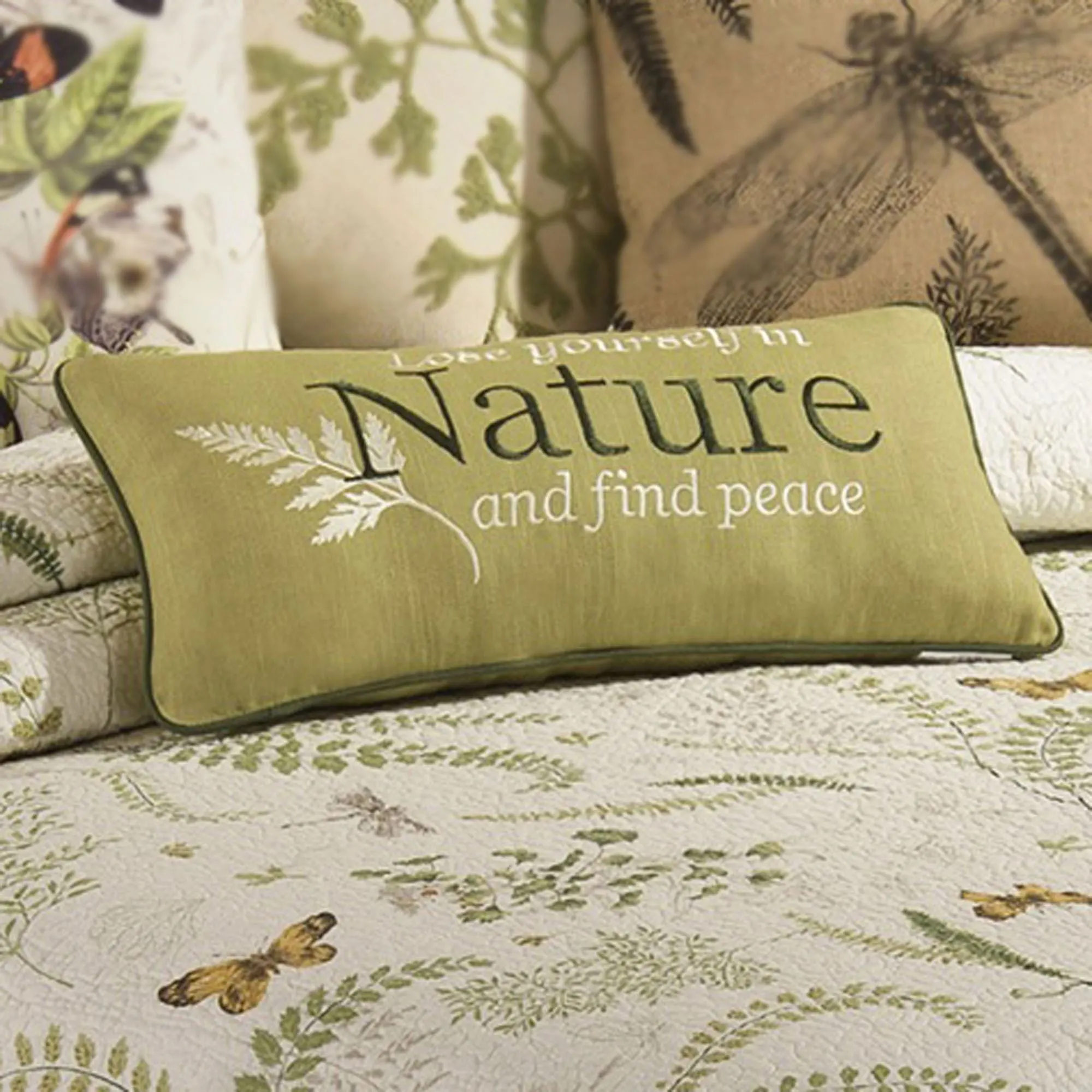 Pillows have polyester fill. Spot clean. All are Imported/USA except the Tailored Rectangle. Linen/cotton Embroidered Rectangle has the words "Lose yourself in Nature and find peace" and leaf embroidery on a fern-colored ground; piping outlines edges. The reversible Quilted Face Square mimics the quilt and has a butterfly and fern print on the back. The jute Tailored Rectangle has a printed dragonfly and leaf motif in chocolate on tan; zipper closure. Hooked Square has a hooked green leaf motif on a linen-colored background; zipper closure. Tailored Square has a screen-printed design with butterflies, florals, and scrolls in black, orange, yellow, brown, gray, green, and blue on eggshell; zipper closure.