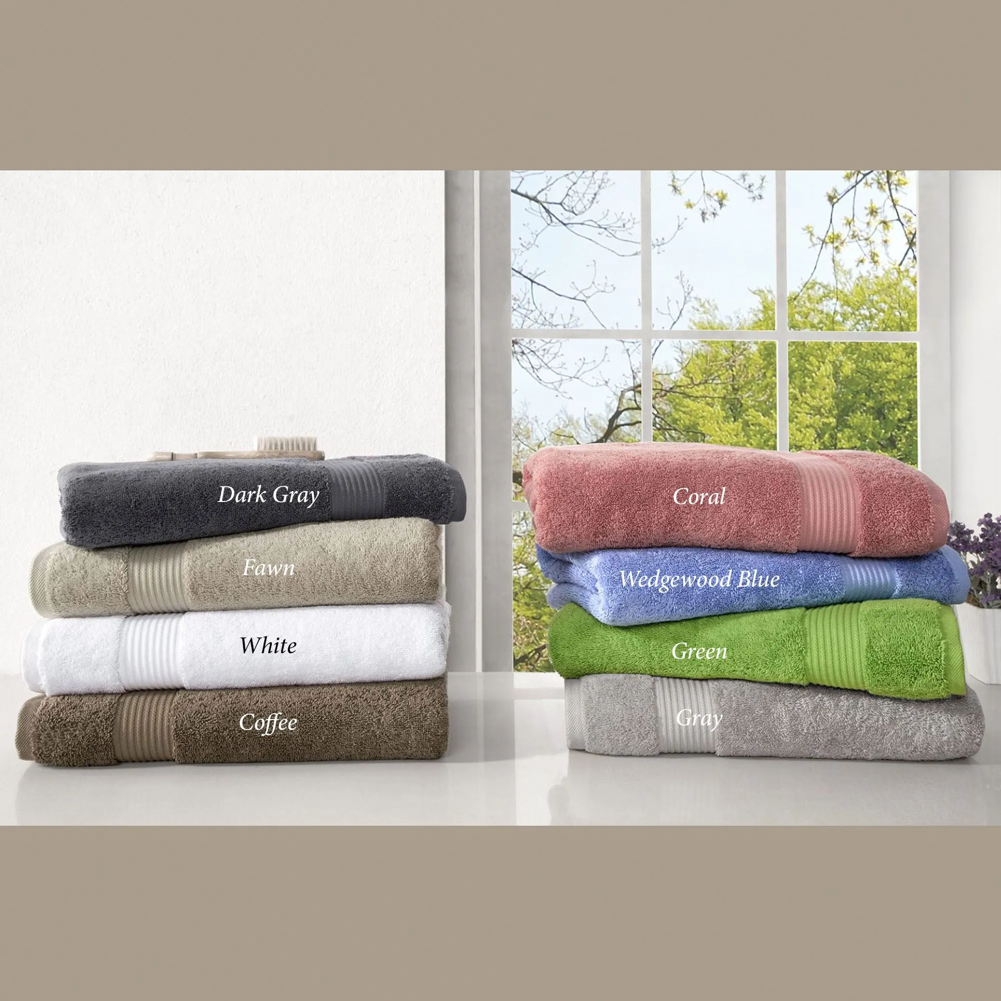 Add the perfect touch to your daily routine with the Amadeus Bath Towel Set. With a solid color 650 GSM design, each pure ringspun cotton towel features a charming ribbed accent band and double-stitched long sides. The 6-piece towel set includes 2 bath towels, 30"x54" each; 2 hand towels, 16"x27" each; and 2 washcloths, 12" sq. each. The towels are OEKO-TEX(R) certified, which ensures a lack of harmful chemicals, making them safe for the whole family. Specify Coffee, Coral, Dark Gray, Fawn, Gray, Green, Wedgewood Blue, or White. Machine washable. Imported.