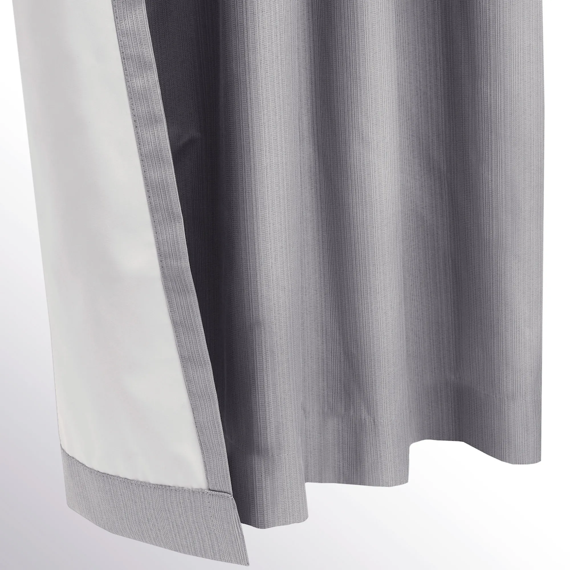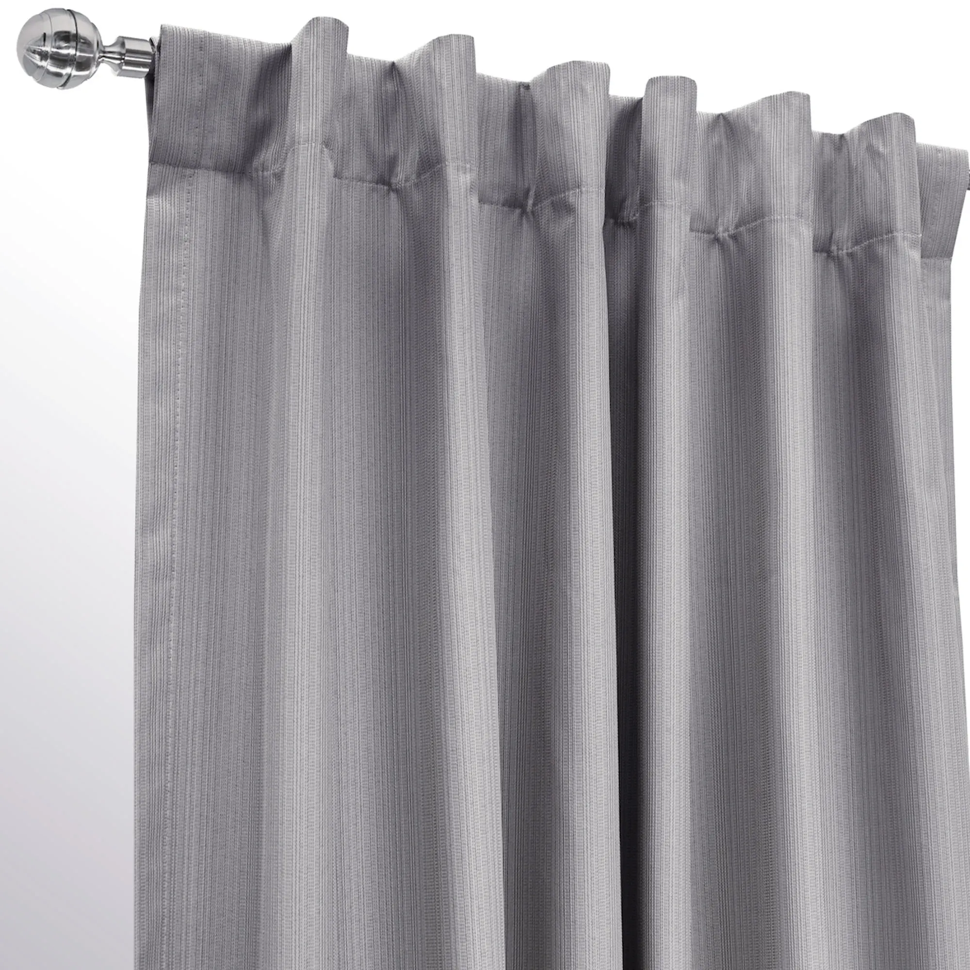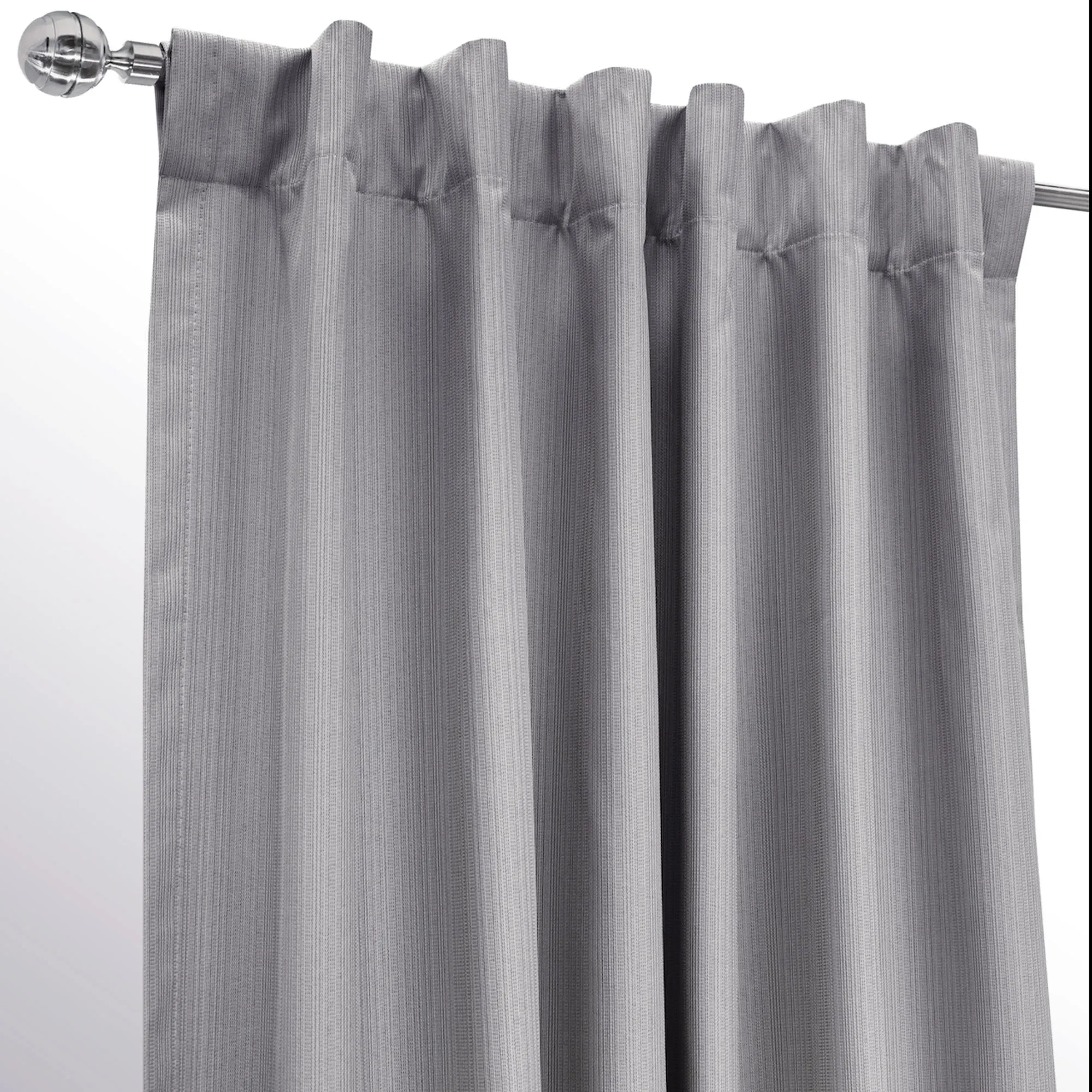 The Amapolo Thermaplus(TM) Curtain Panel looks perfect in a modern home. Made of polyester, this insulated gray window panel is energy-efficient and provides 100% blackout. The panel has a thin vertical linear texture and Thermafoam(TM) insulation. May hang with the 3"L back tabs or the 3" rod pocket. Backing is rayon/polyester. Sold individually, each panel is 52"W. Machine washable. Imported.
