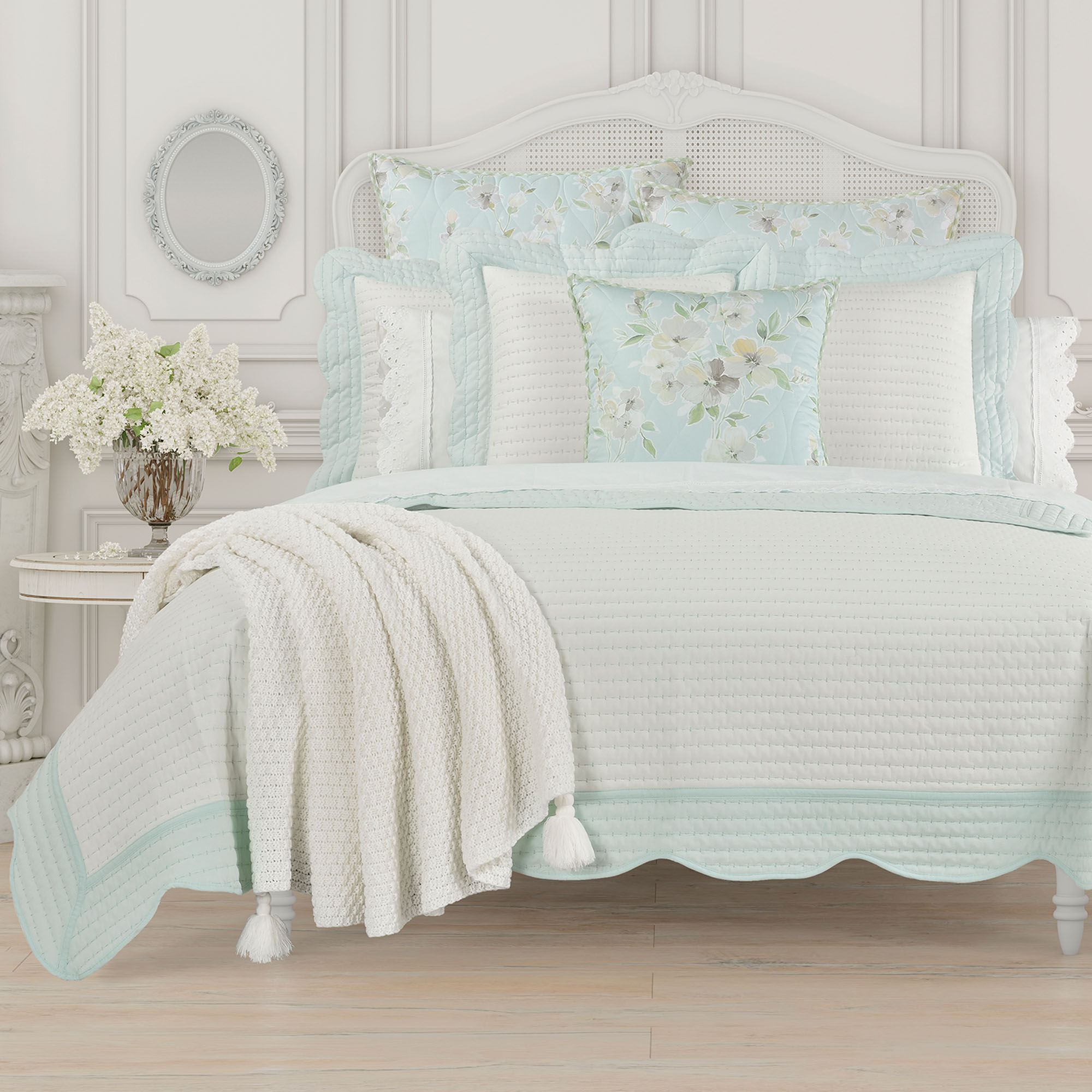 Sweeten your bedroom decor with the Amherst Quilt from J. Queen Cottage. Crafted from pre-washed and preshrunk cotton, the quilt features crisp white framed with pale blue scalloped, bound edges in a flanged effect. Quilt has channel quilting and is backed in a coordinating solid color cotton. Fill is polyester. Machine washable. Imported. Sorry, some items shown are no longer available.