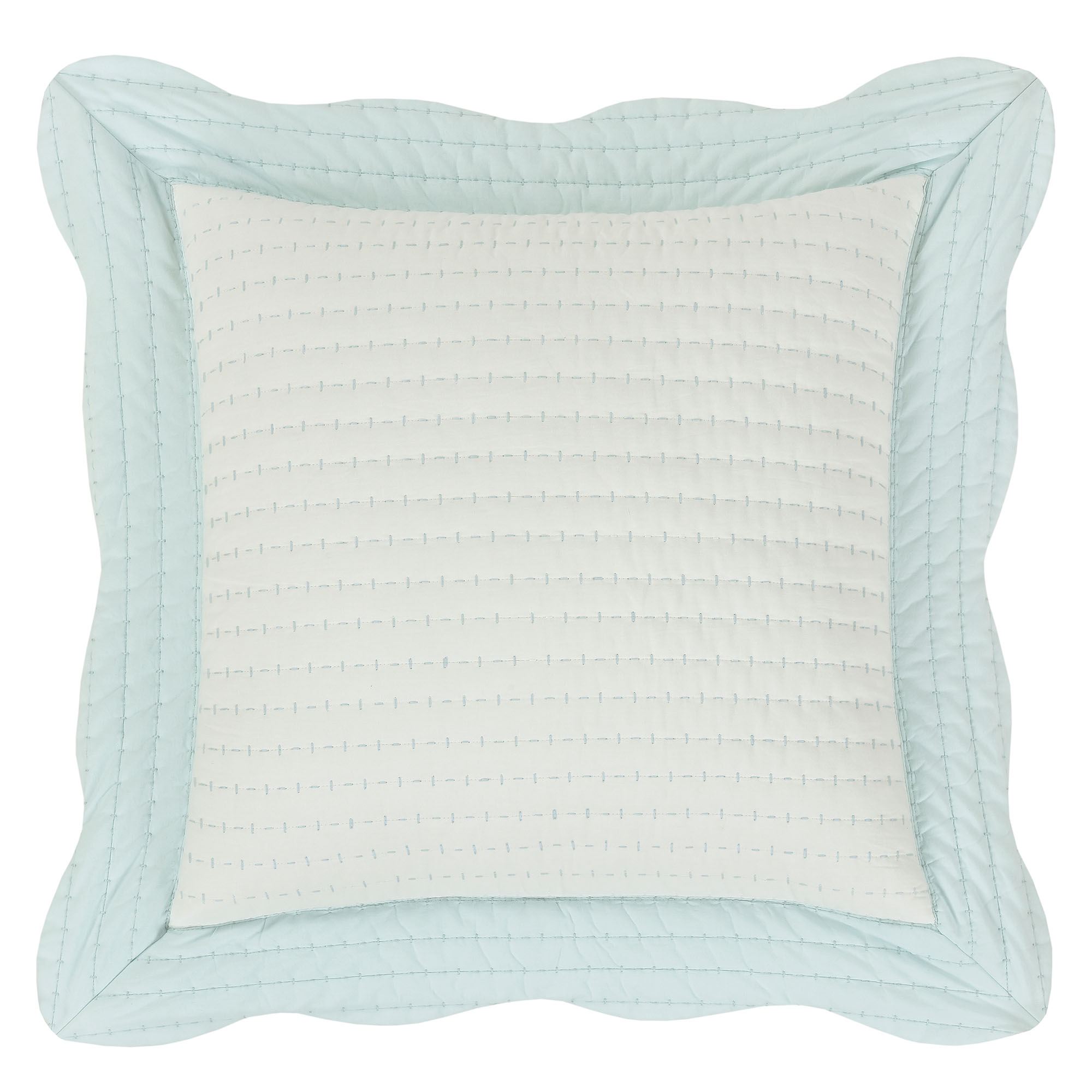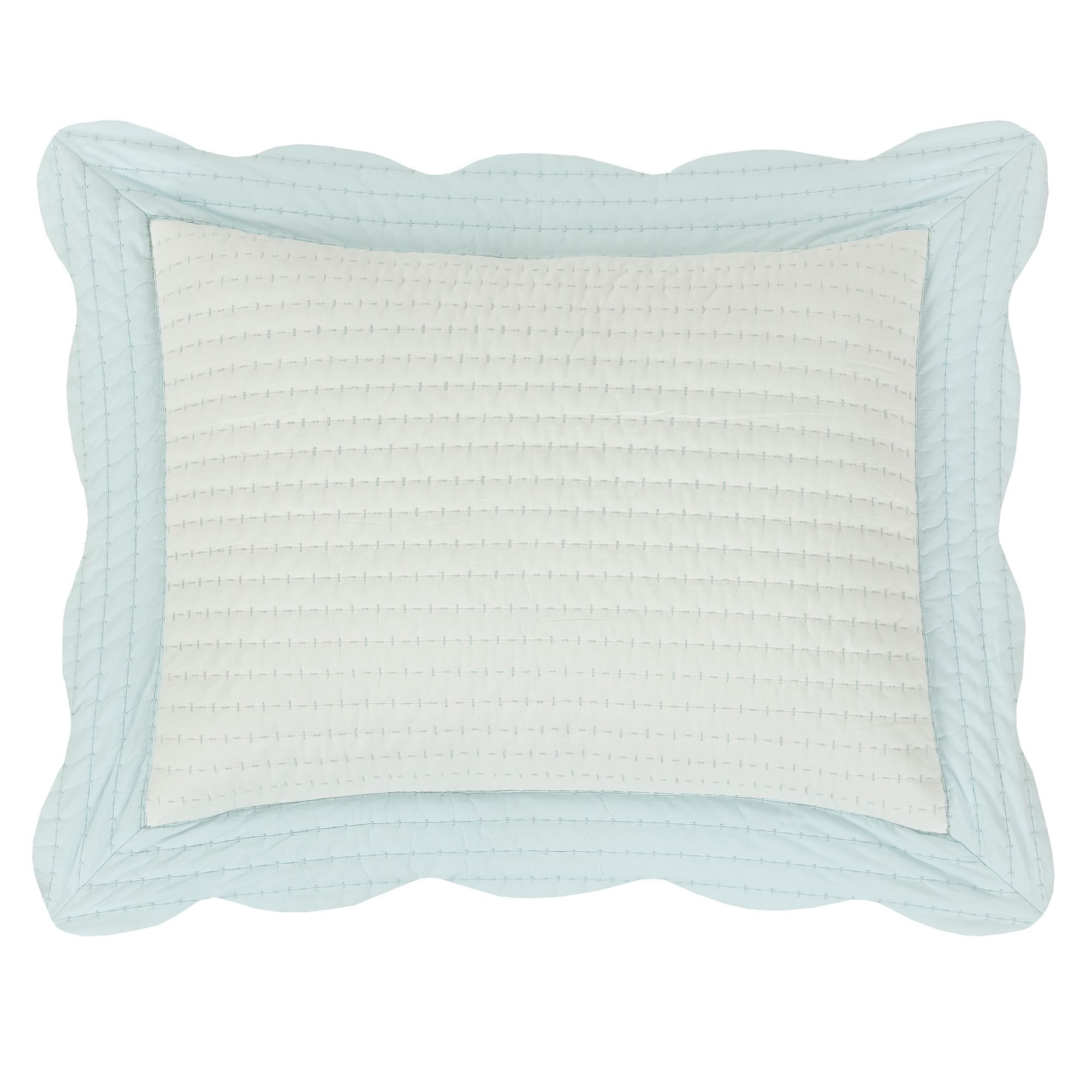 Charm your senses with the sweet Amherst Bedding from J. Queen Cottage. Crafted from pre-washed and preshrunk cotton, the channel-quilted ensemble features crisp white expanses framed with solid pale blue scalloped, bound edges in a flanged effect.
