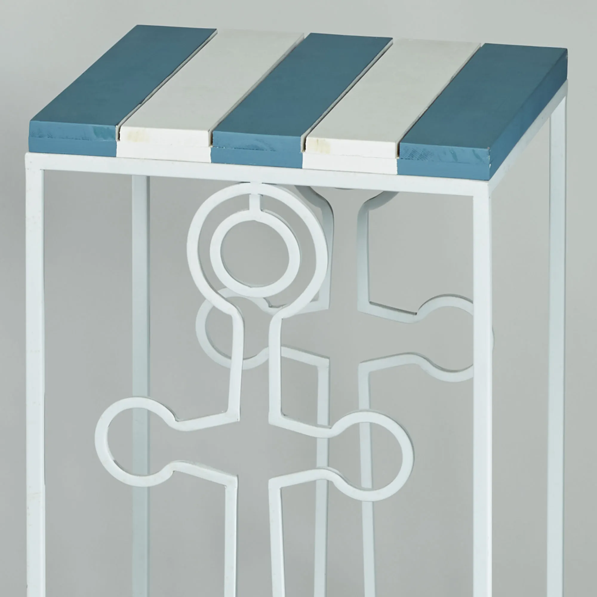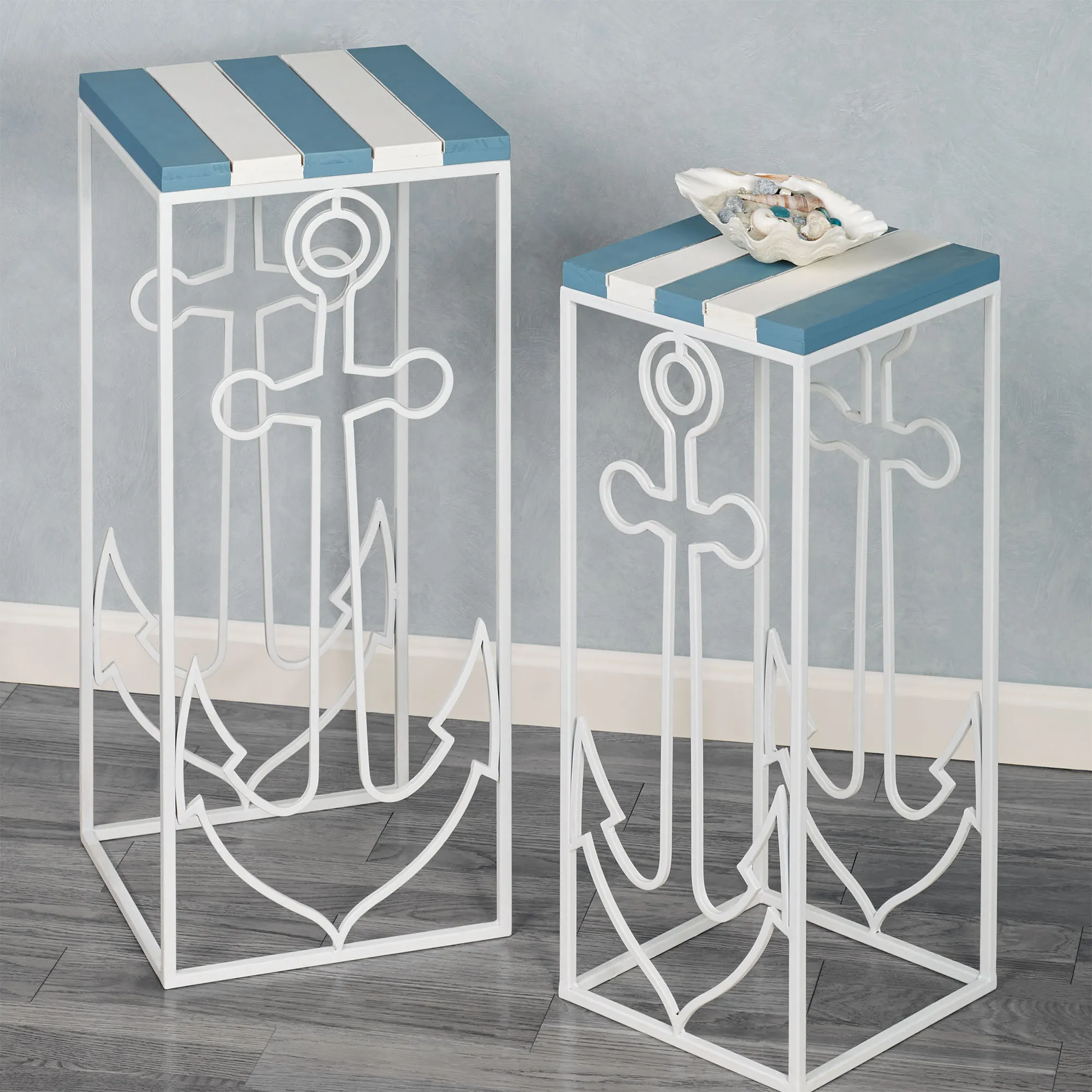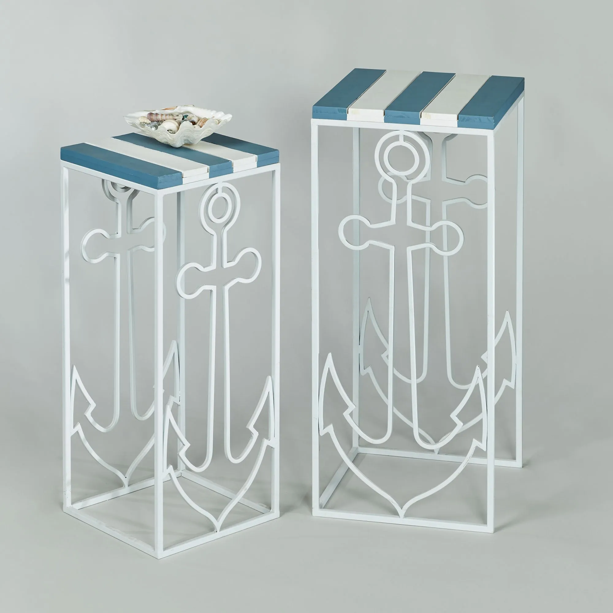 If your room needs nautical style, decorate with the Anchor Pedestal Table Set. These seaworthy tables have a slat wood top in alternating shades of medium blue and white, and the white metal frame has an openwork anchor design on both sides. Tables nest neatly for storage. Small is 11"sq.x27"H; large is 13"sq.x30"H. Set weighs 13 lbs.