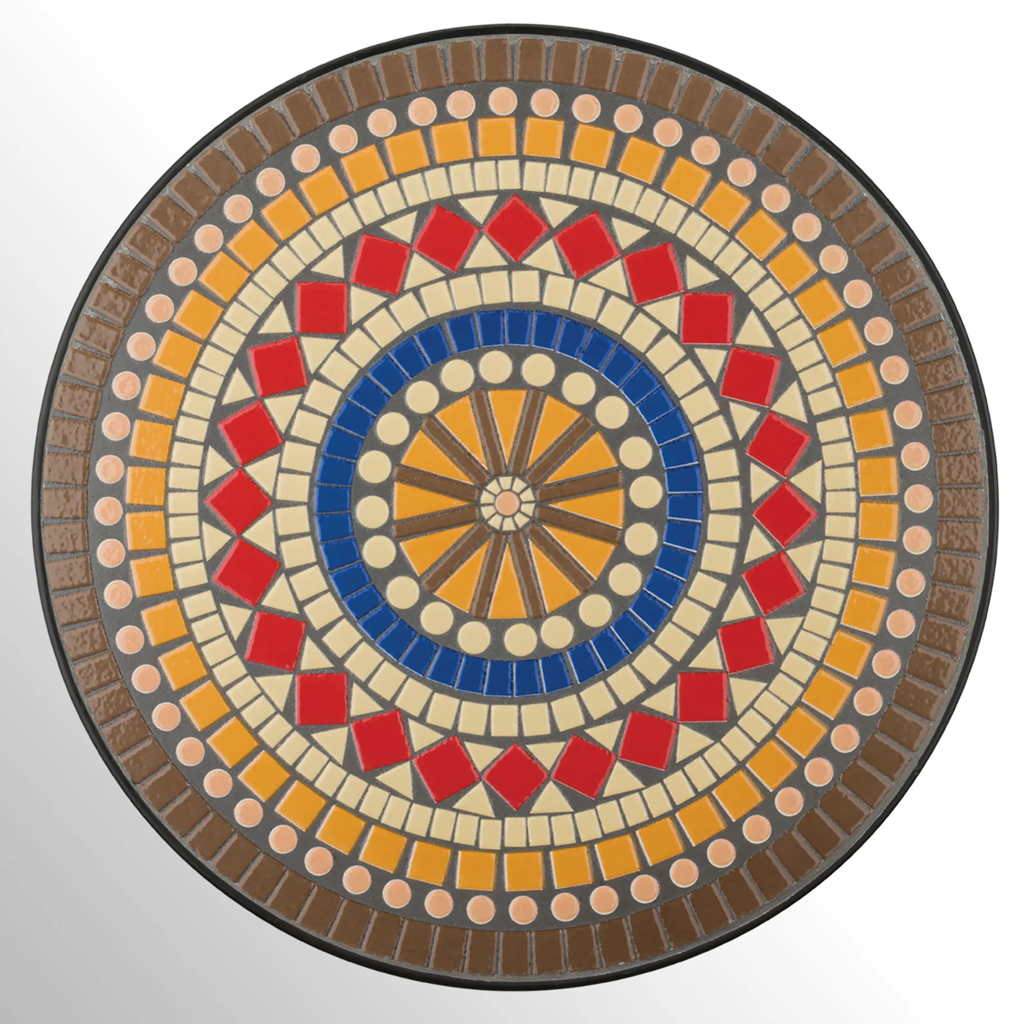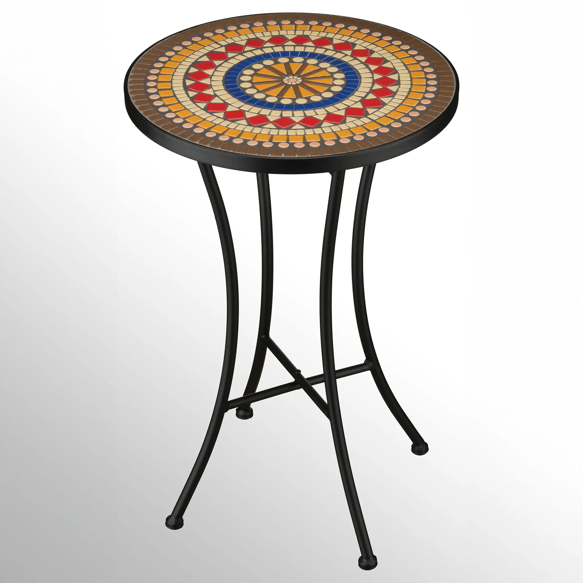 A colorful design adds beauty to the Anderson Outdoor Accent Table. Colors of brown, gold, ivory, red, blue, and black create the pretty mosaic motif on the weighted ceramic top. Black tubular metal legs provide a durable base. The multipurpose table can be used as a side table or plant stand. Indoor or outdoor year-round use. Measures 14"dia.x21"H.