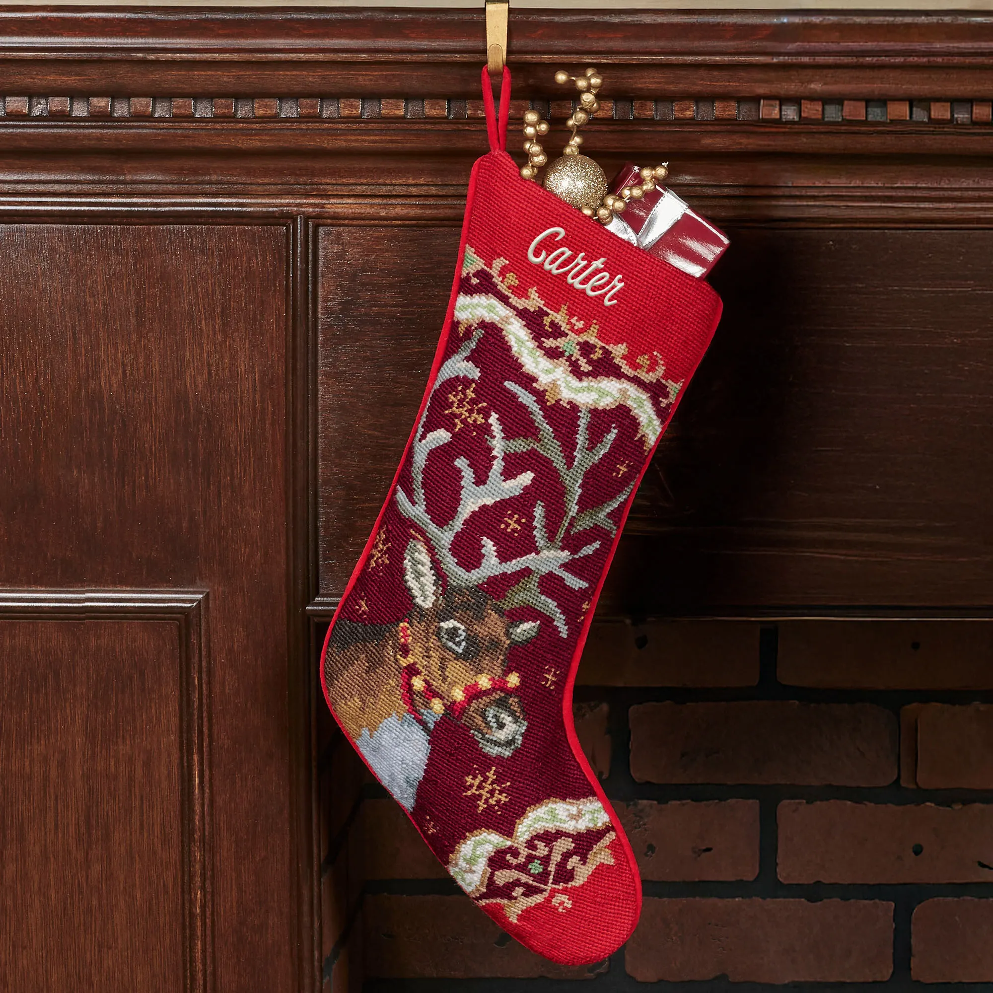 The Christmas Charm Needlepoint Stockings are perfect for your holiday treats. These handmade, cotton velvet stockings have wool needlepoint designs on cotton canvas. Use the attached red loop for hanging. Angel releases white doves with a deer nearby. Christmas Tree has ornaments, gifts, and a white dove. Reindeer has long antlers. Santa Claus holds a present and candy canes next to a bag of presents. Toy Soldier stands tall in front of a tree amid toys. Personalization is available, as shown, for FREE! Click on the burgundy "i" icon below the item name for more information. Stockings are sold individually; each is 7.5"x17". Dry clean only. Imported.