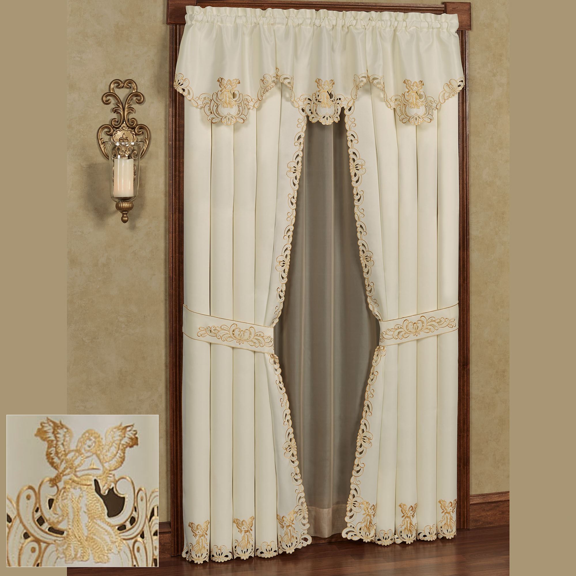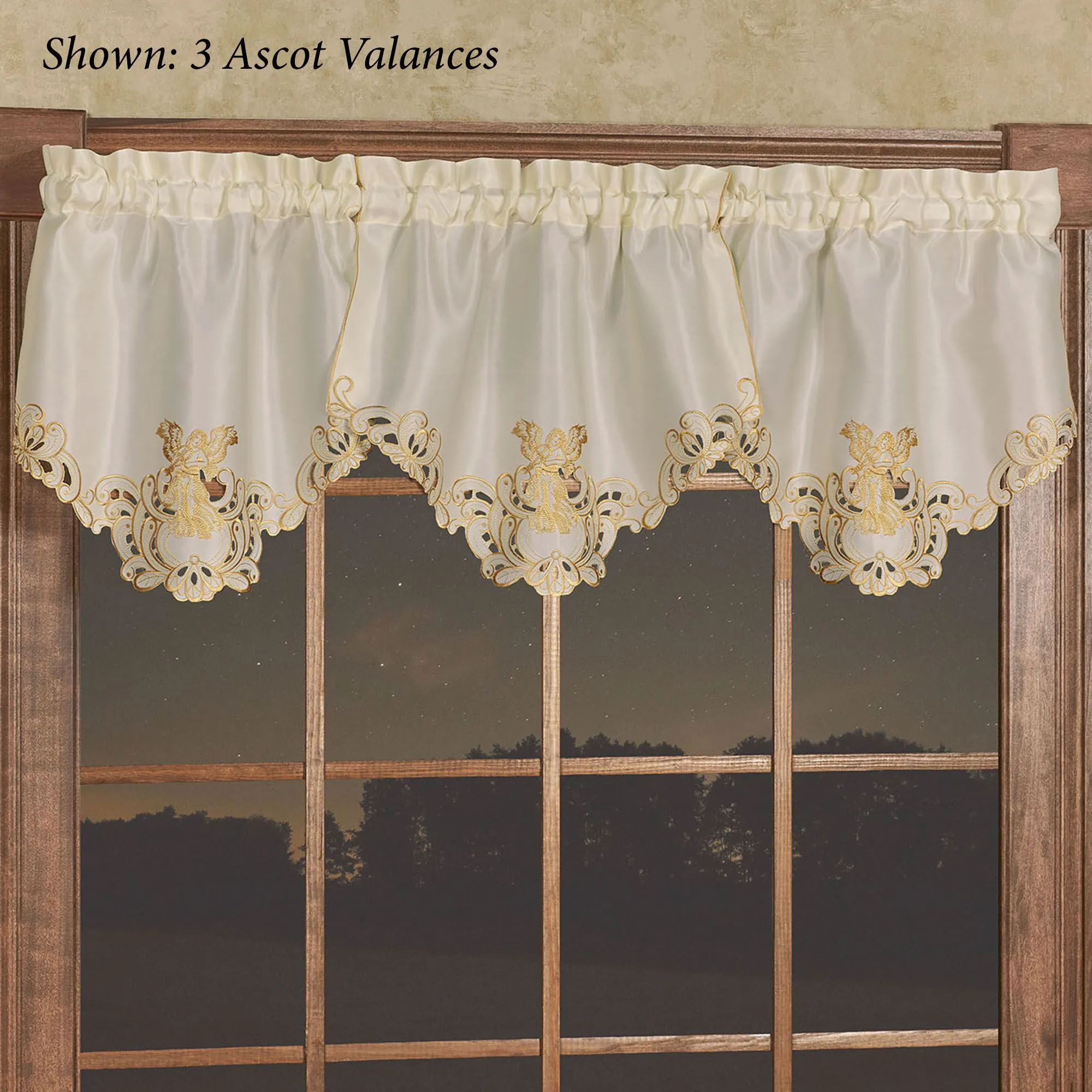 Bless your view with the shimmering sparkle of the Angelica Window Treatment. With beautiful scrolling cutwork edges, the ivory polyester satin window accents feature metallic gold embroidery. Heavenly angels grace the designs with lovely spread wings. Rod pockets measure 1.75". Specify Ascot Valance or Curtain Pair. Ascot Valance is 24"Wx18"L. Curtain Pair includes embroidered tiebacks; measures 84"Wx84"L. Machine washable. Imported. The curtain pair width is the total width of two panels together.