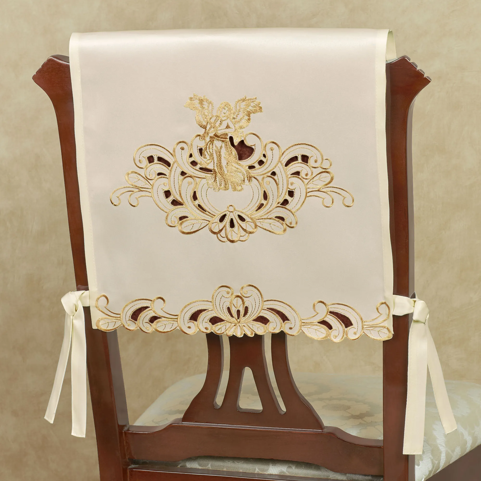 Bless your table with the shimmering sparkle of the Angelica Chair Cover Set. With beautiful scrollwork cutwork ends, the ivory polyester satin chair covers feature metallic gold embroidery. A heavenly angel graces each design with lovely spread wings. With 10" ties, each measures 16"Wx16"L when styled on a chair. Machine washable. Imported.