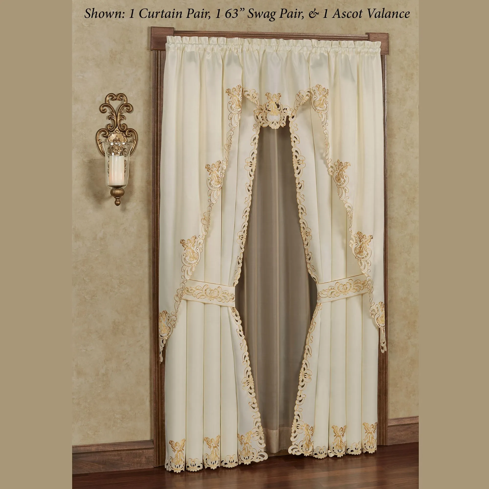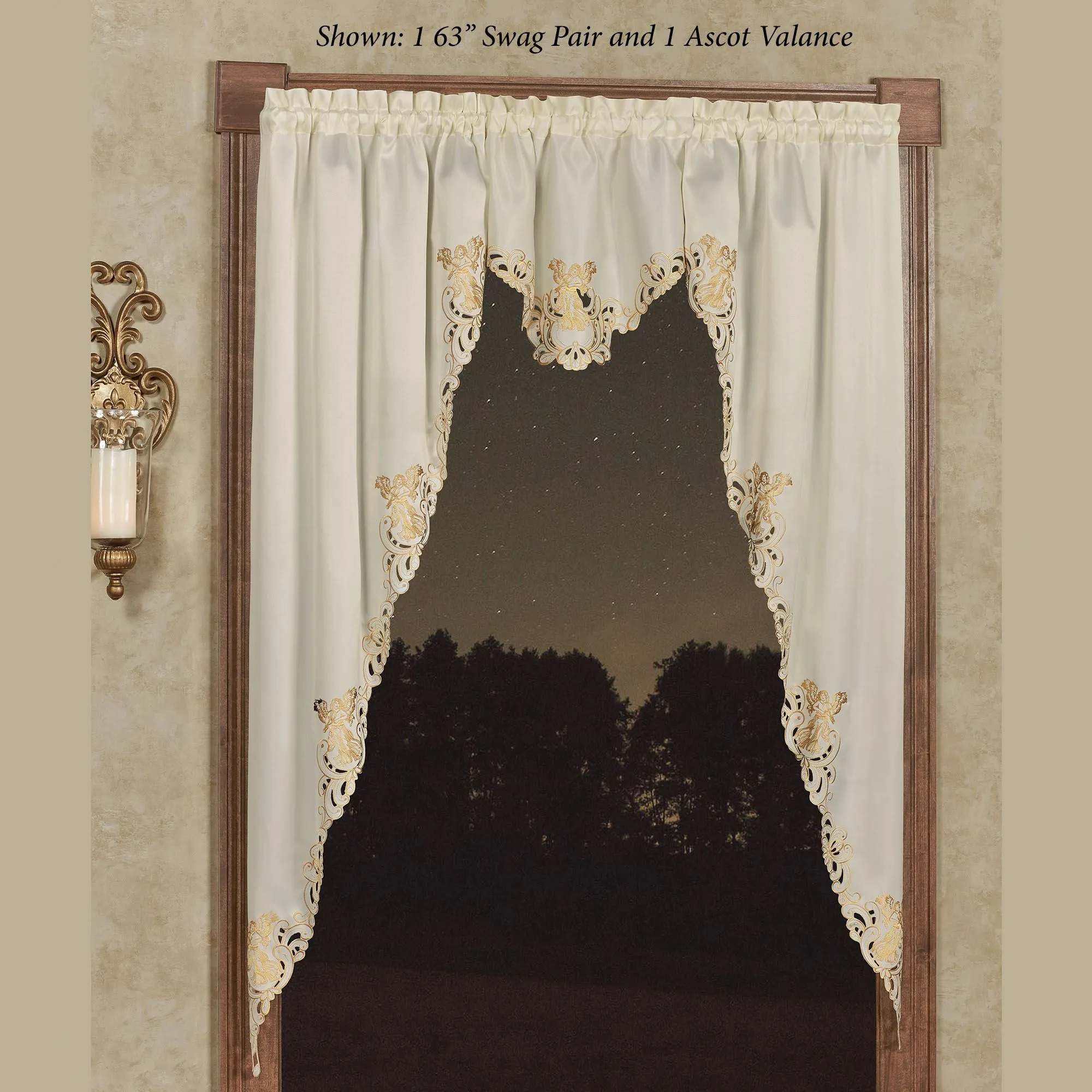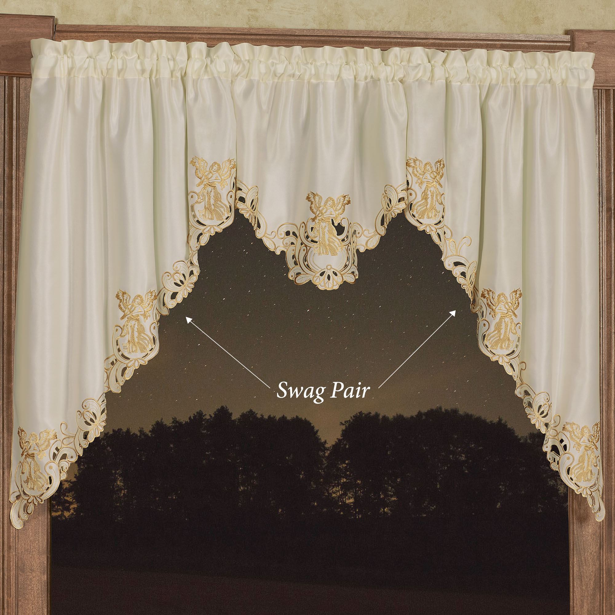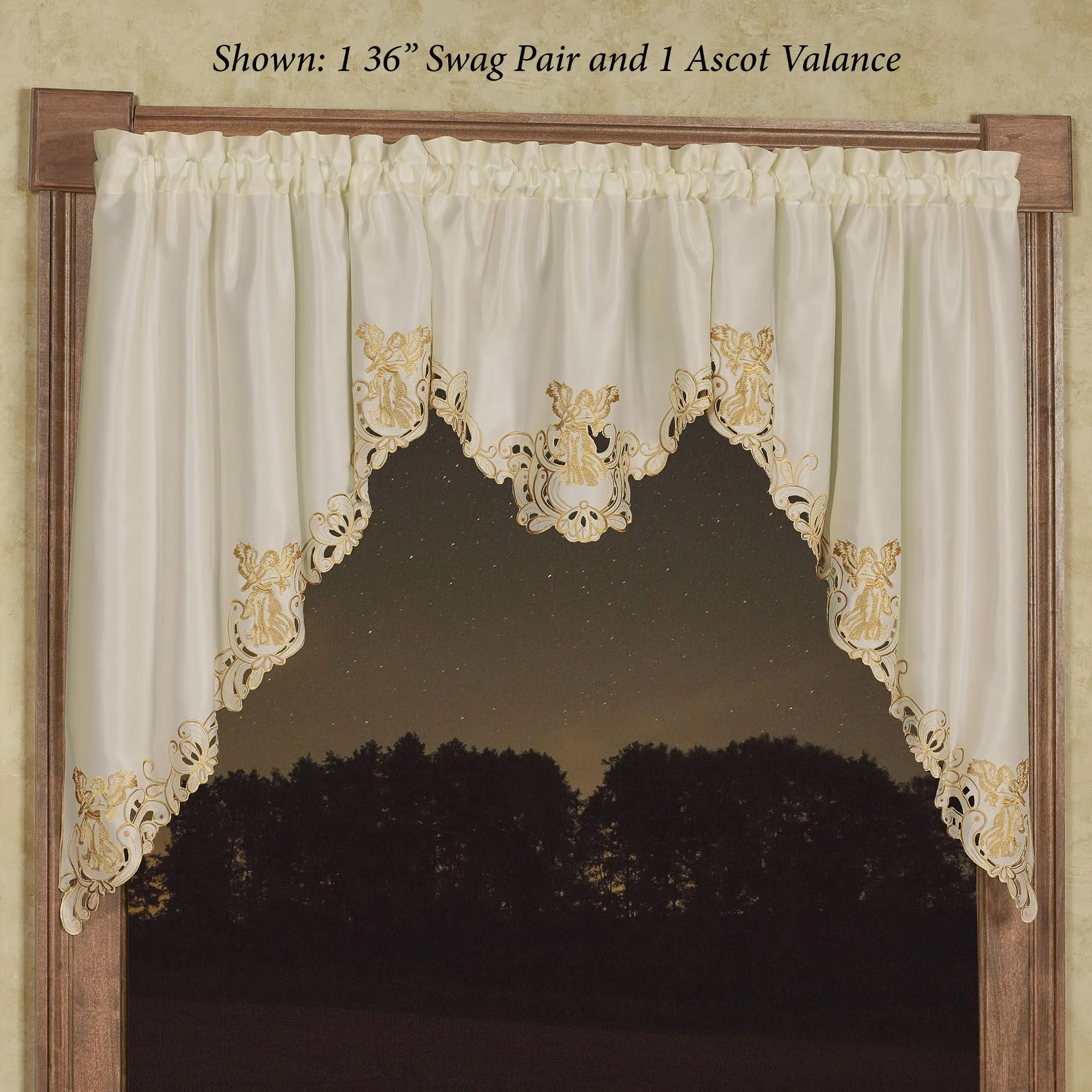Bless your view with the shimmering sparkle of the Angelica Window Treatment. With beautiful scrolling cutwork edges, the ivory polyester satin window accents feature metallic gold embroidery. Heavenly angels grace the designs with lovely spread wings. Rod pockets measure 1.75". Specify Swag Valance Pair, Ascot Valance, or Curtain Pair. Swag Valance Pair is 60"W. Ascot Valance is 24"Wx18"L. Curtain Pair includes embroidered tiebacks; measures 84"Wx84"L. Machine washable. Imported. The curtain pair width is the total width of two panels together.