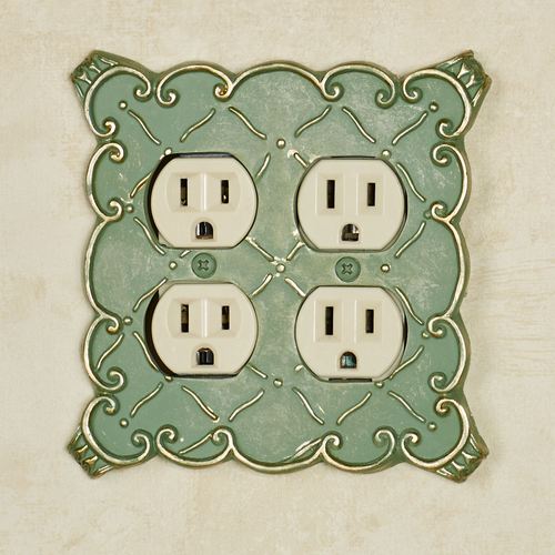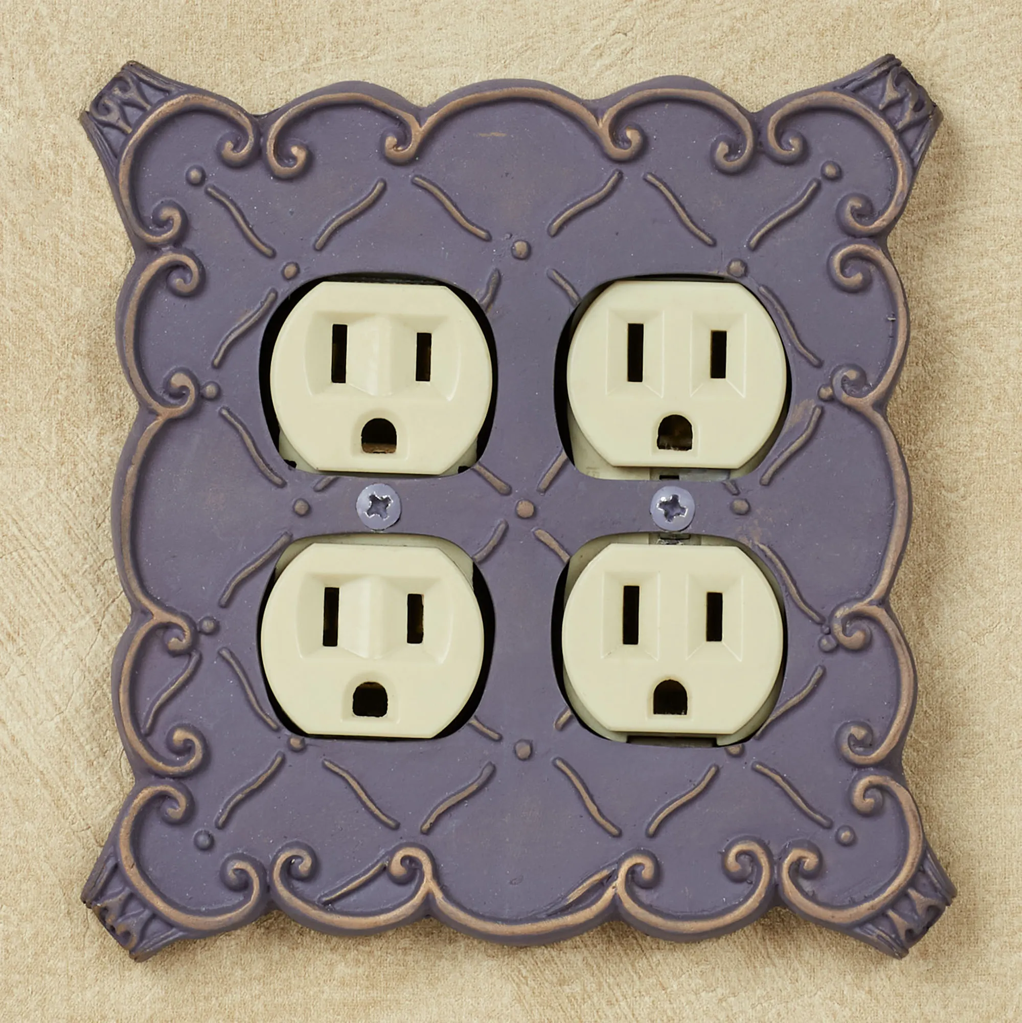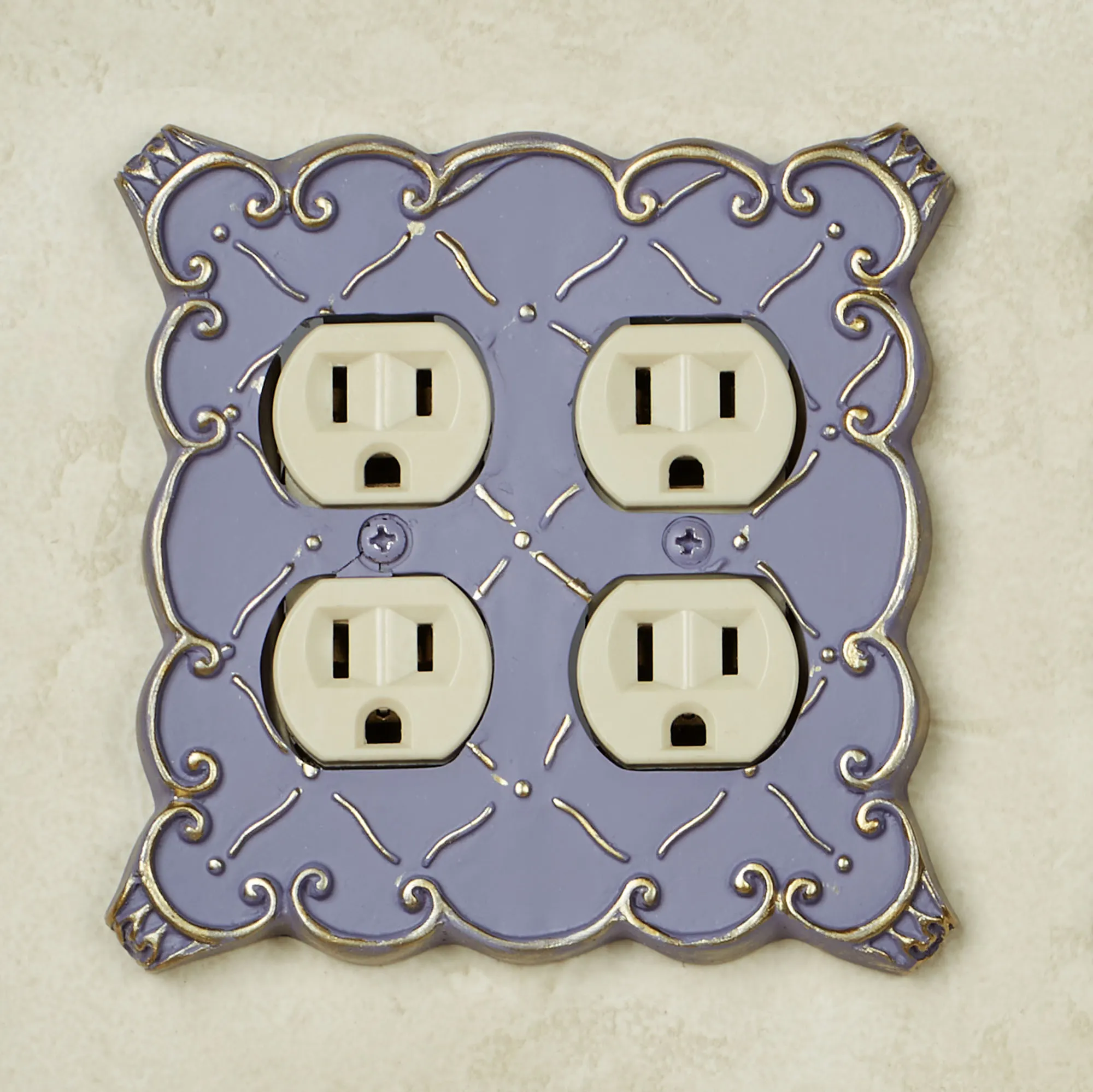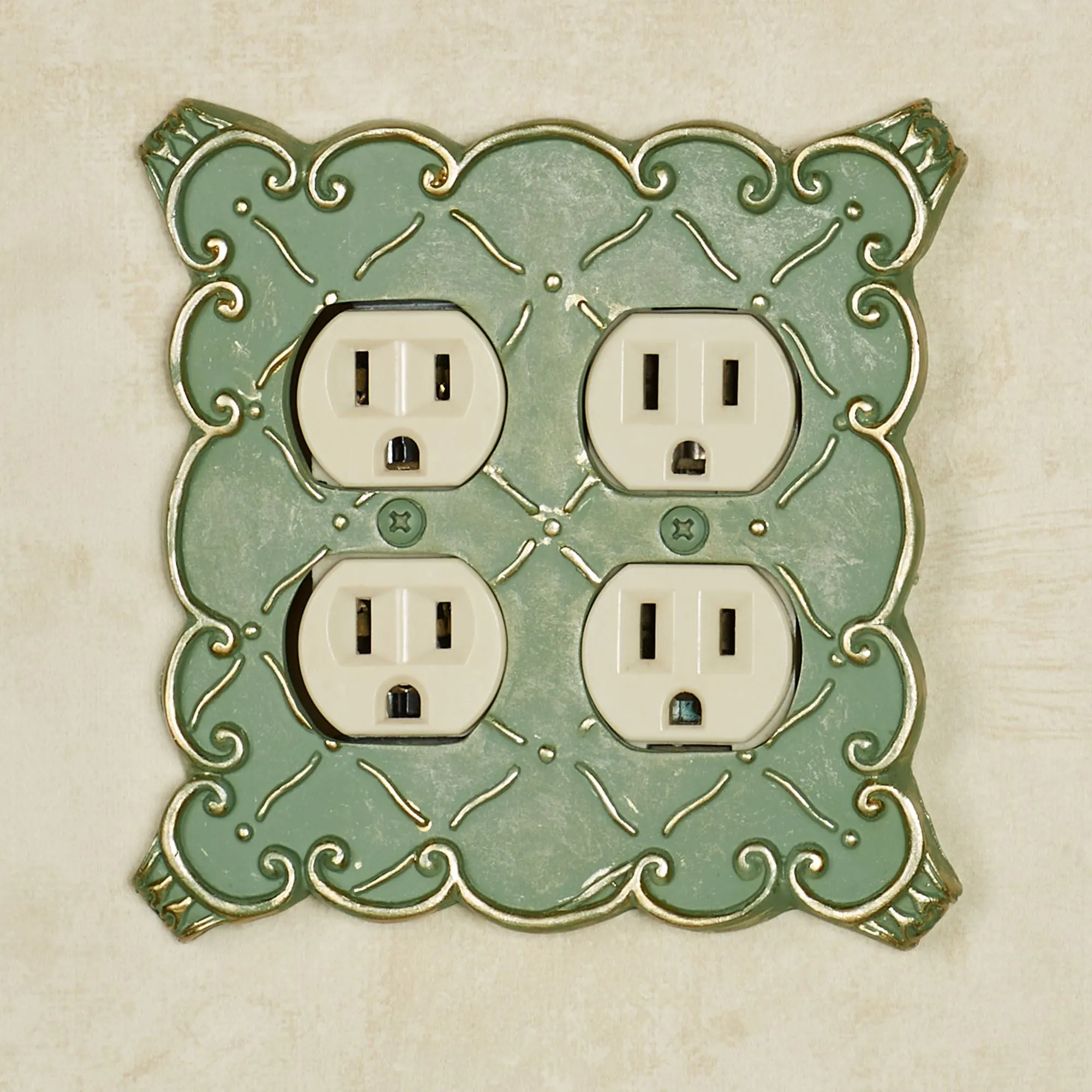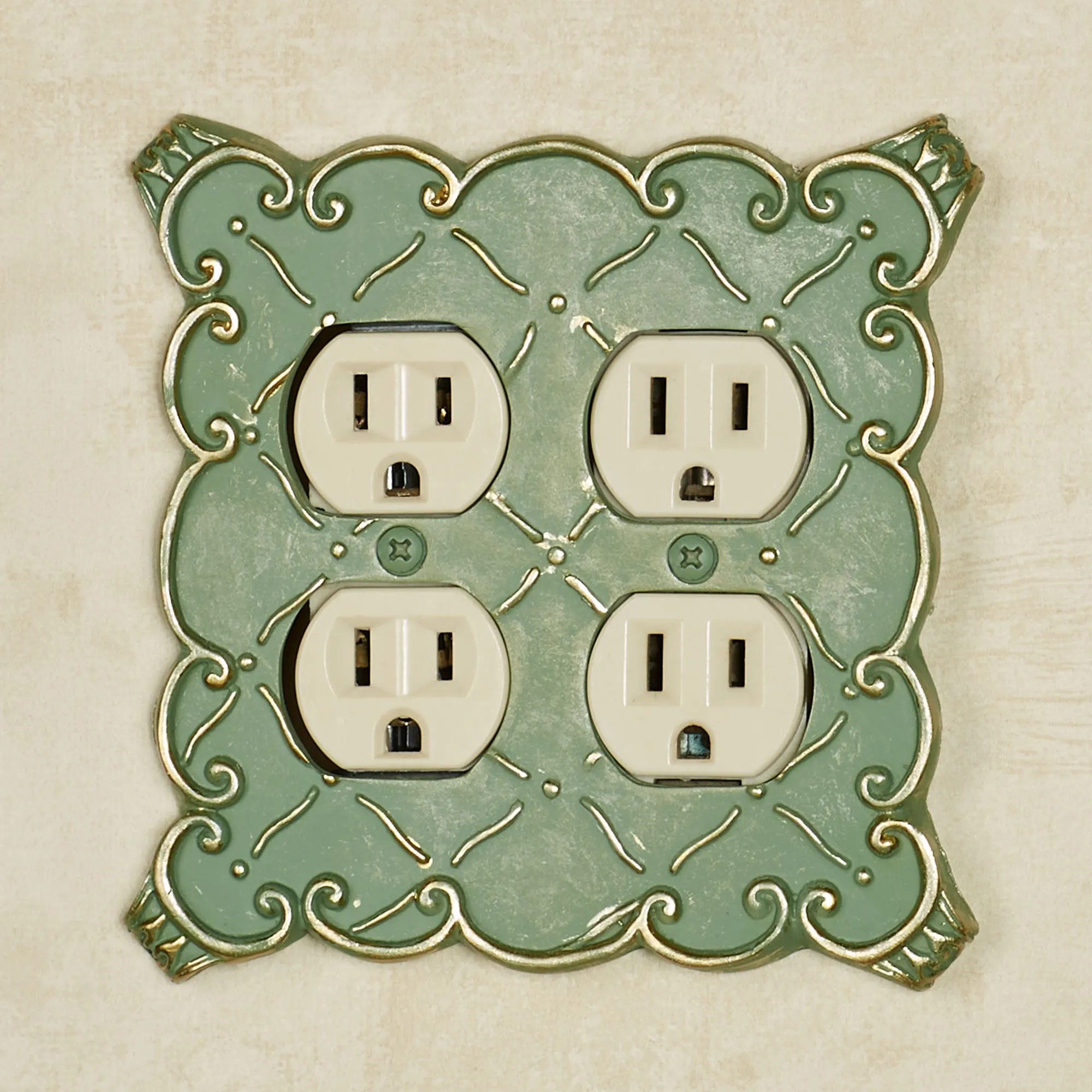 The resin Angelissa Double Outlet features a diamond lattice motif in relief adorned with touches of gold. Scrolling borders will help you coordinate your decor. The double outlet has four sockets. Measures approx. 5.25"Wx5.25"H. Do not over-tighten the screws.
