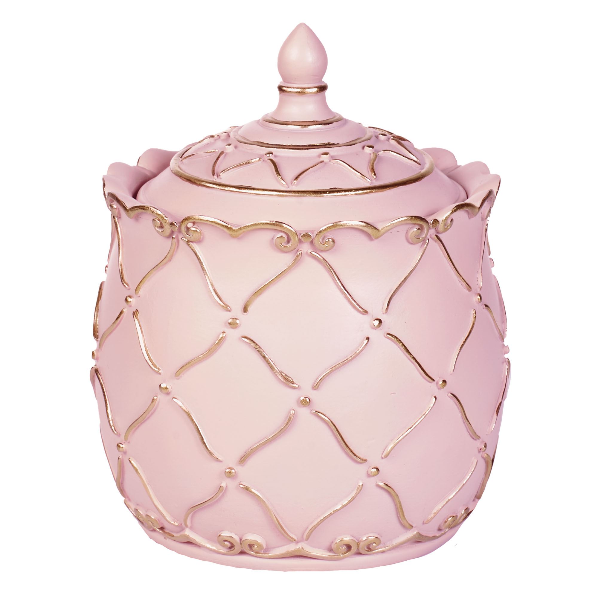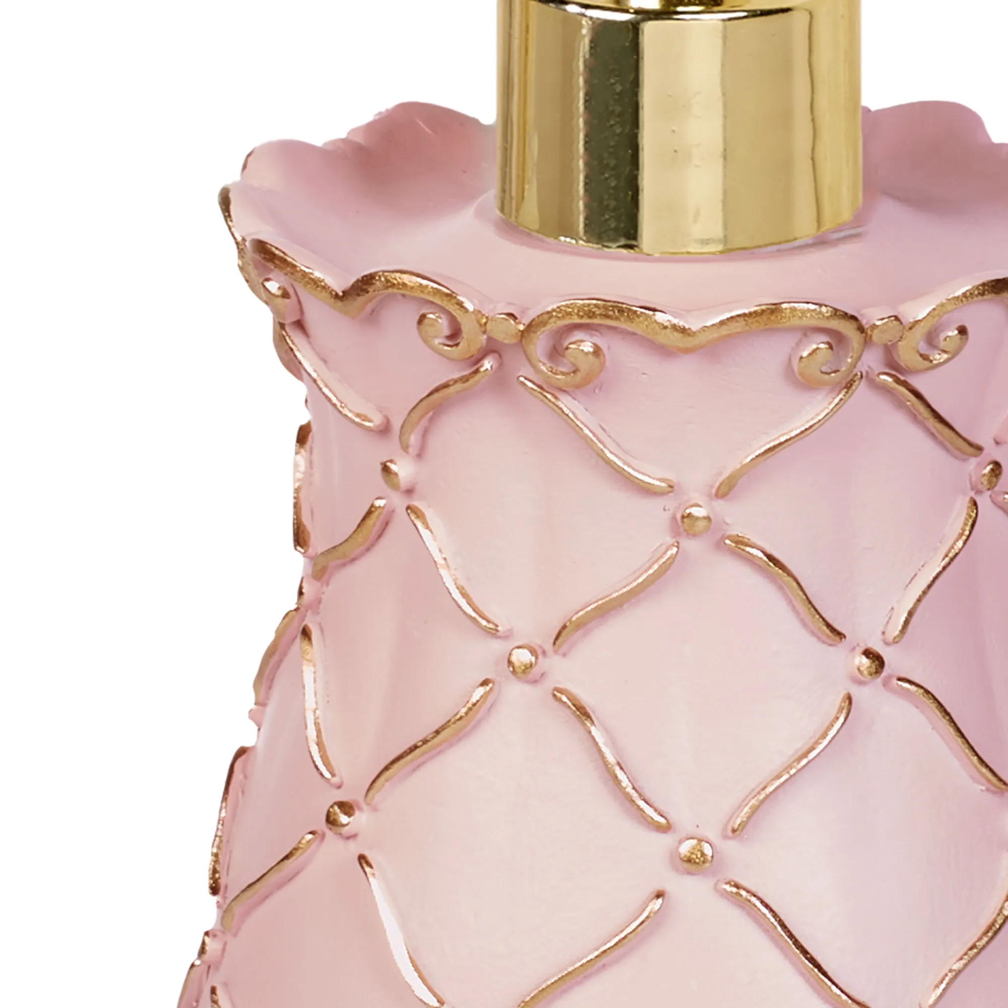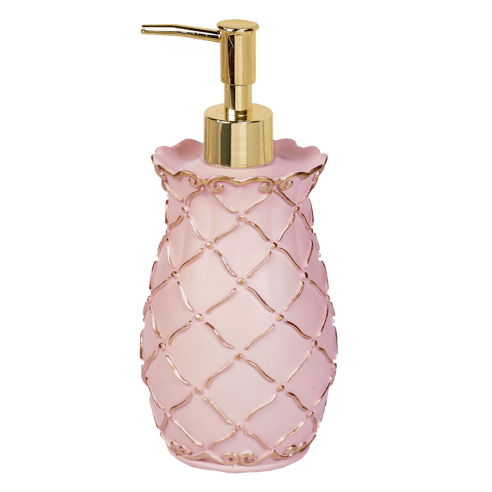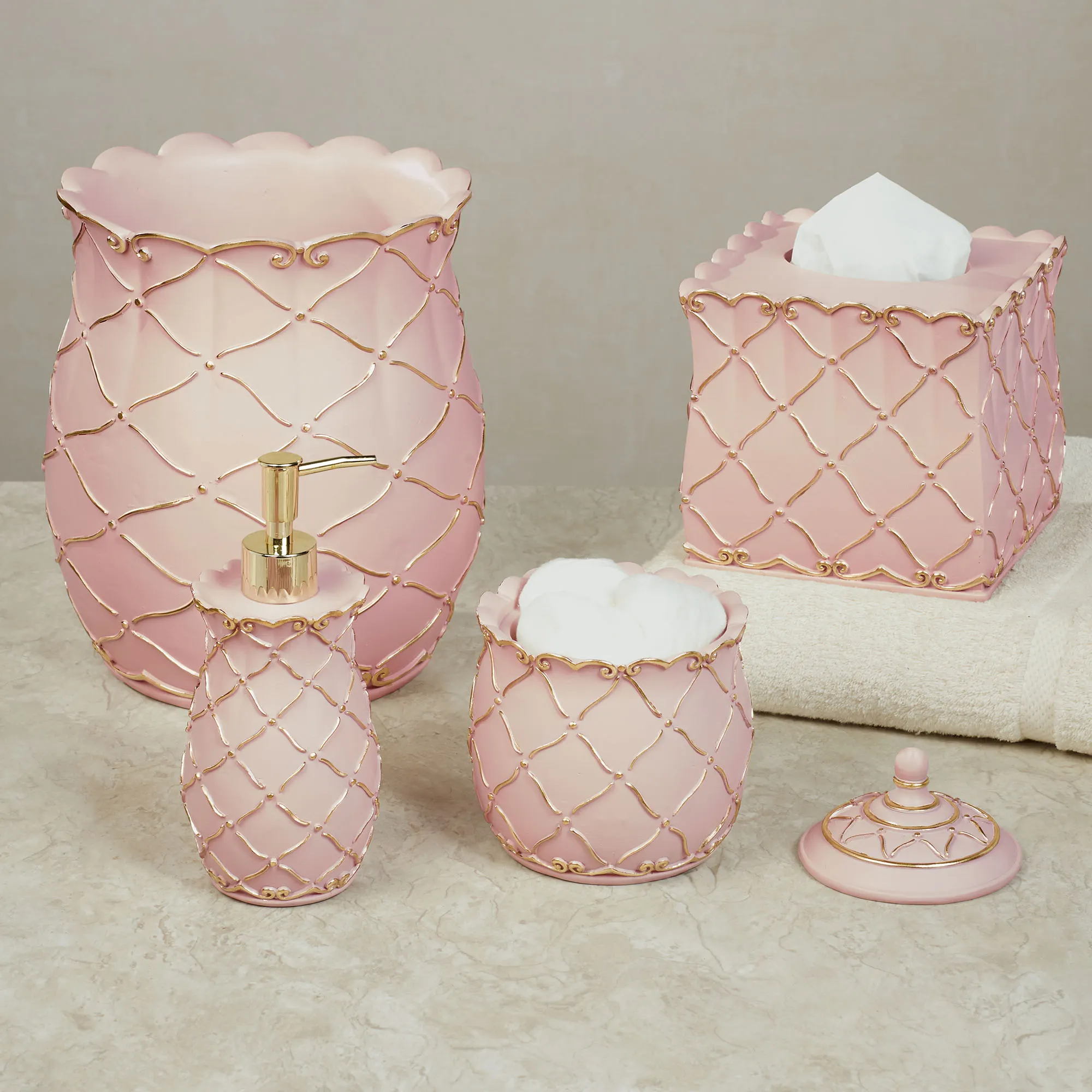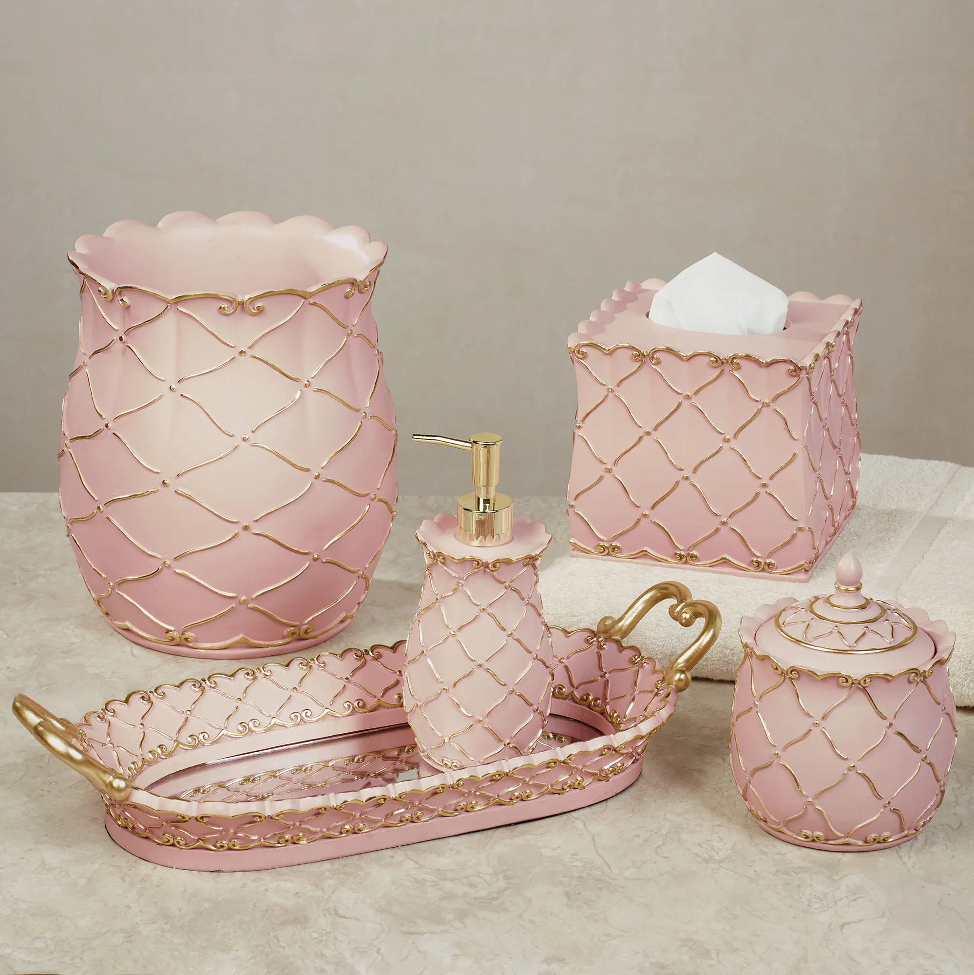 Diamond lattice motifs and scroll designs elegantly decorate the Angelitta Pink Bath Accessories. Made of resin, these handpainted accessories feature motifs in relief adorned with touches of gold. Specify Lotion/Soap Dispenser, Tissue Cover, Wastebasket, Covered Jar, or Tray. The Lotion/Soap Dispenser has a gold metal pump. The Covered Jar has a removable lid with a finial. The Vanity Tray with handles has a mirrored glass bottom.