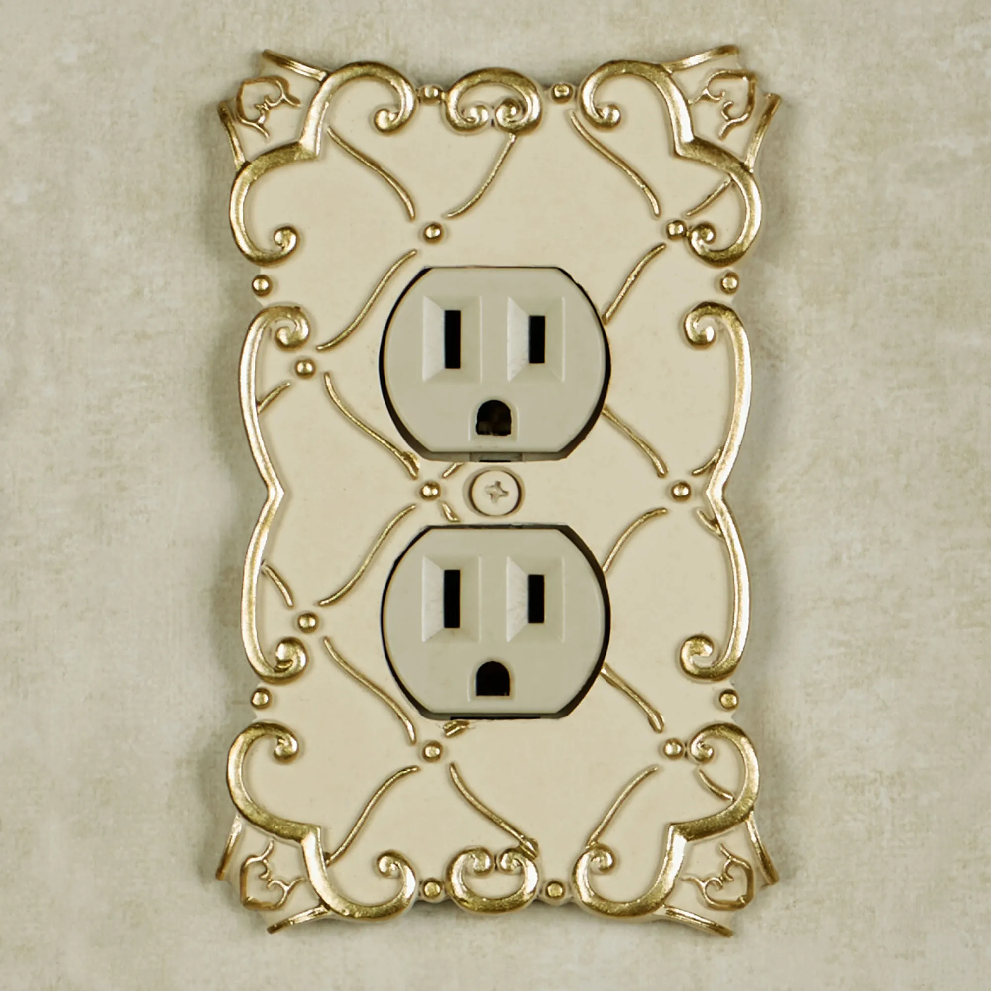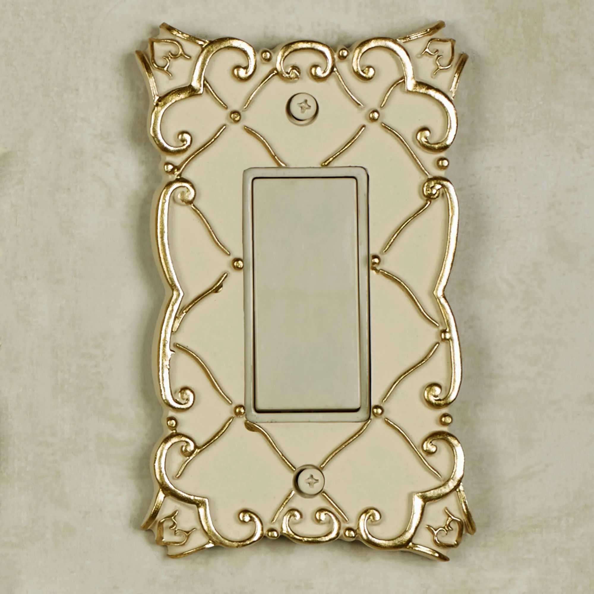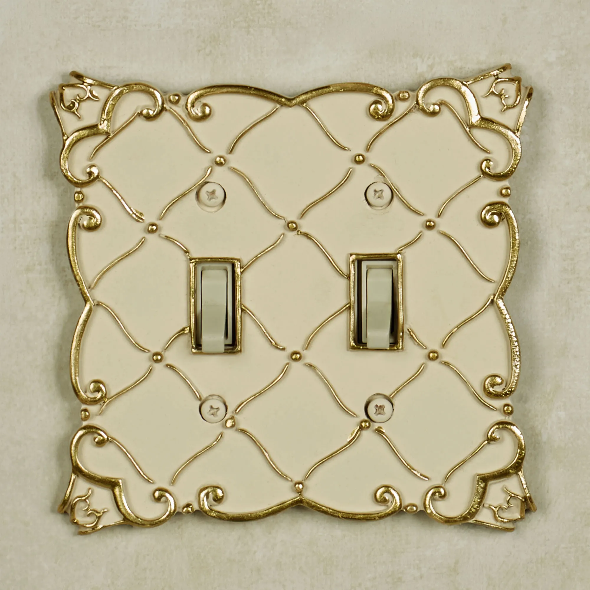 The solid color resin Angelitta Decorative Switchplates feature dimensional diamond latticework and scrolls with handpainted touches of gold. Paint-tipped screws are included. Single Switch is 3.5"Wx5.5"H. Double Switch is 5.25"Wx5.25"H. Single Outlet (two sockets) is 3.5"Wx5.25"H. Single Dimmer/Rocker is 3.5"Wx5.5"H. Do not over-tighten the screws.