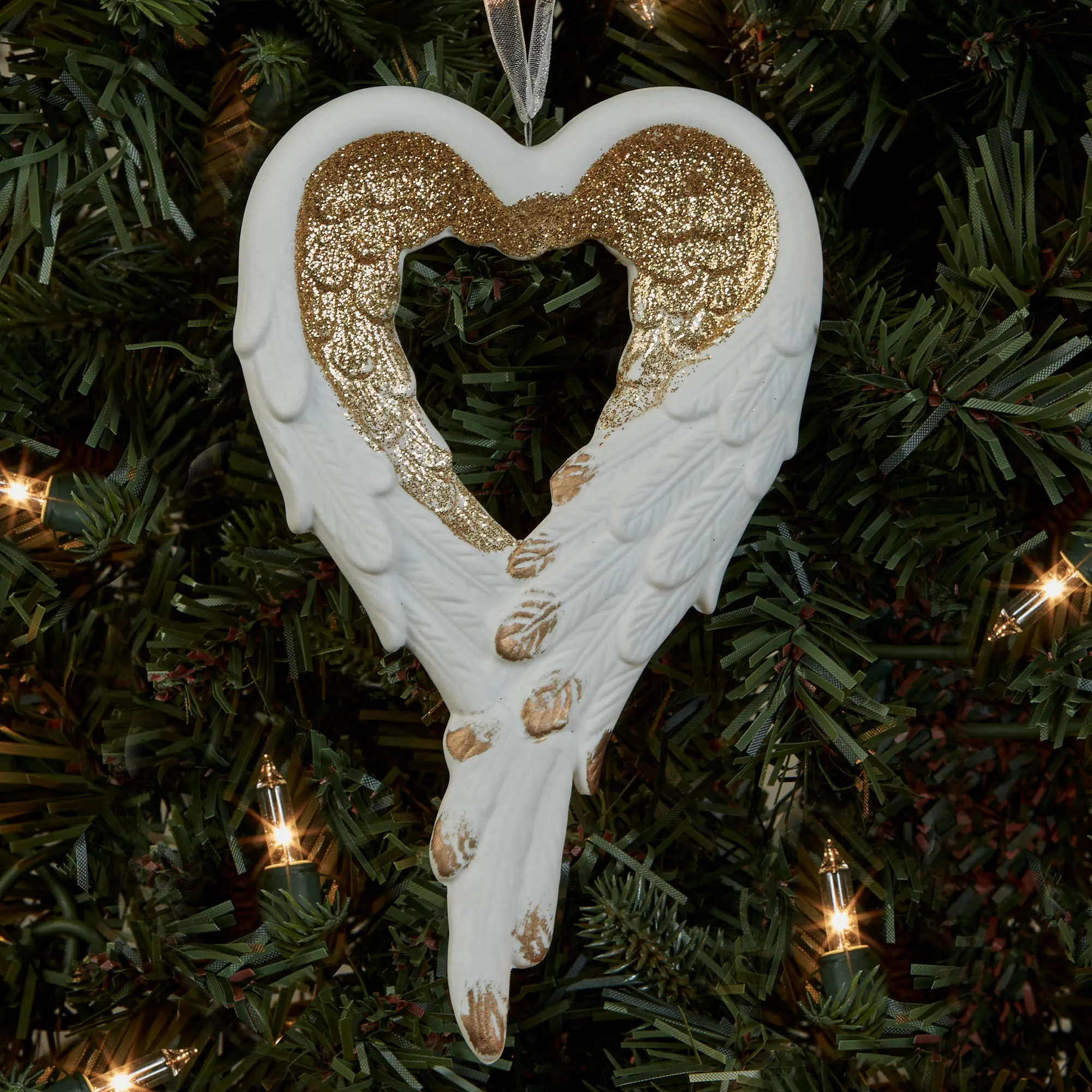 The Angel's Wing Ornament is porcelain with a ribbon for hanging.