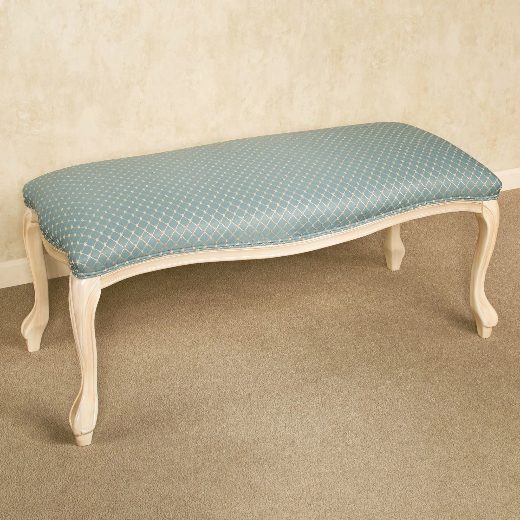 The Anna Belle Upholstered Bench looks elegant. This pickled-finished wood bench features carved trim details, a scalloped apron, cabriole legs, and a blue shadow polyester latticework fabric accented with light taupe chenille tufts to fit classic tastes; cushion fill is foam. Due to the natural wood frame, knotholes and other natural characteristics do appear. Upholstered bench measures 49"Wx21"Dx22"H; weighs 25 lbs. Spot clean fabric.