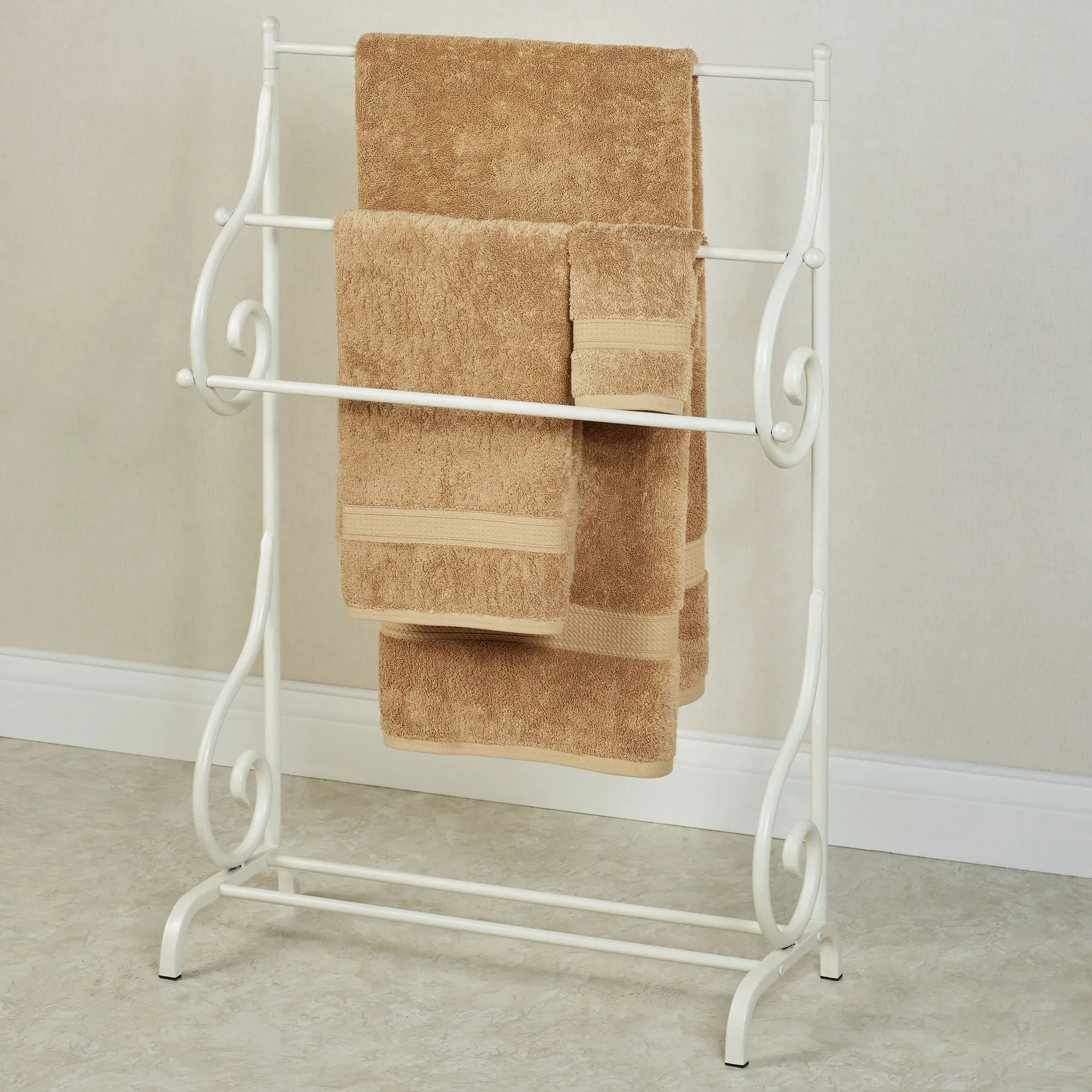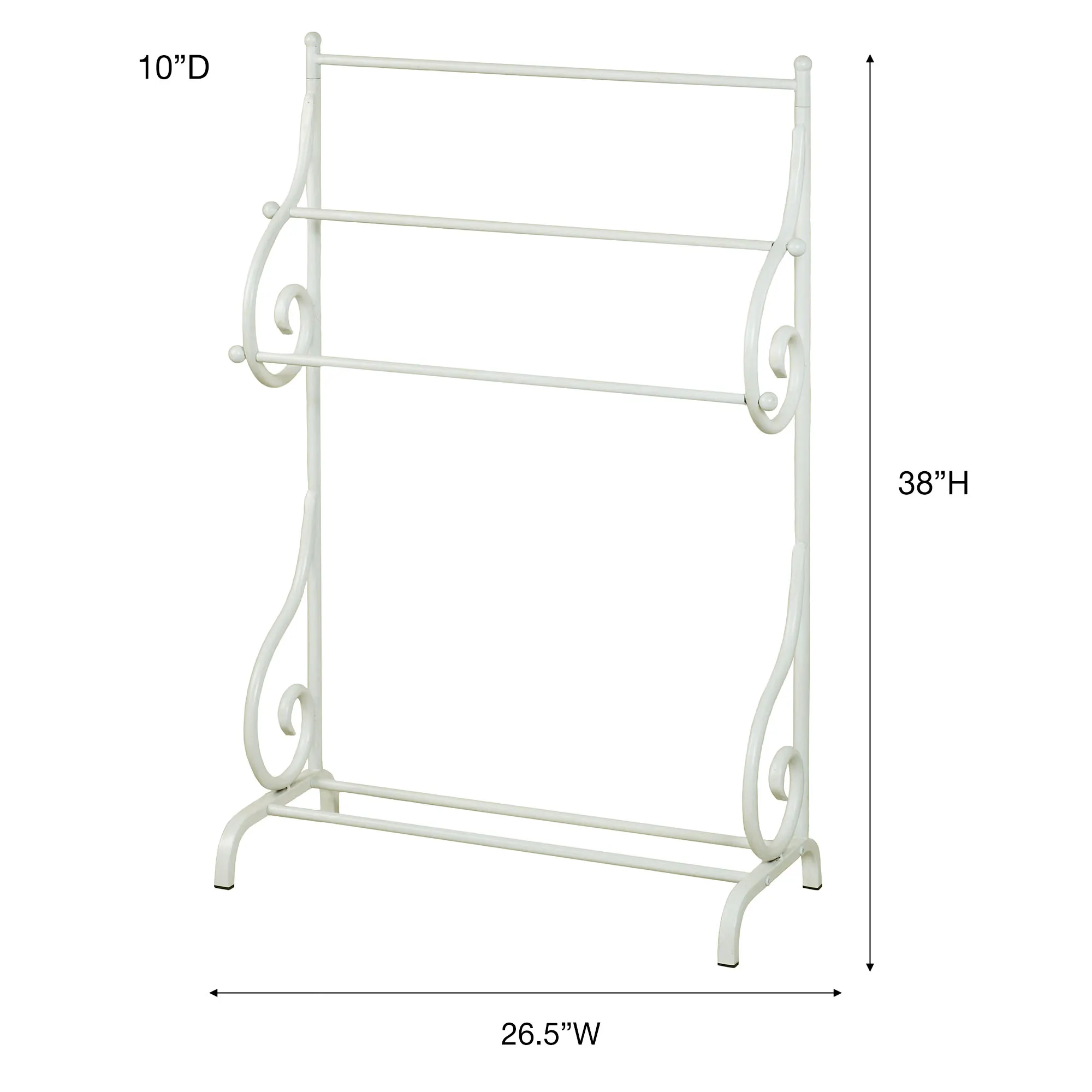 Hang blankets, quilts, washcloths, or other items on the Anna Ivory Towel Rack. This durable metal towel rack stand has swirl designs, three bars, a footed base, and a stunning powder-coated finish. This traditional-style, freestanding rack is perfect in any room. Measures 26.5"Wx10"Dx38"H.