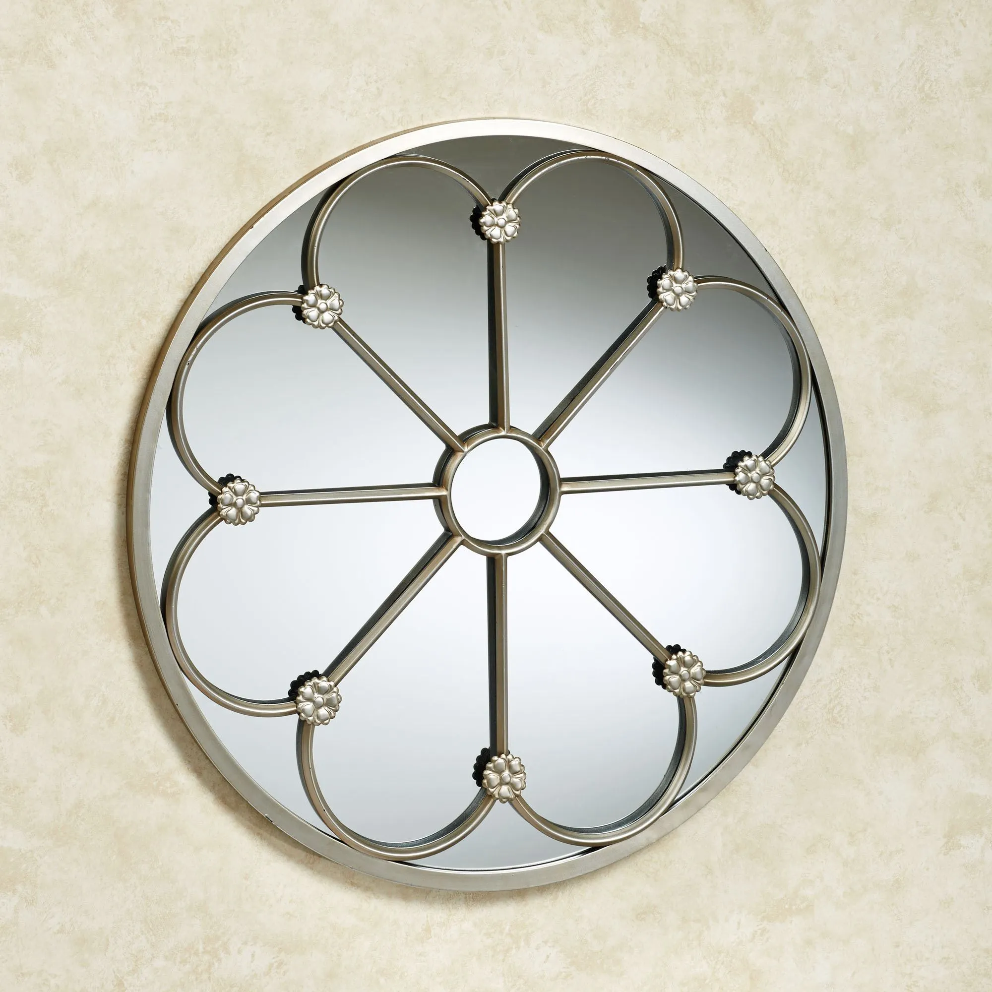 A simplistic floral design and flower medallions decorate the sweet visage of the Anne Marie Mirrored Wall Art. Finished in platinum, the openwork metal frame embellishes the circular mirror with an elegant grace. Measures 33"dia.x2"D and weighs approx. 18 lbs.