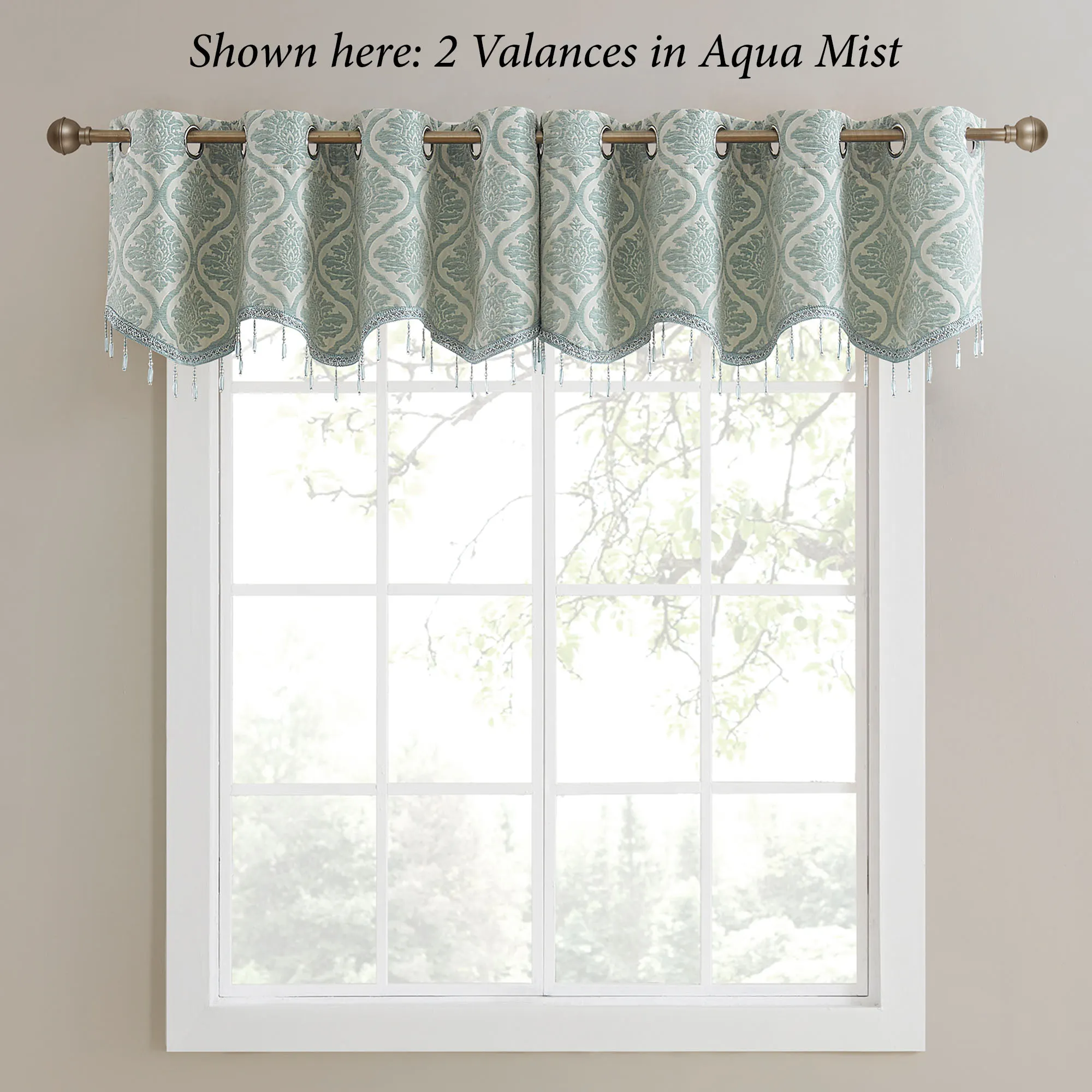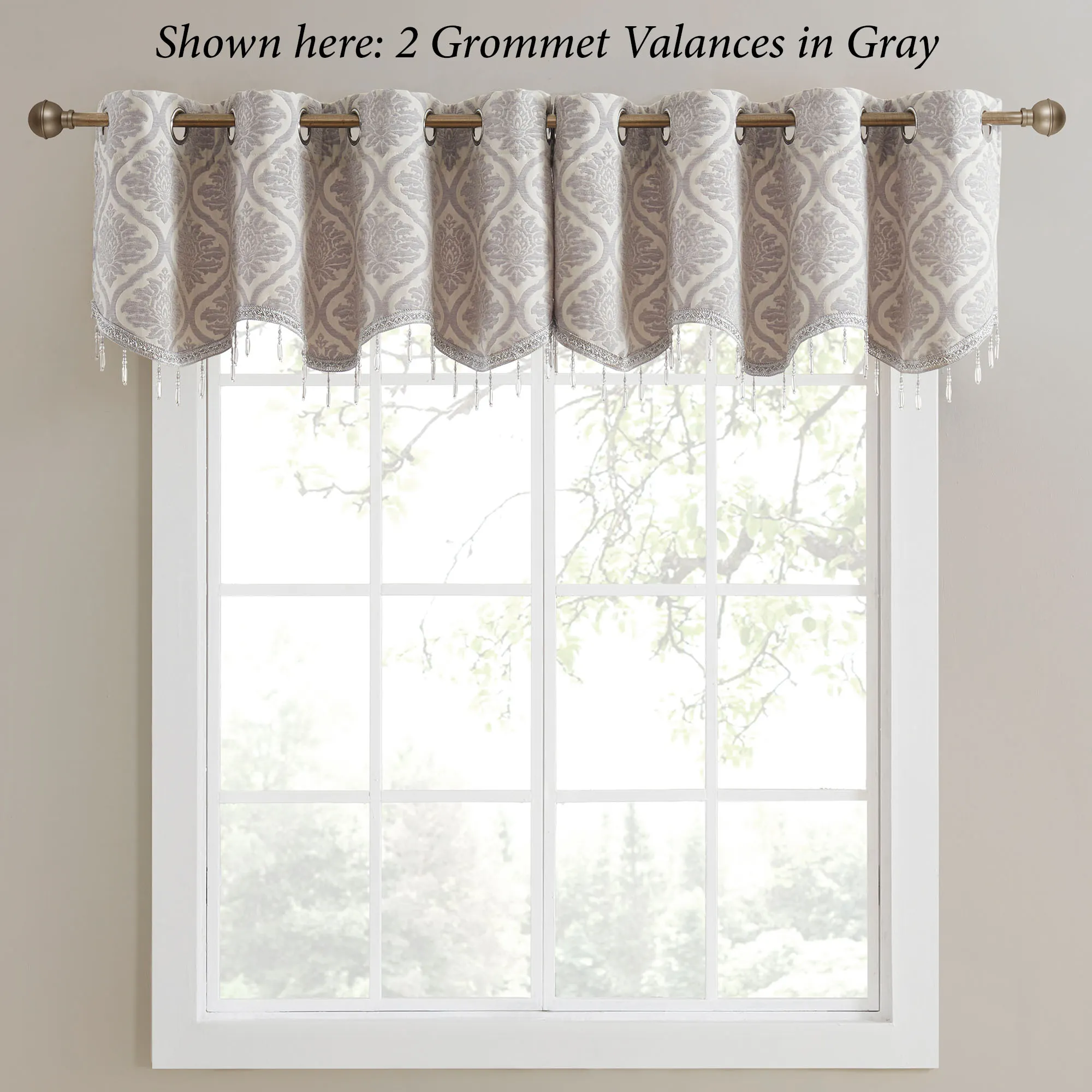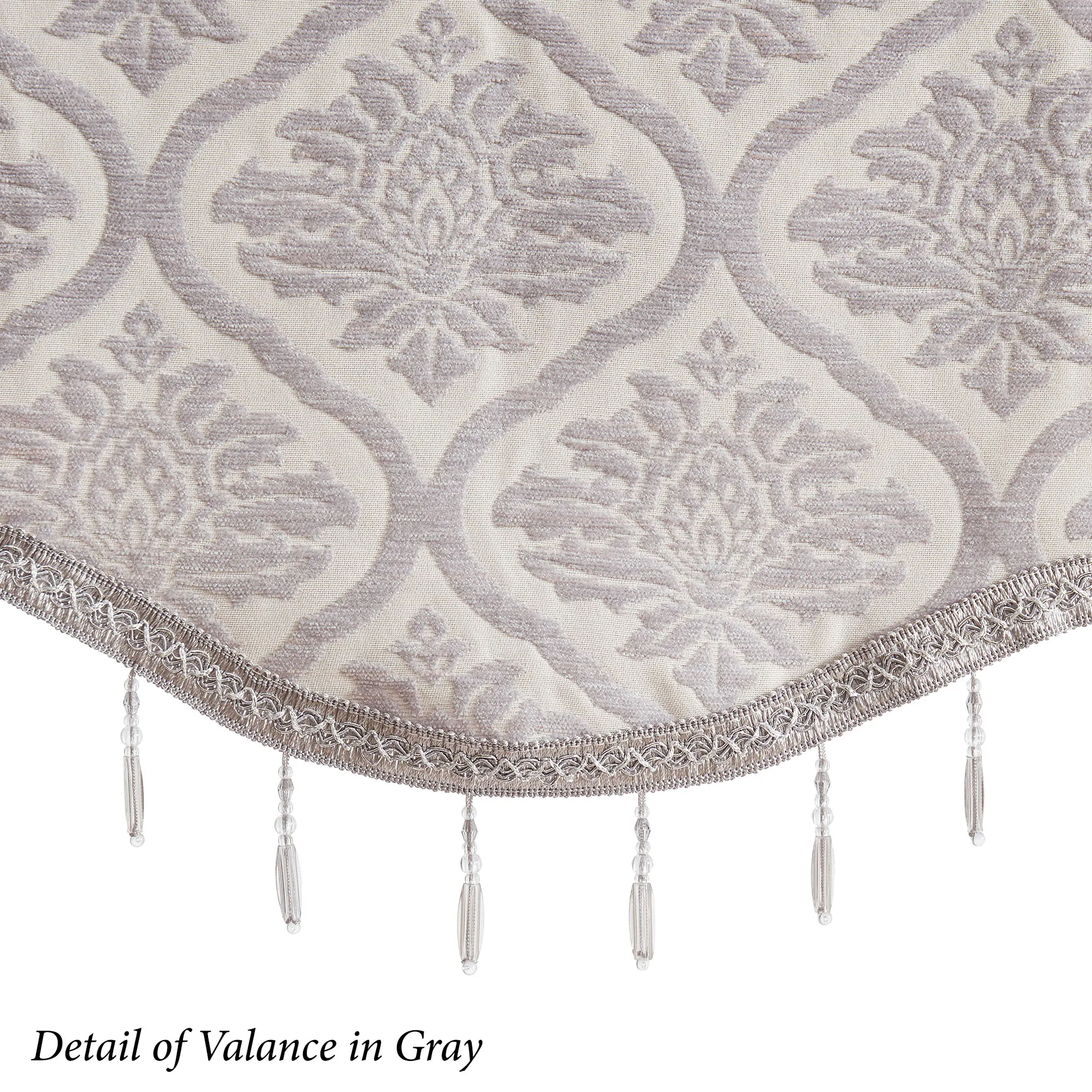 The Annelise Damask Window Treatment is polyester with metal grommets. Valance has acrylic bead accents. Imported.