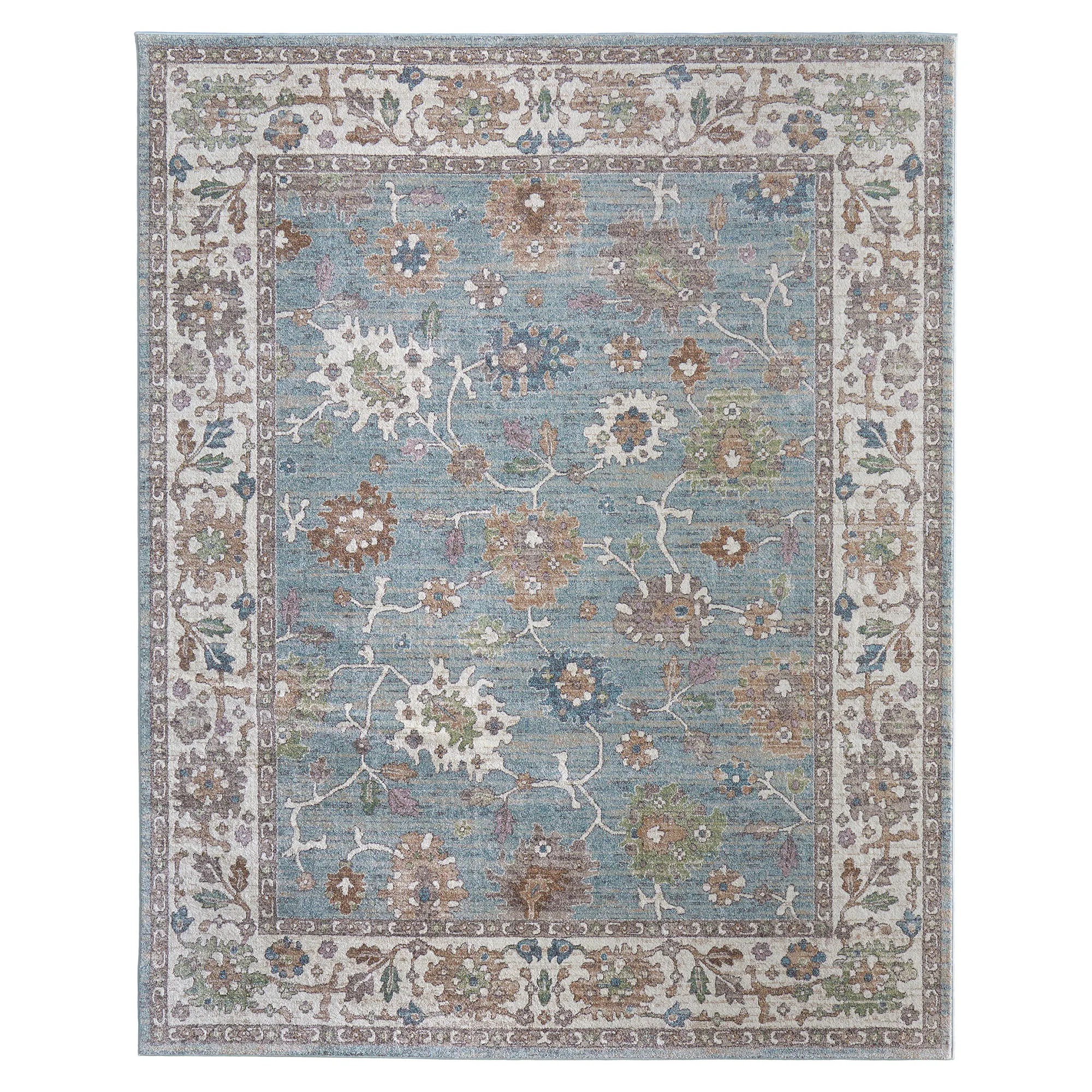 Flowers blossom in a timeless Persian-inspired style from the Annie Rug. Power-loomed from polypropylene, the .39" thick rug features a durable, stain-resistant design filled with classic vining florals and a detailed border. Muted tones of cerulean blue, blue, ivory, green, taupe, gray, beige, and mauve fill the rug with a traditional air. Backing is latex. We recommend professional cleaning by a rug cleaner. Imported.