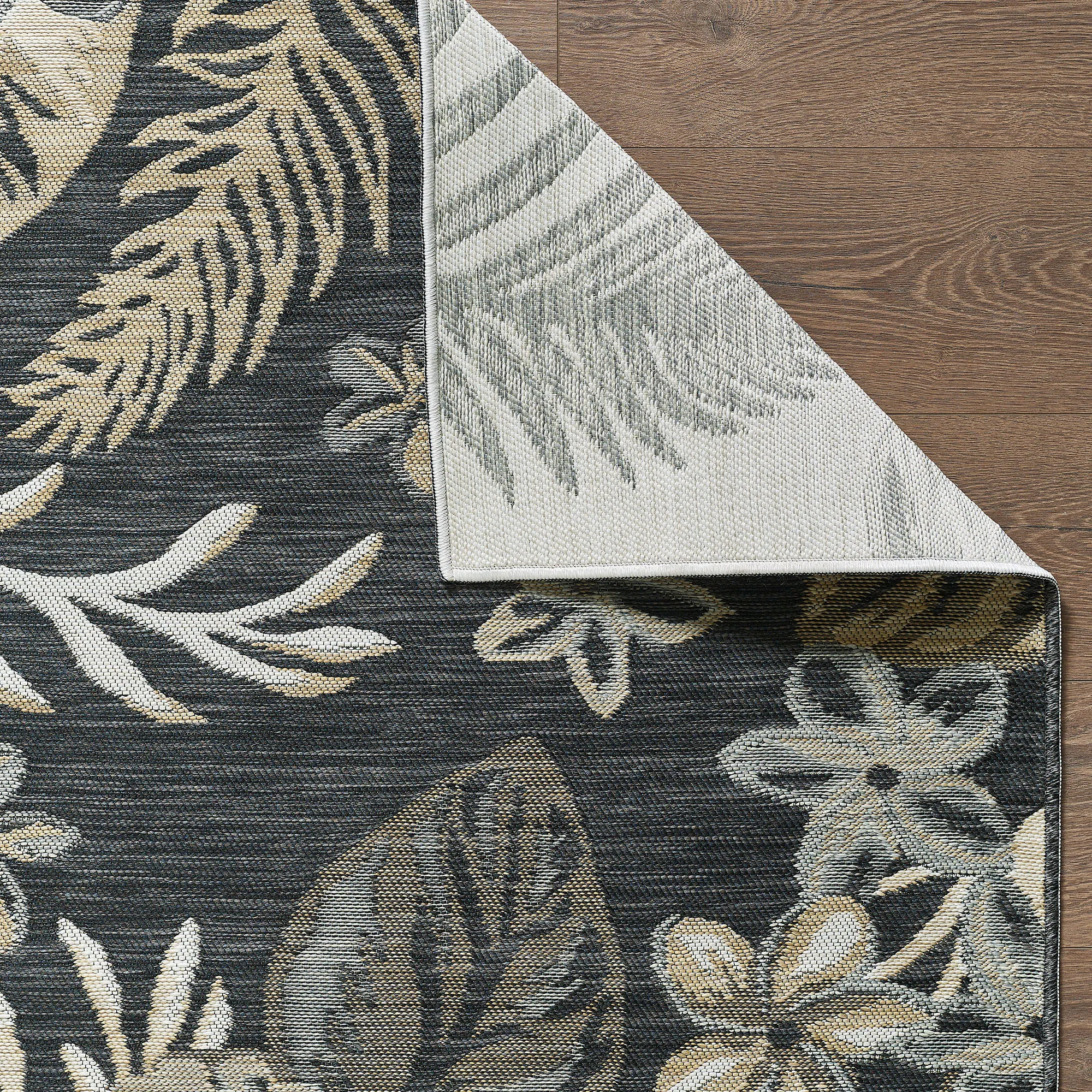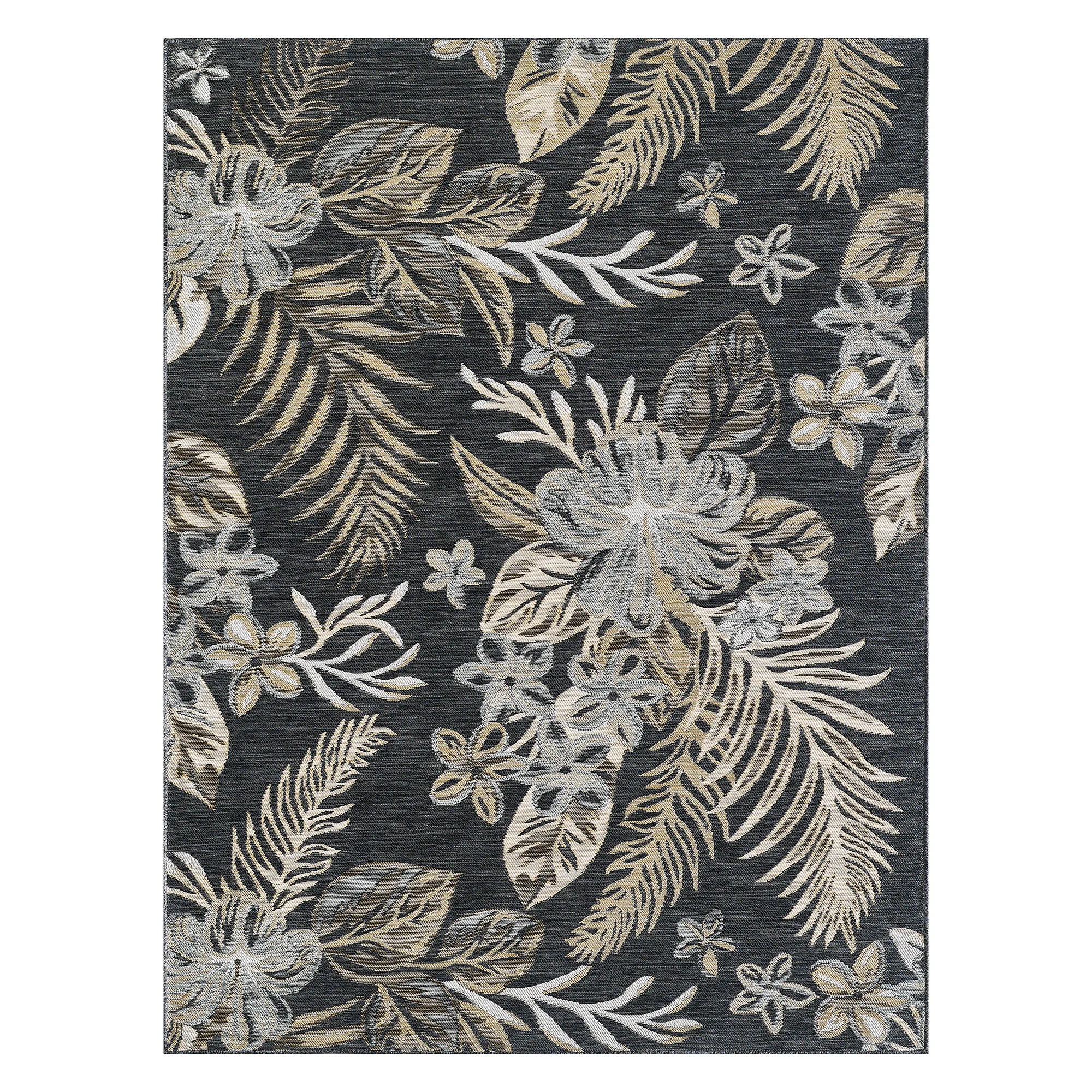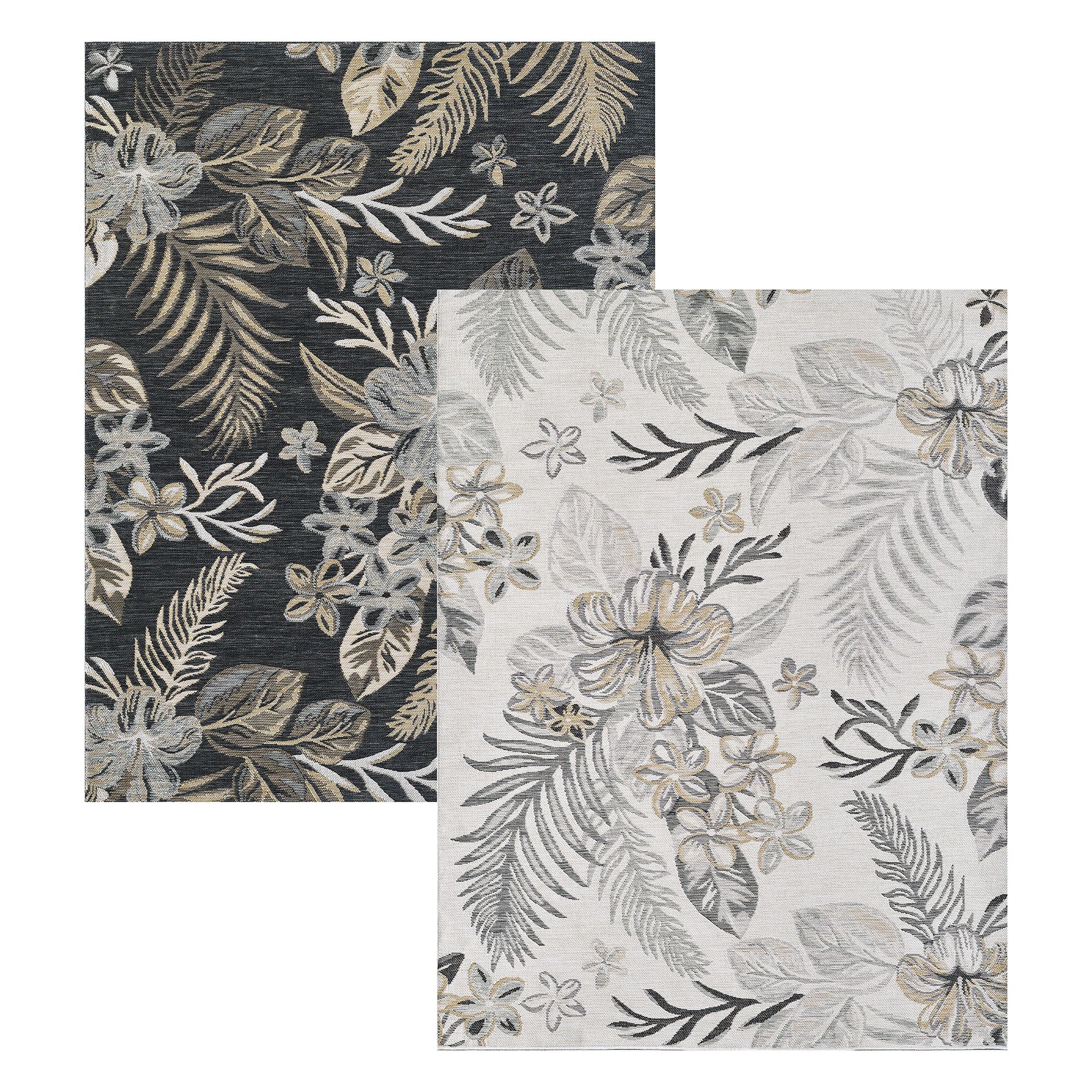 Tropical fronds and florals flourish on the Antigua Reversible Rug. The power-loomed, UV-treated polypropylene area rug, .25" thick, is reversible. One side has ivory, soft gold, brown, and gray tropical leaves and florals on black; the other side has ivory, soft gold, black, and gray tropical leaves and florals on ivory. Rug may be used indoors or outdoors seasonally; do not expose this rug to freezing temperatures. Spot clean and rinse with a garden hose; for stubborn stains, we recommend professional cleaning by a rug cleaner. Imported.