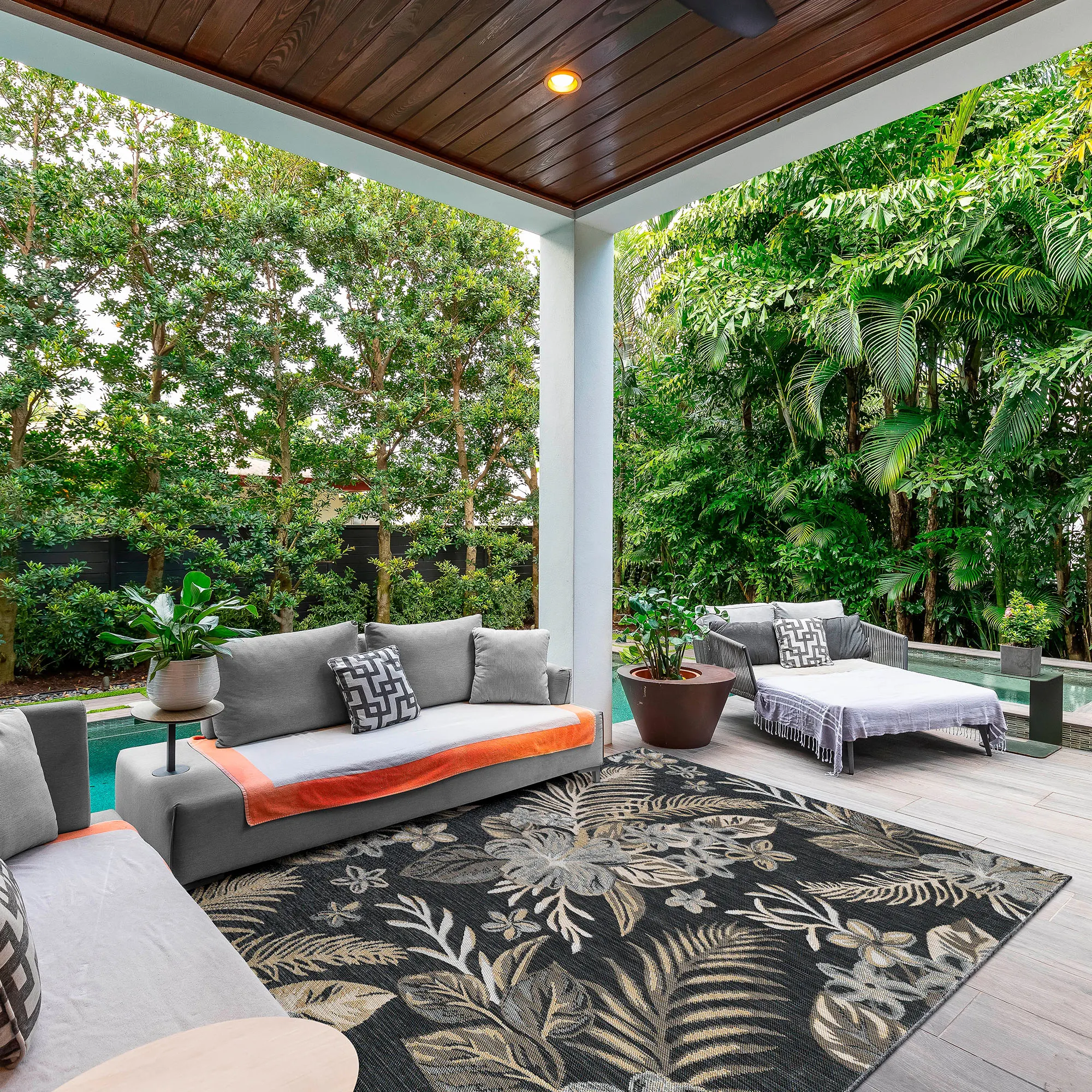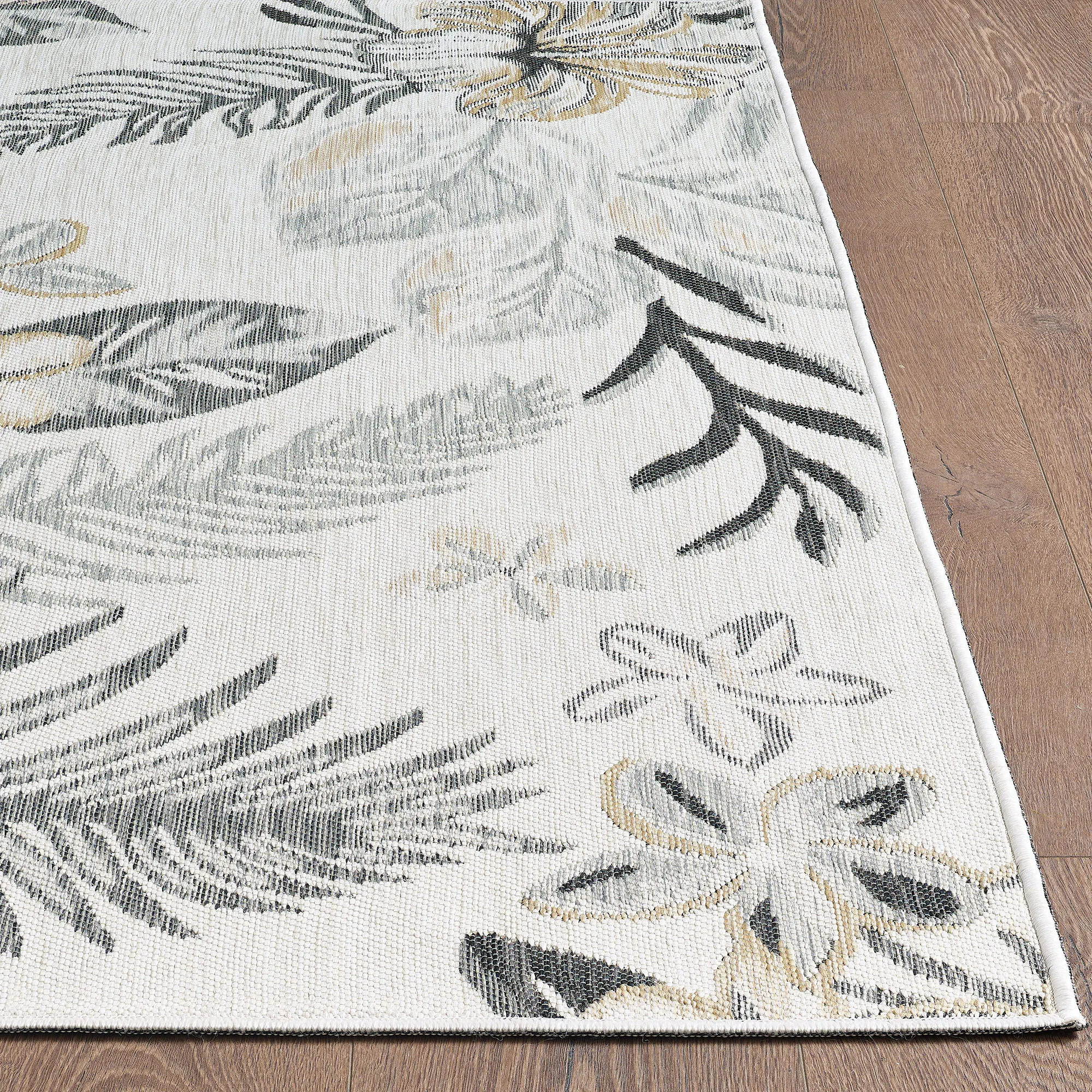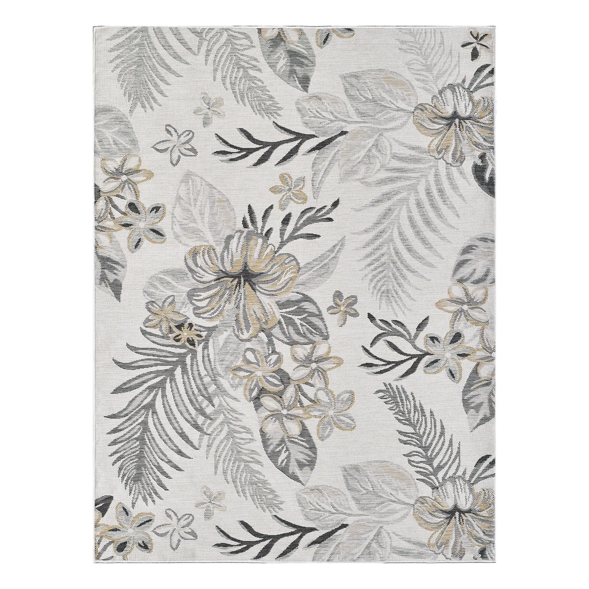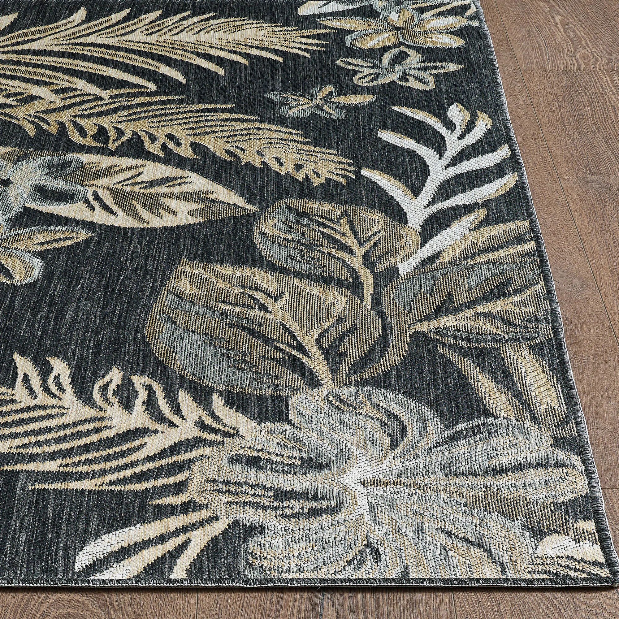 Tropical fronds and florals flourish on the Antigua Reversible Rug. The power-loomed, UV-treated polypropylene area rug, .25" thick, is reversible. One side has ivory, soft gold, brown, and gray tropical leaves and florals on black; the other side has ivory, soft gold, black, and gray tropical leaves and florals on ivory. Rug may be used indoors or outdoors seasonally; do not expose this rug to freezing temperatures. Spot clean and rinse with a garden hose; for stubborn stains, we recommend professional cleaning by a rug cleaner. Imported.