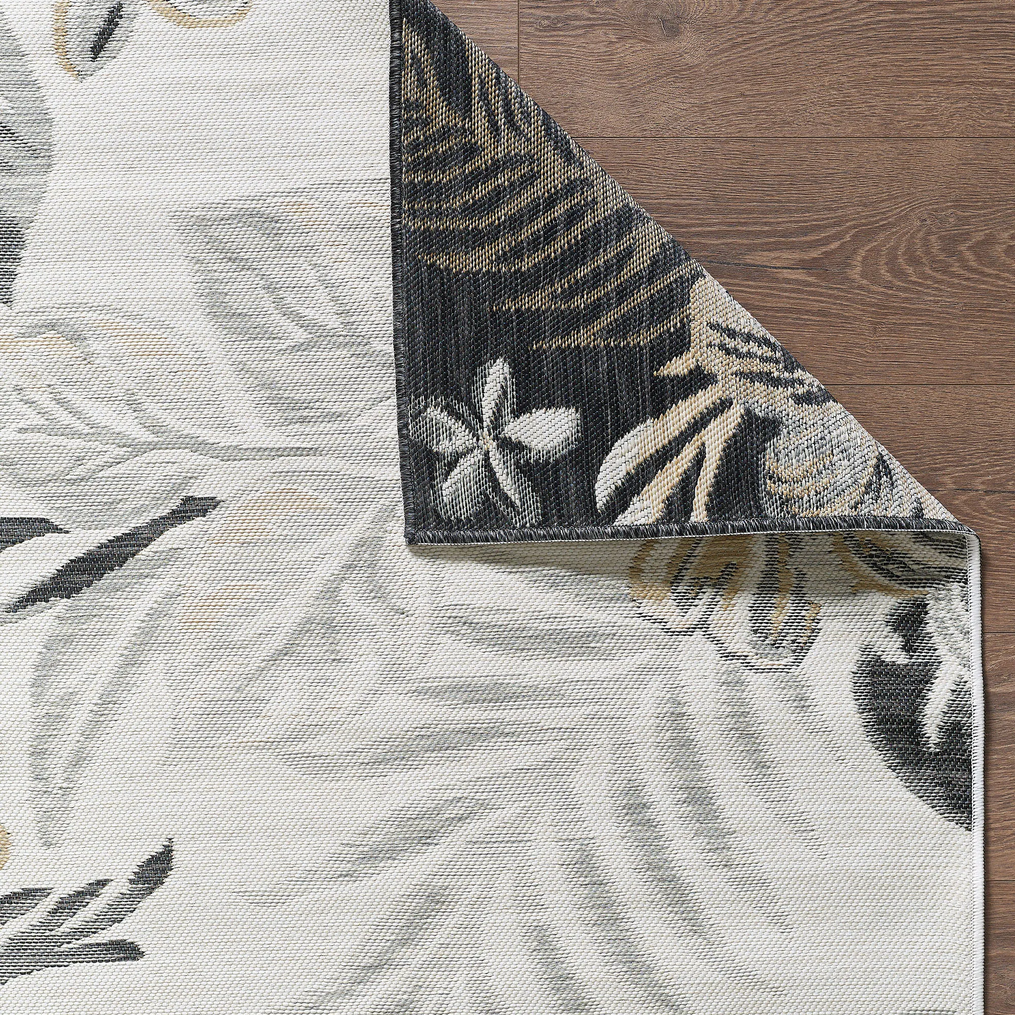 Antigua Black and Ivory Tropical Leaf Floral Reversible Indoor Outdoor Rugs
