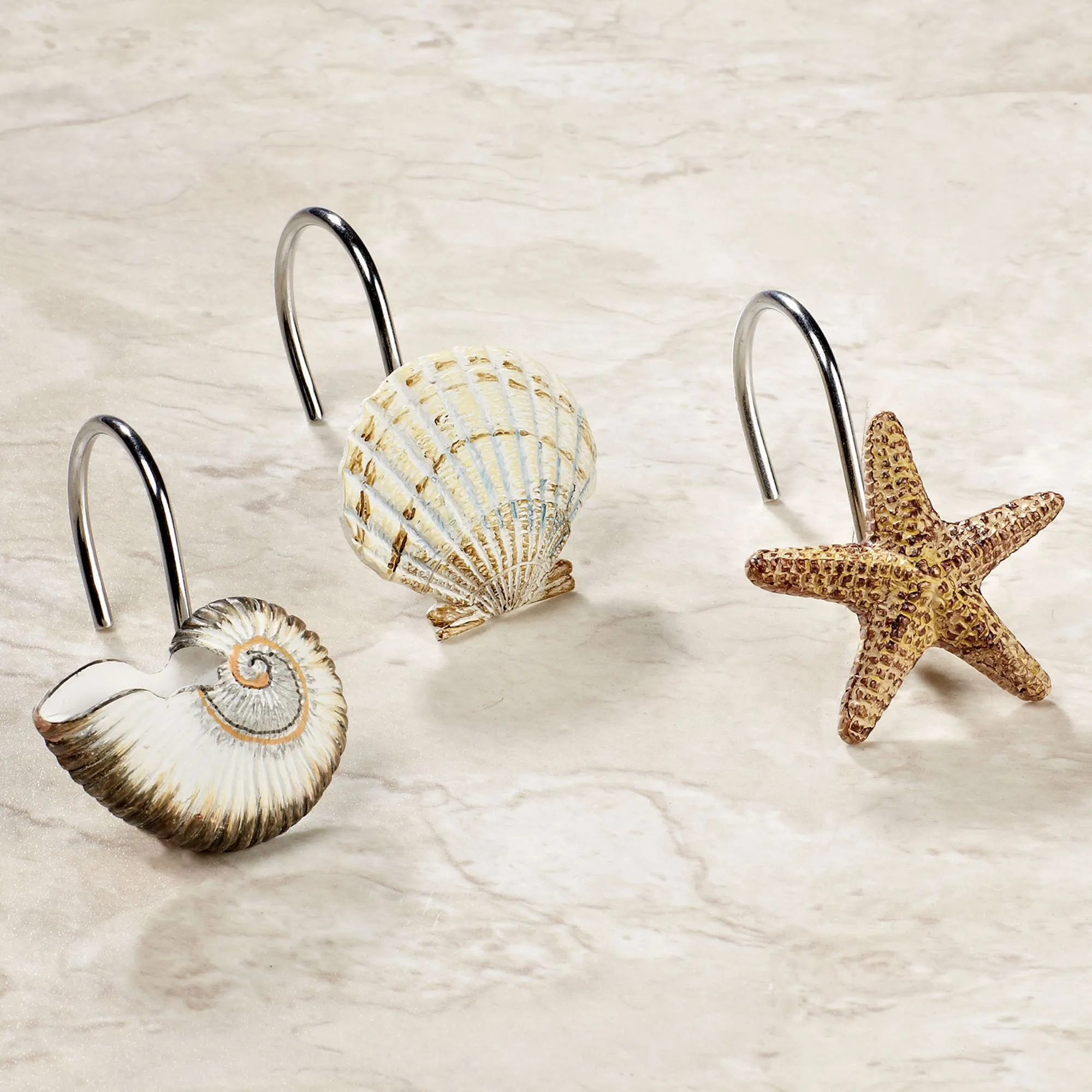 The lovely Antigua Coastal Shower Accessories will remind you of times spent at the coast. The polyester Shower Curtain has blue striped borders at the top and bottom. The main portion of the shower curtain features shells, coral, starfish, seahorses, other underwater artifacts, and script writing; all in colors of blue, gold, and tan on ivory. Some starfish on the shower curtain have sequin or bead accents. Shower curtain, 72"Wx72"L, is machine washable. Shower Hooks are sold separately in a 12-piece set. Shower hooks are resin and metal and are shaped like shells and starfish. Each is 2"Wx2"Dx3"H. Imported.