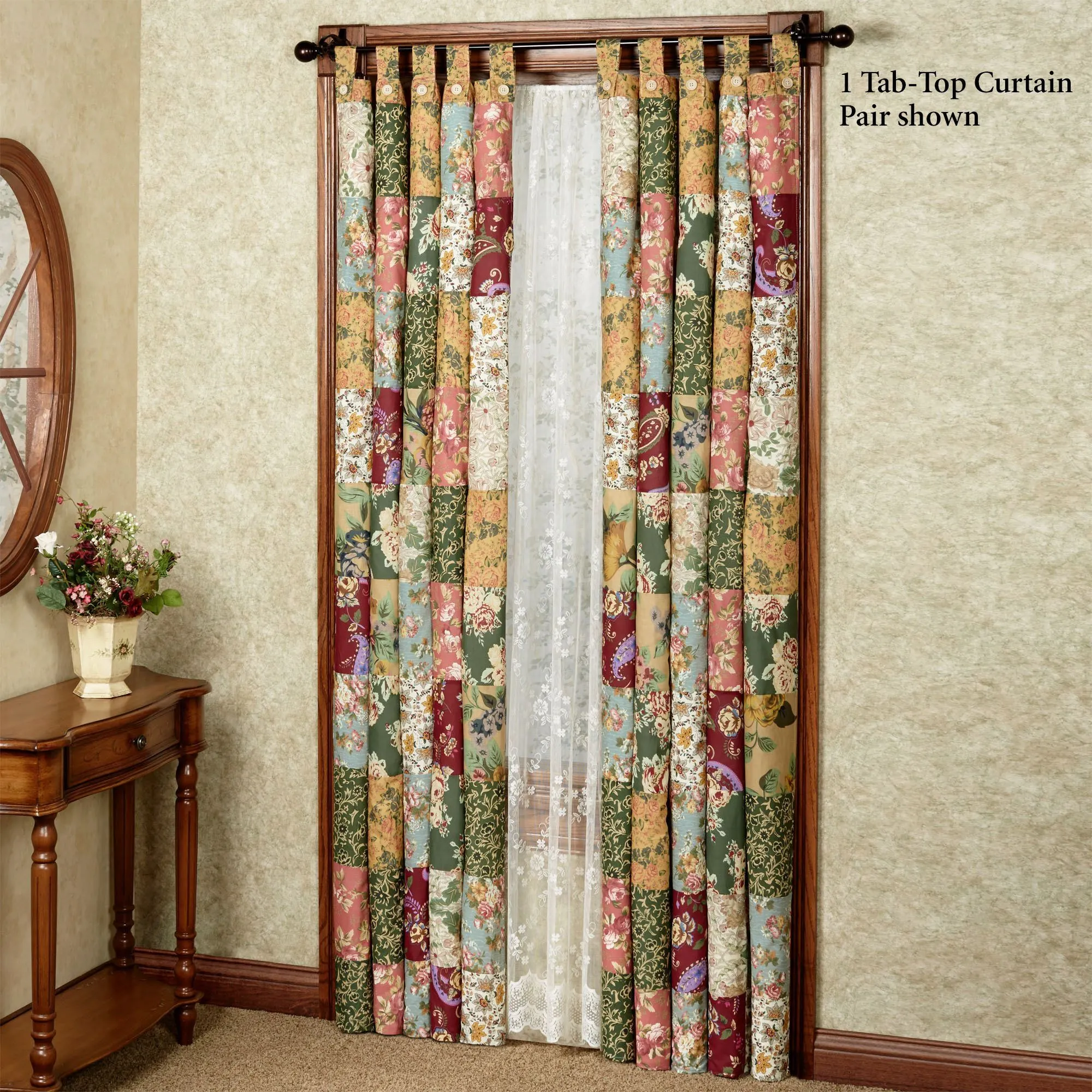 The 100% cotton Antique Chic Tab-Top Patchwork Window Treatment will give your room a charming new look. Window treatment has a patchwork design with floral and paisley prints in colors of rose, green, blue, burgundy, ivory, gold, and chocolate. Lined Tab-Top Curtains have wooden button accents; tiebacks are included. Tab-Top Valance is also available. Window treatment has 3"L tabs. Machine wash. Imported. The curtain pair width is the total width of two panels together.