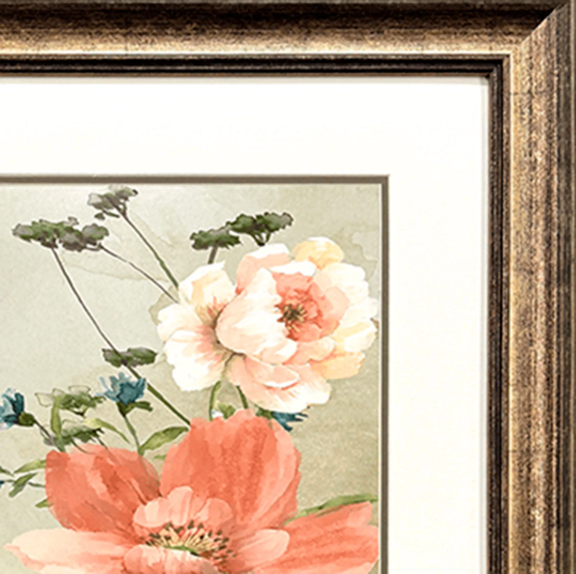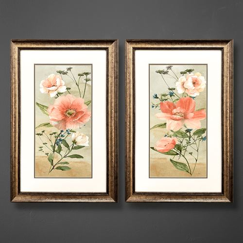 Antique Florals always look beautiful. Each print in this wall art set, from a mixed media original by artist Nan, features blooming flowers and greenery. Colors include shades of coral, cream, beige, and off-white. One print has blue berry accents, and the other has blue floral accents. Floral prints are surrounded by a brown inner mat and a cream outer mat. Polystyrene frames have glass inserts and an antique gold finish. Each measures 22"Wx2"Dx34"H. Set weighs 18 lbs. Imported/USA.