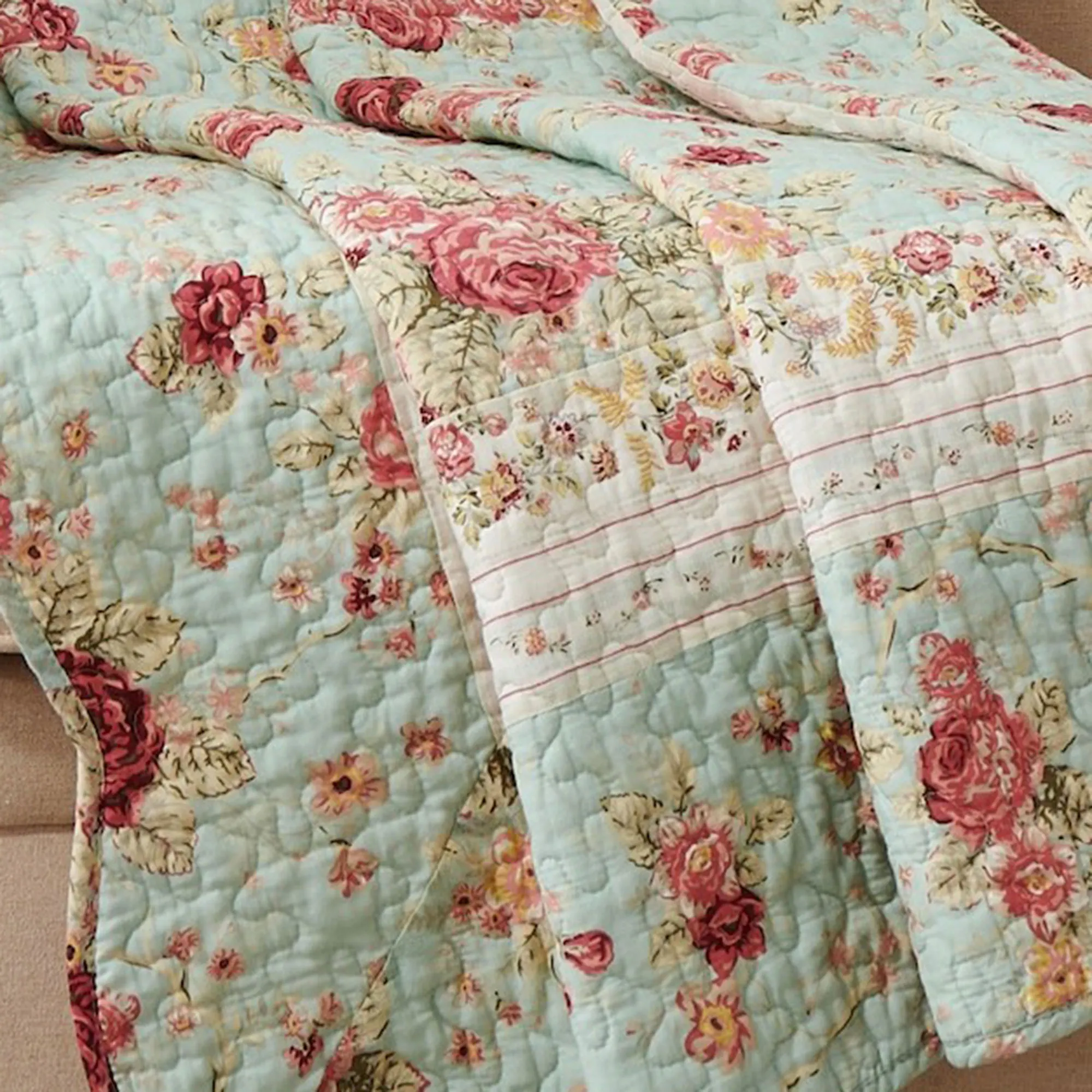 Antique Rose Reversible Powder Blue Floral Quilted Throw Blanket