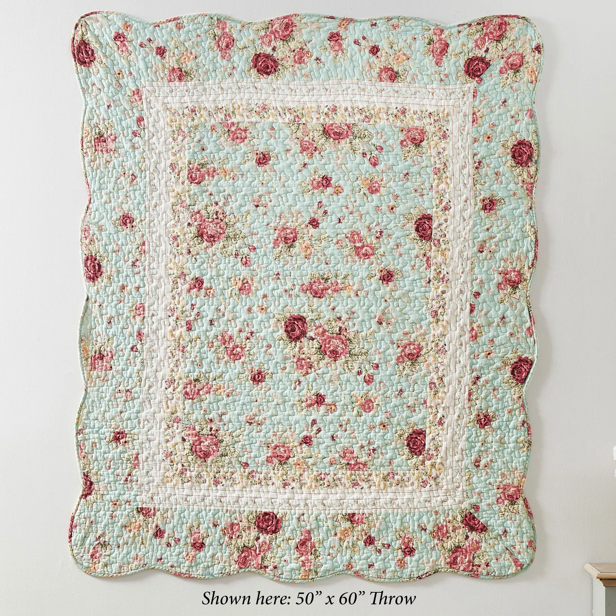 Sweeten any space with the classic beauty of the Antique Rose Floral Throw Blanket. Made of cotton, the pre-washed and preshrunk throw features a printed rose and leaf pattern. Colors include shades of pink, beige, crimson, sage, ivory, and soft powder blue. Pieced throw also has pinstripes, mini florals, powder blue stripes, vermicelli quilting, and scalloped bound ends. Reverse has stripes and mini florals. Throw fill is cotton. Measures 50"x60". Machine washable. Imported.