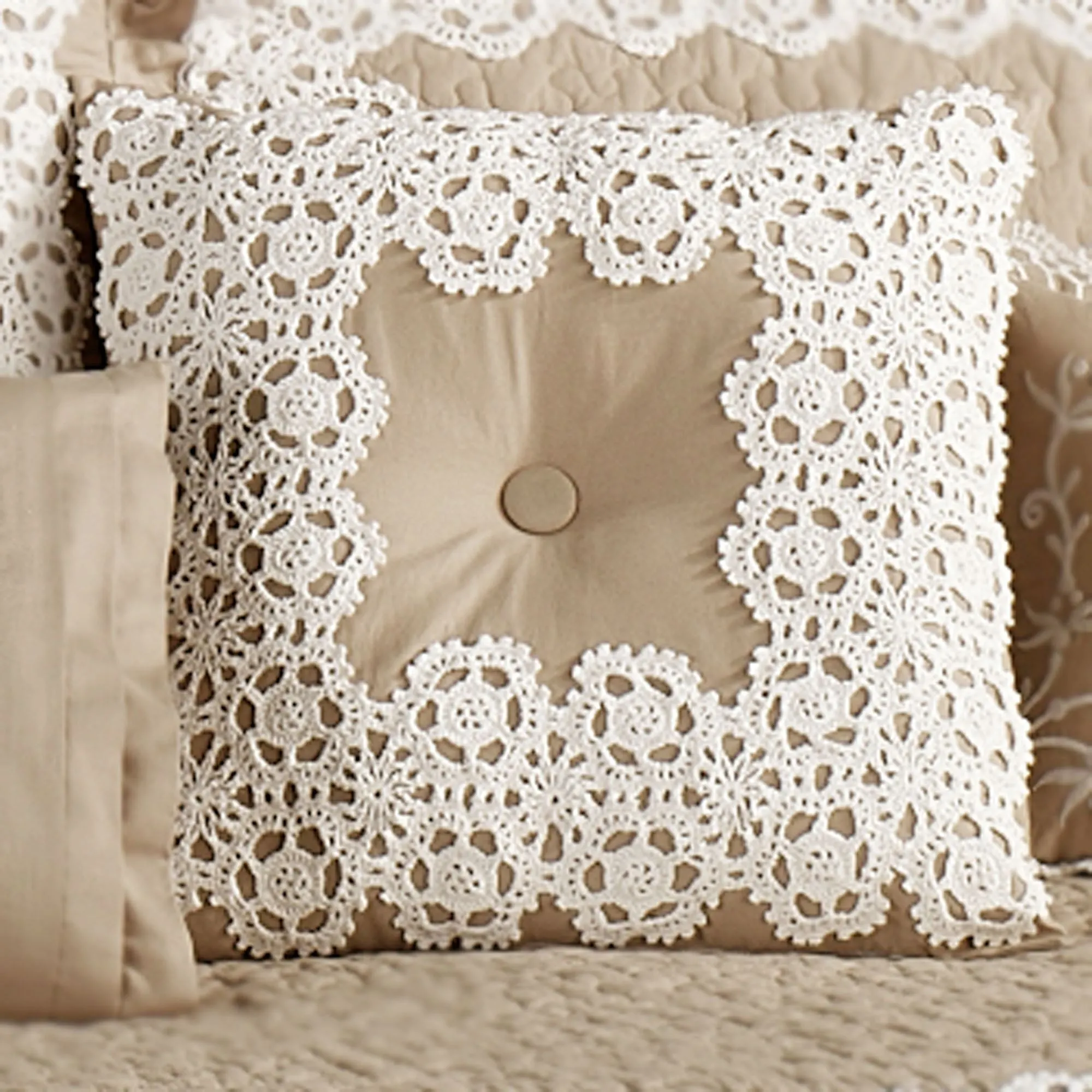 Standard/Queen Sham has a quilted latte center with ivory crochet trim and a ruffled flange edged in mini-crochet; French back closure.