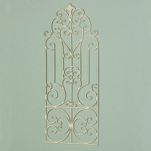 A charming heart, swirling motifs, and a fleur design decorate the Antonello Creamy Gold Wall Grille with elegance. This handcrafted metal wall gate has a handpainted powder-coat finish. Indoor or outdoor year-round use. Decorative wall grille measures 16"Wx40"H.