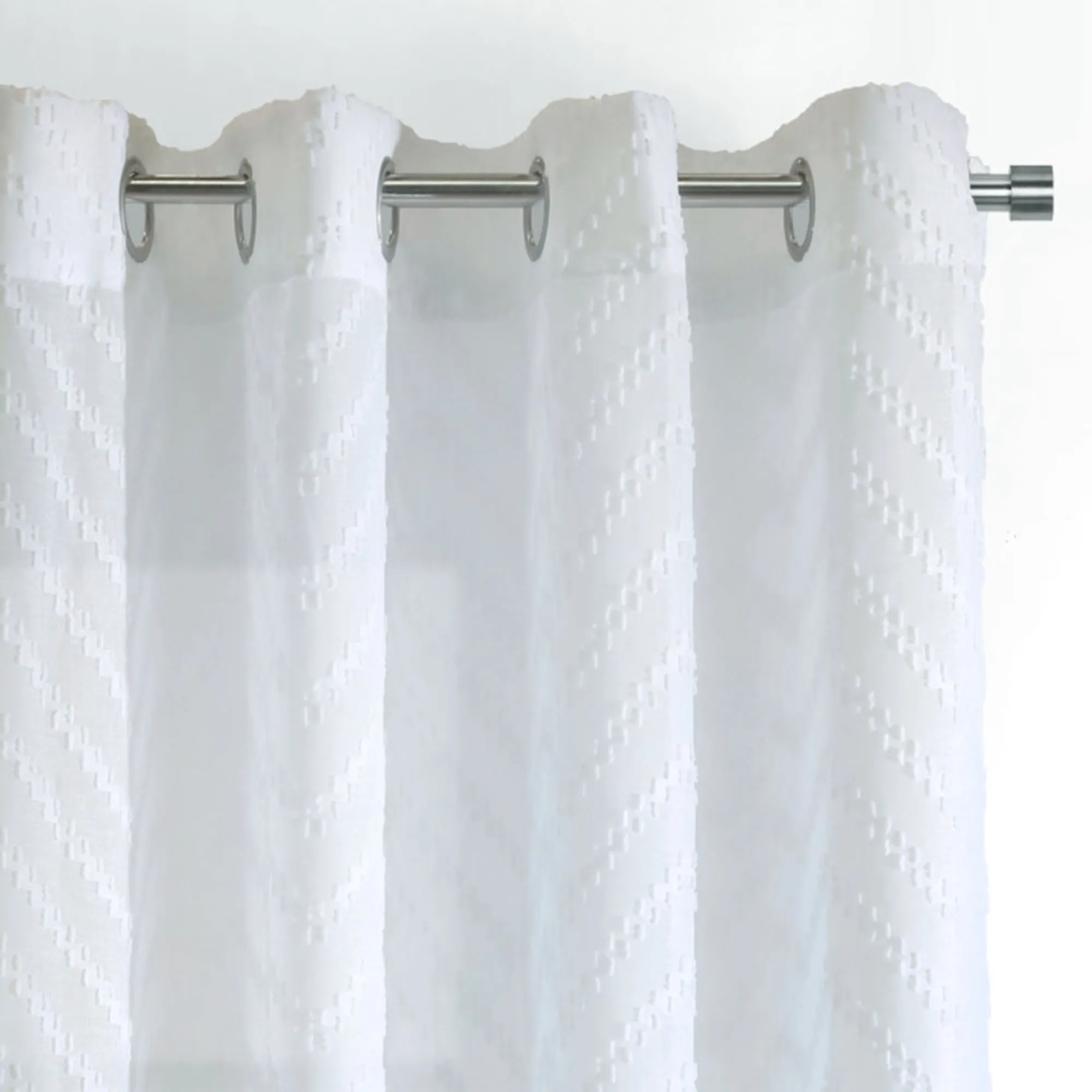 A clipped chevron pattern displays subtle Southwestern style on the Anvers Grommet Curtain Panel. This white, sheer polyester panel has 1.5" dia. metal grommets with a brushed silver finish. Sold individually, each panel is 52"W. Machine washable. Imported.