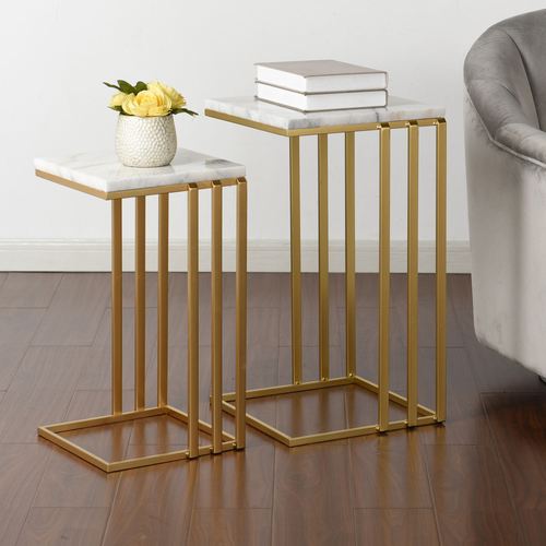 The white and gray marble tops look stunning on the Anya Nesting Table Set. The nesting tables have metal legs with a gold finish. Due to the handcrafted nature of this item, slight variations may occur. Small is 12"Wx13"Dx23"H, and large is 14.5"Wx15.5"Dx26"H. Set weighs approx. 31 lbs.