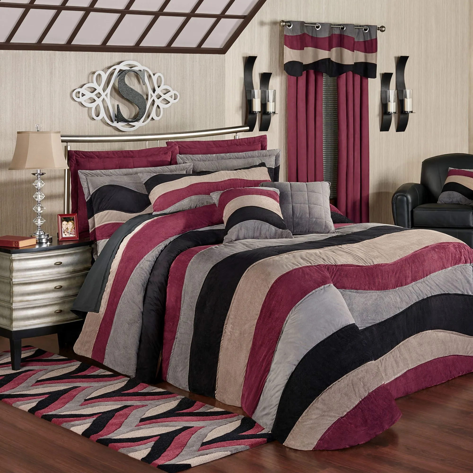 The Apex Bedding draws your attention to the undulating pattern displayed on the soft, microfiber polyester faux suede ensemble. The pieced, wavy horizontal presentation features vibrant colors of claret, onyx, sand, and charcoal that alternate to create a contemporary design.