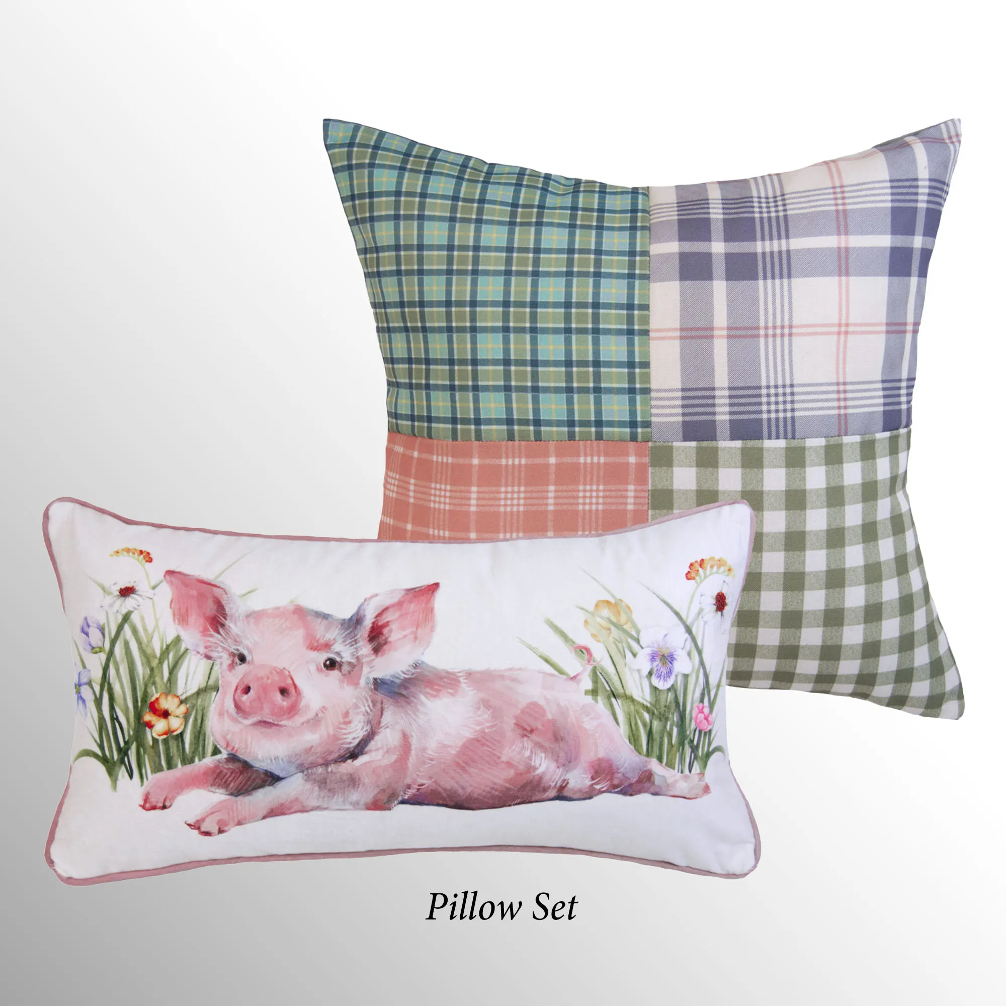 The reversible Pillow Set of Two includes a square pillow and a rectangle pillow. Tailored square pillow is pieced with rose, green, white, and grape plaid blocks. Piped, off-white rectangle pillow has a cute pig lounging among the flowers. Spot clean.