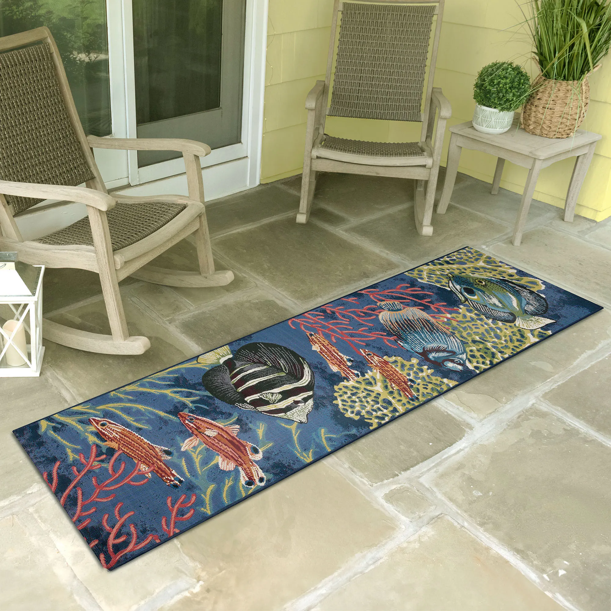 The Aquatic Vista Rug features a pleasant view of tropical fish and other sea life. This power-loomed, polypropylene/polyester area rug, .12" thick, is by Liora Manna and is UV-stabilized for enhanced fade resistance and weather resistance. Ideal for high-traffic areas, the flat-woven, low-profile rug has fish swimming among coral and sea plants. Colors include navy blue, ivory, pale green, peach, salmon, light blue, merlot, and black. Rug may be used indoors or outdoors seasonally; do not expose this rug to freezing temperatures. Spot clean and rinse with a garden hose; for stubborn stains, we recommend professional cleaning by a rug cleaner. Imported.