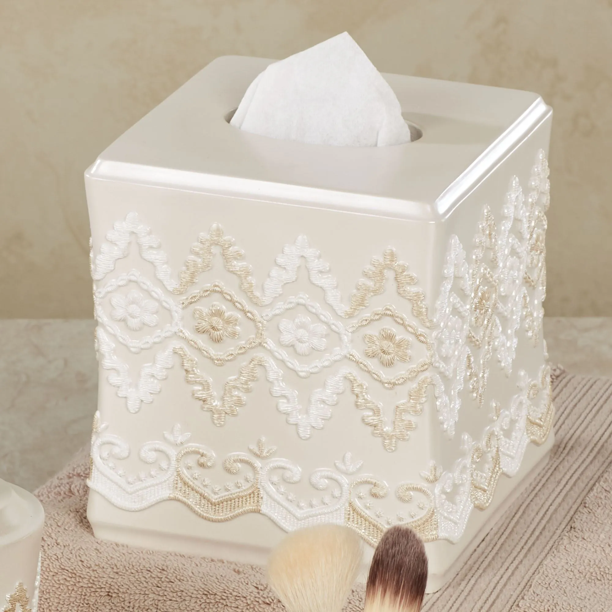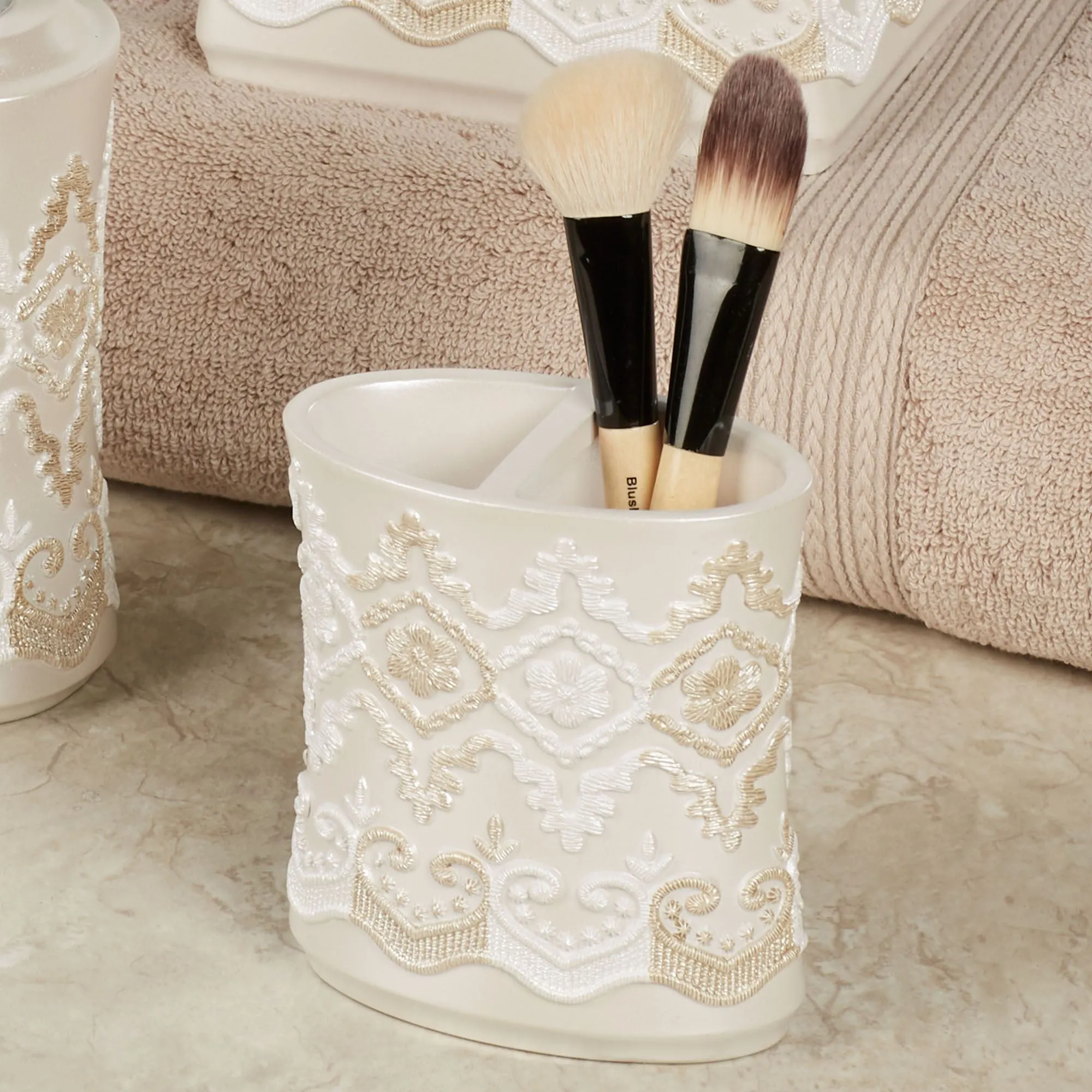 Shimmering elegance refines the Arabella Bath Accessories with a fine grace and poise. Handpainted in white and honey, dimensional medallions, scrollwork, and floral motifs decorate the shaped ecru resin grounds. The Brush Holder can be used to hold your toothbrushes or makeup brushes. Specify Brush Holder, Lotion/Soap Dispenser, Soap Dish, Tissue Cover, or Wastebasket.