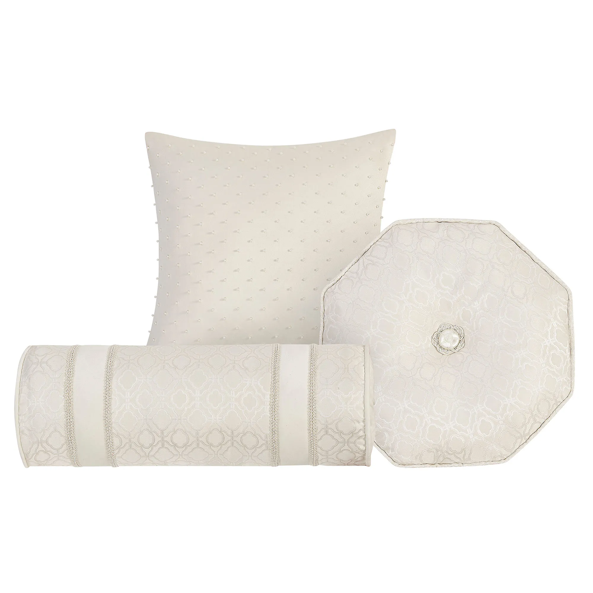 The Pillow Set of 3 includes a neckroll, an octagon, and a square. Spot clean. The piped neckroll has woven medallions, solid ivory bands, and gimp trim; ends have a button tuft and ball tassel accents. Piped octagon has woven medallions, a button tuft, and a 3" gusset; reverse is ivory velvet. Tailored square is solid ivory polyester satin with faux pearl accents.