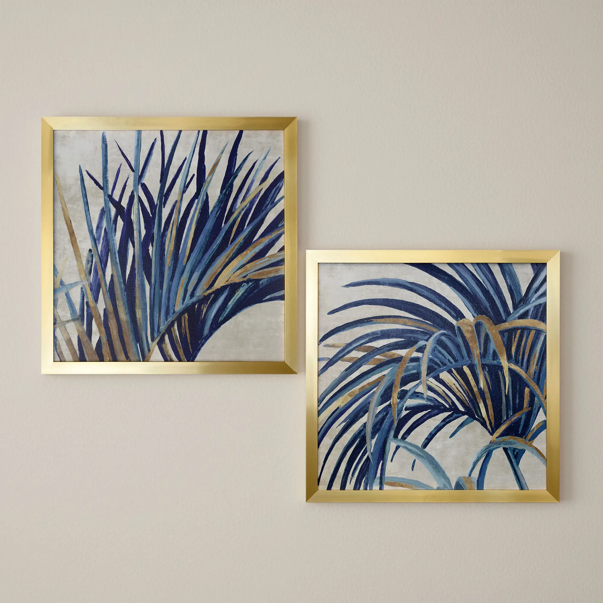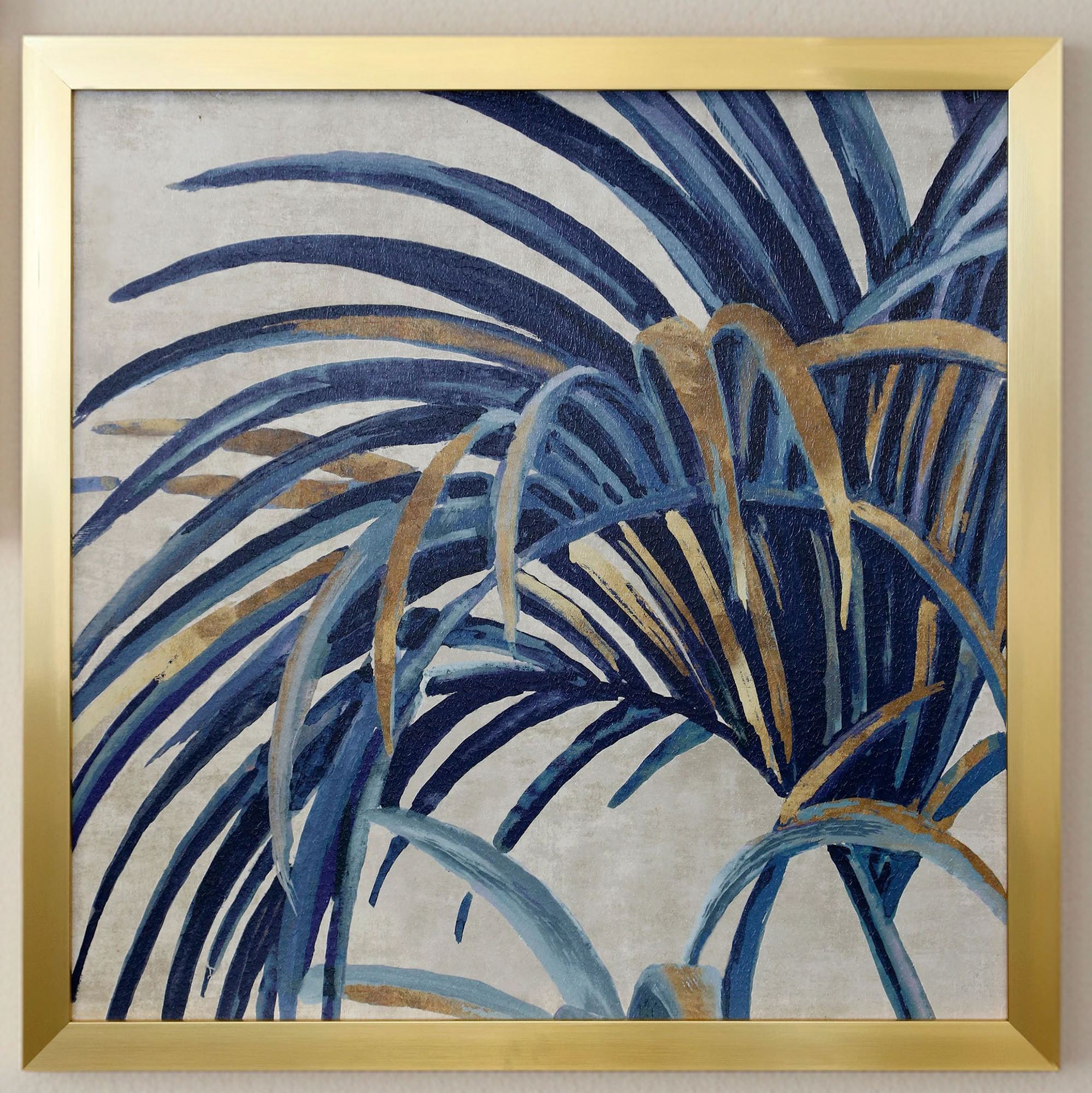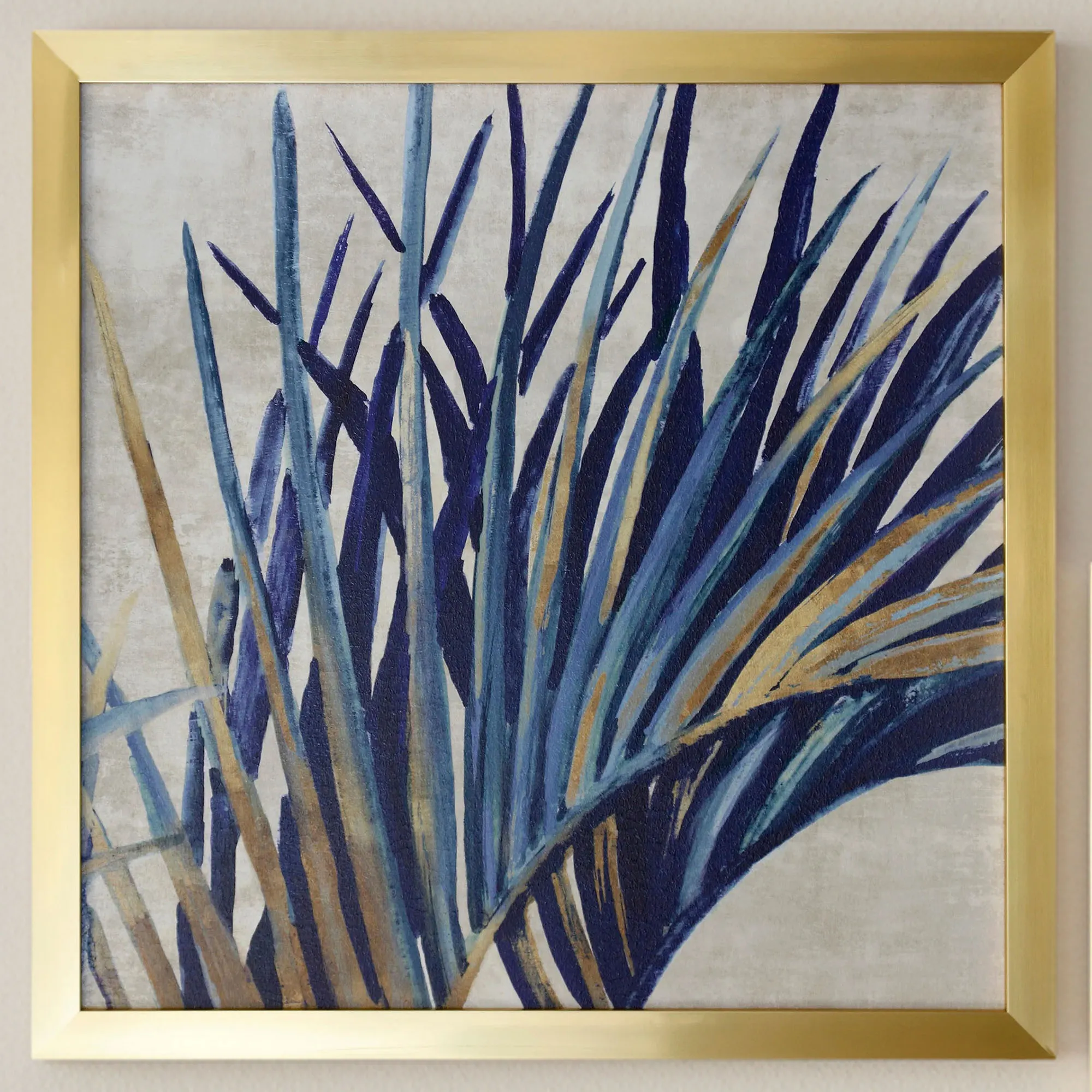 Arching Palm Fronds sway in the gentle tropical breeze. Each textured paper print features blue palm fronds with light blue and gold accenting and a gel coating. Palm I reaches to the right. Palm II reaches to the left. The outer polystyrene frame is gold. Measures 33"sq.x2"D.