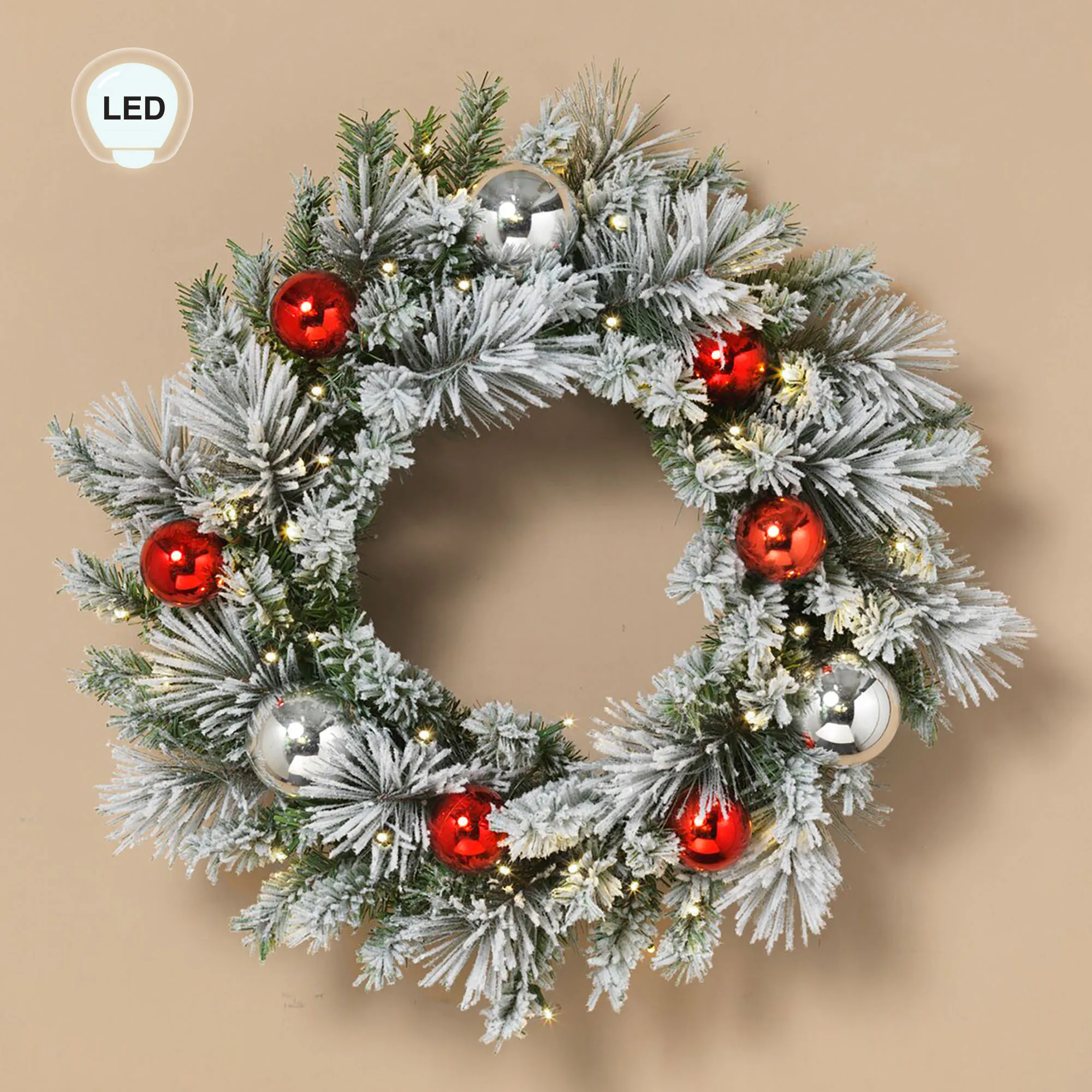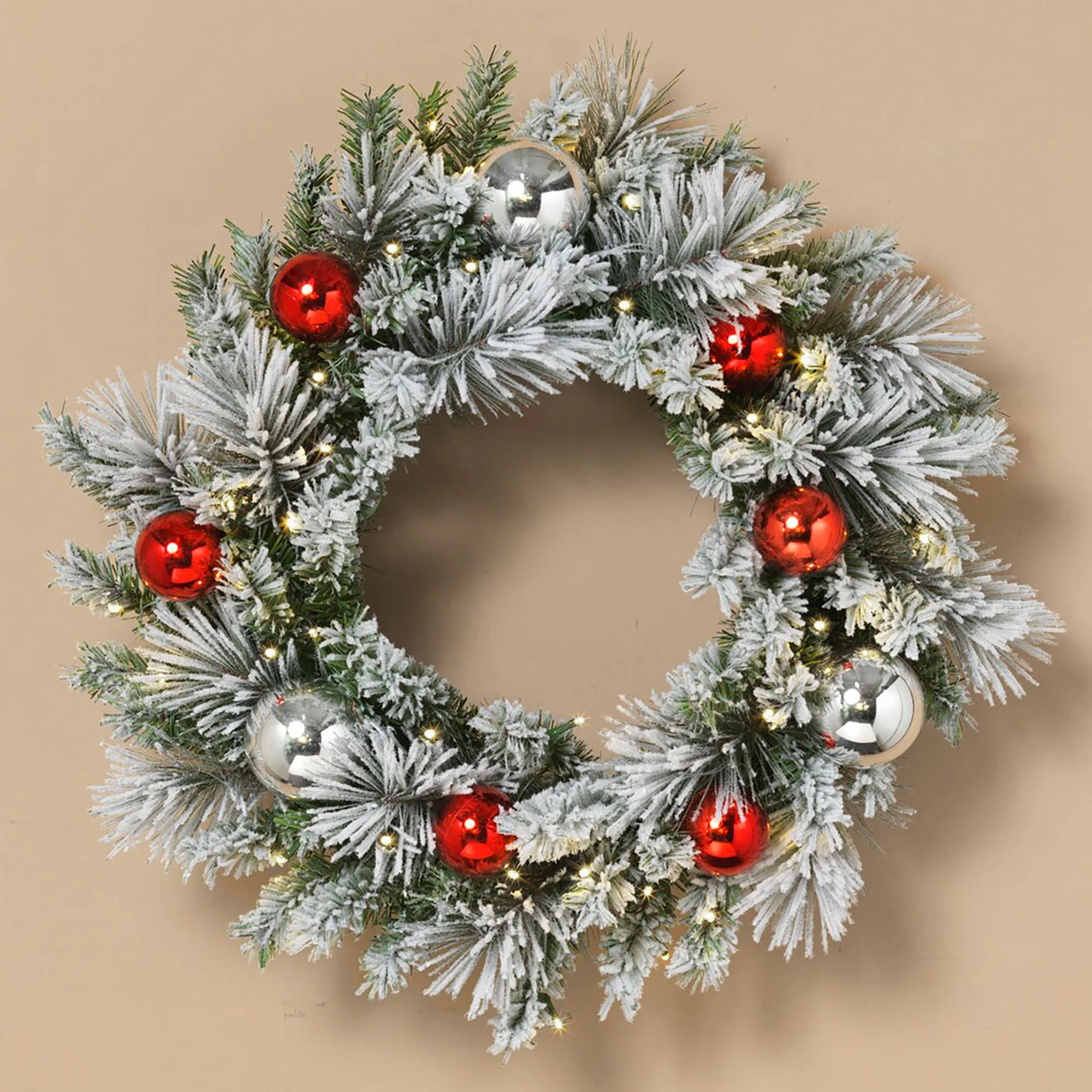 Hang the Arctic Frost Lighted Wreath for a beautiful winter seasonal display. This flocked white wreath features faux pine greenery, shiny red and silver ornaments on a wire metal base, and 30 LED lights that shine brightly when lit. Requires three AA batteries, not included. The built-in six-hour timer and off switch is located on the battery pack. Wreath may need to be fluffed after removing from the box. Indoor or covered outdoor use. Measures approx. 23"dia.x6.5"D.