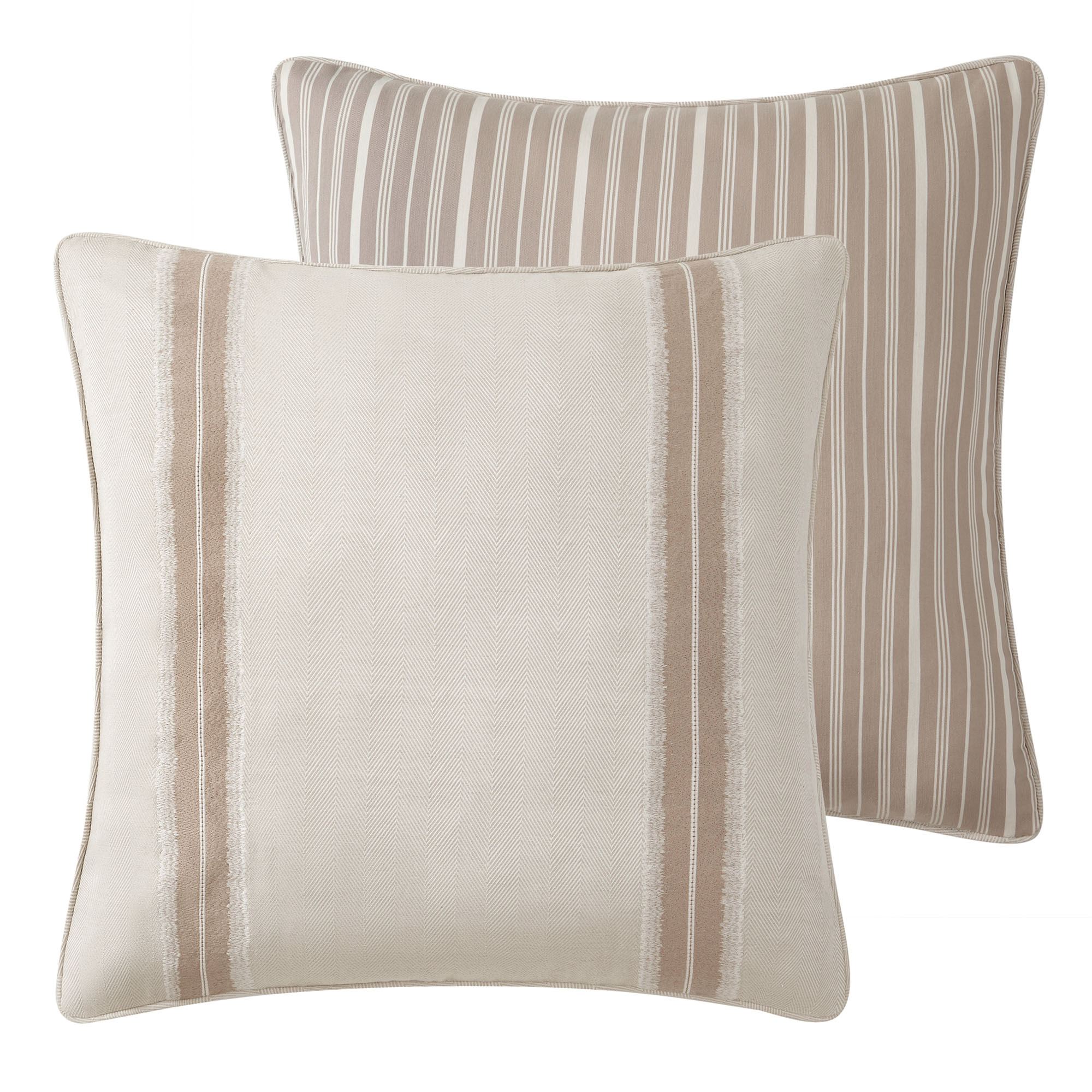 The piped European Sham has a woven herringbone design, almond stripes, ivory embroidery, and a zipper closure; reverses to a woven stripe design.