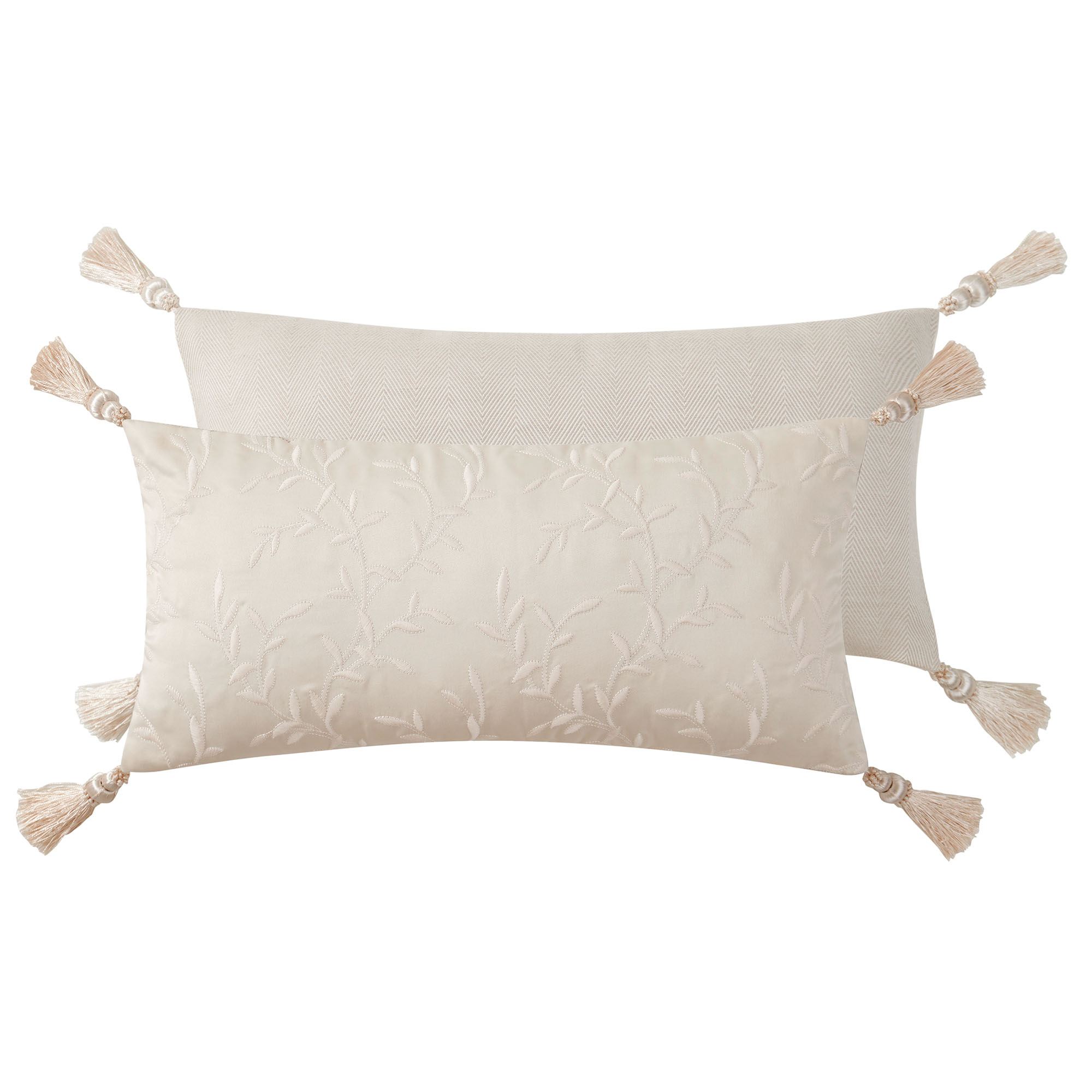 Pillows: Spot clean. The tailored, solid ivory Rectangle has leaf embroidery and corner tassels; reverses to a woven herringbone design. The 16" Geometric Square has textured, woven geometric designs, puckered and shirred ivory accents, gimp trim, and ball tassels; reverses to textured, woven geometric designs with puckered ivory accents. The piped 20" Banded Square has a woven herringbone design, a center band, and embroidery; reverses to woven herringbone designs.
