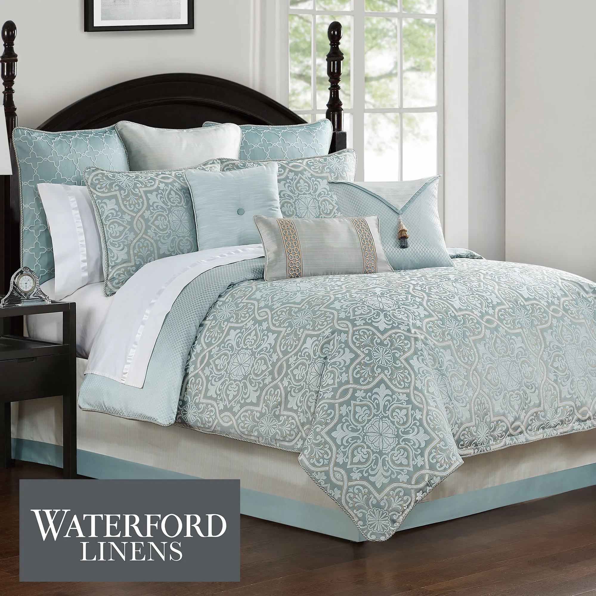 Medallions with delicate leaf accents blend beautifully upon the elegant Arezzo Bedding. This polyester ensemble, by Waterford(R) Linens, has ornate woven-jacquard designs and includes sophisticated shades of gold, ivory, and spa.