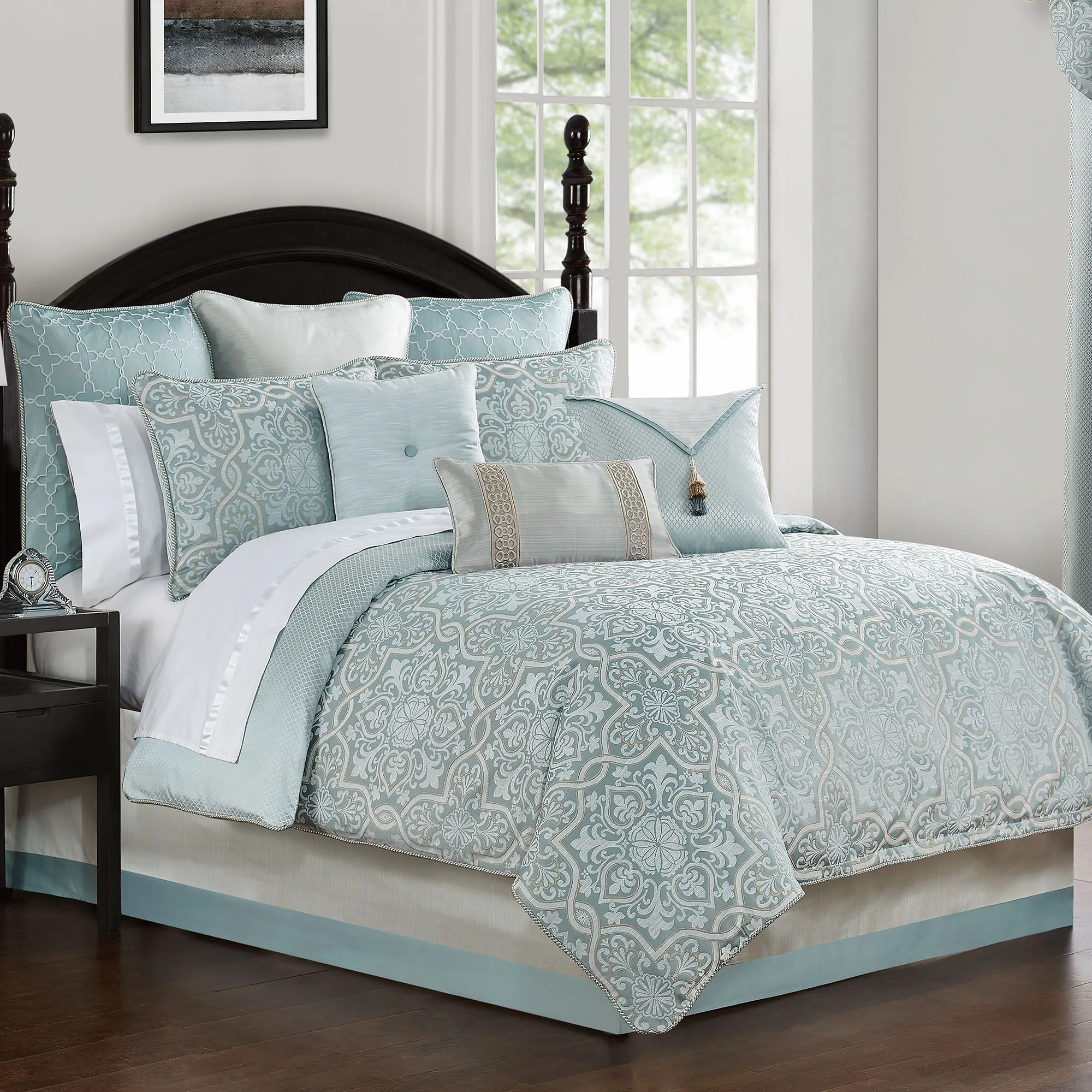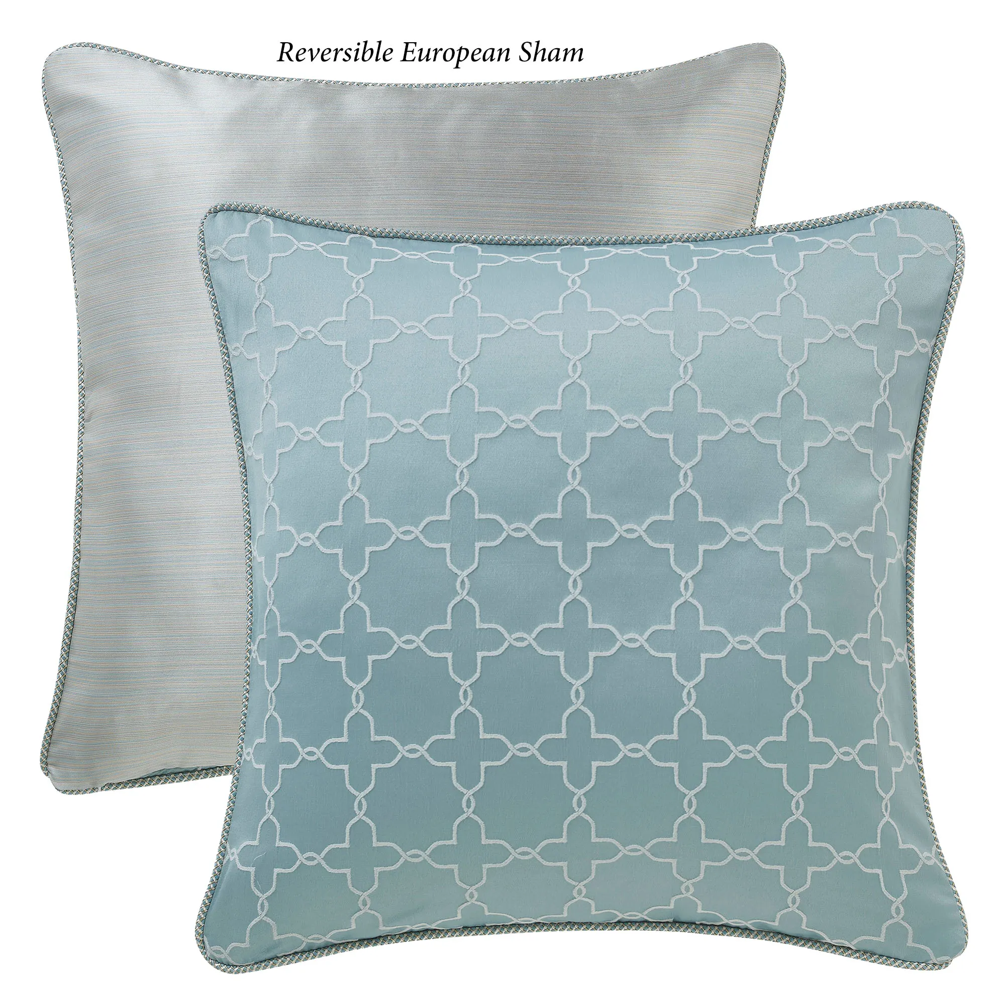 Oversized comforter fits mattresses up to 15". Comforter has ornate designs and twist cording; reverse has geometric designs. The tailored, pieced bedskirt is striated ivory and spa and has split corners in the 16" drop. Corded European shams have ivory embroidered medallions on spa; reverse has spa and gold striations; zipper closure. Corded shams mimic the comforter; zipper closures.