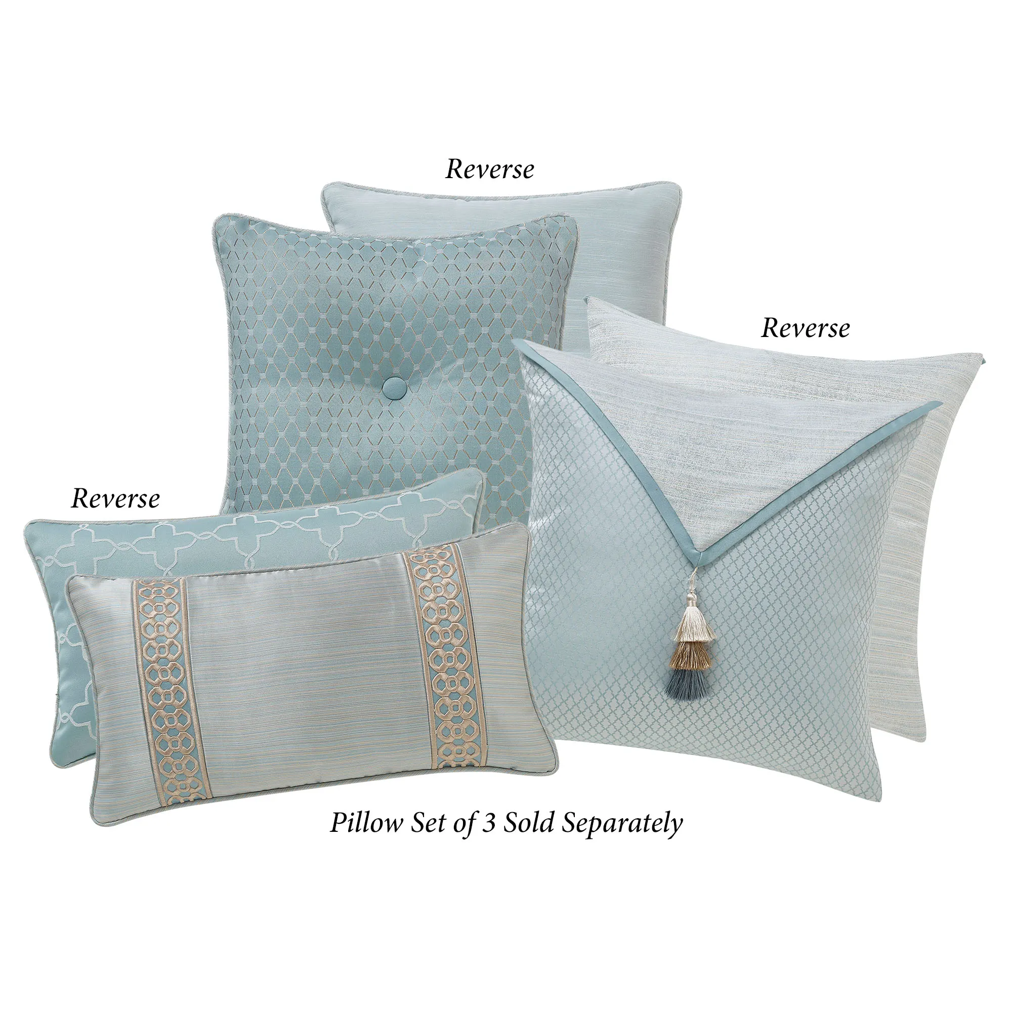 Pillow Set of 3 includes a rectangle pillow and 2 square pillows. All have zipper closures; spot clean. Piped rectangle has gold and spa striations pieced with solid spa bands and gold embroidery; reverses to ivory embroidered medallions on spa. Piped square has diamond designs, a button tuft, and a spa and gold striated reverse. Tailored square has an envelope-style flap with solid spa banding, striations, and tassels on geometrics; reverses to spa and gold striations.