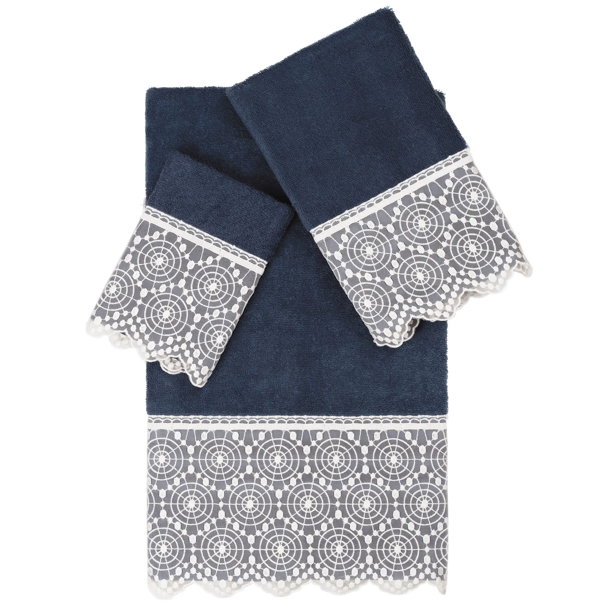 The decorative motif on the Arian Lace Bath Towel Set is intriguing. These super-absorbent and quick-drying towels are made from premium Turkish cotton and have 500 GSM. Towels feature an elegant circle design embroidered on organza lace and have scalloped edges. These super-soft towels and washcloth are durable and keep their plush appearance after washing. Specify Light Cream, Dark Gray, Light Gray, Midnight Blue, Teal, Tea Rose, or White. Light Cream and White have cream organza lace; all other colors have ivory organza lace. The three-piece towel set includes one bath towel, 27"x54"; one hand towel, 16"x30"; and one washcloth, 13" sq. Machine washable. Imported/USA.